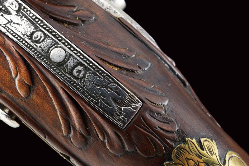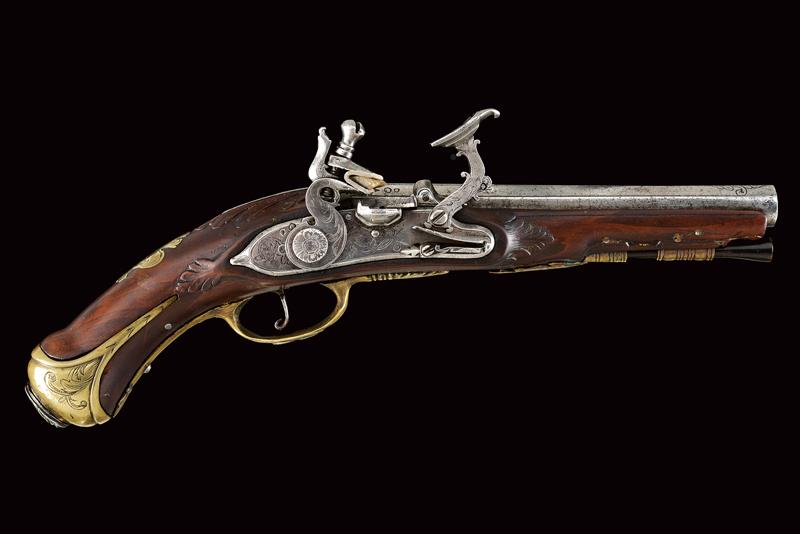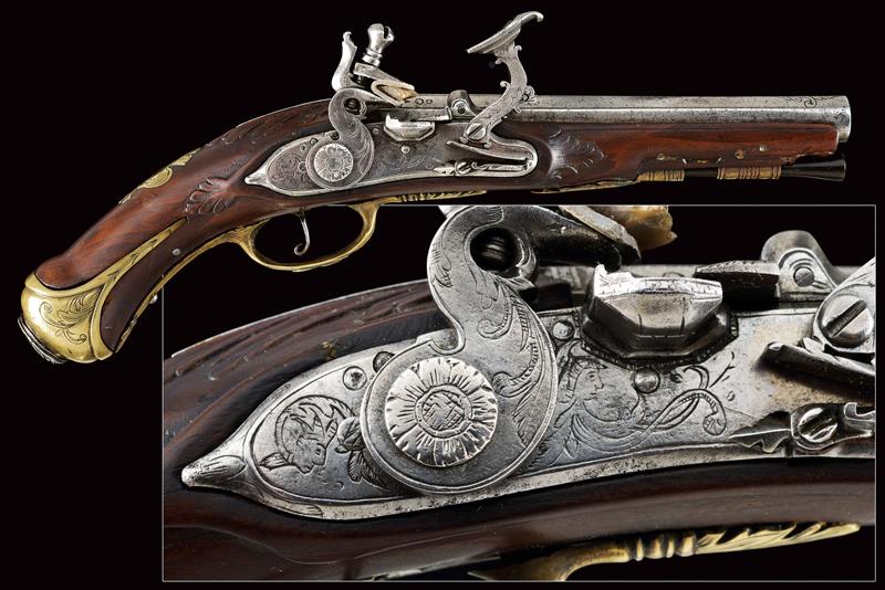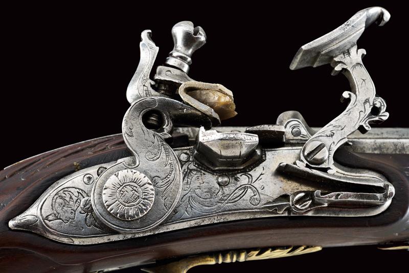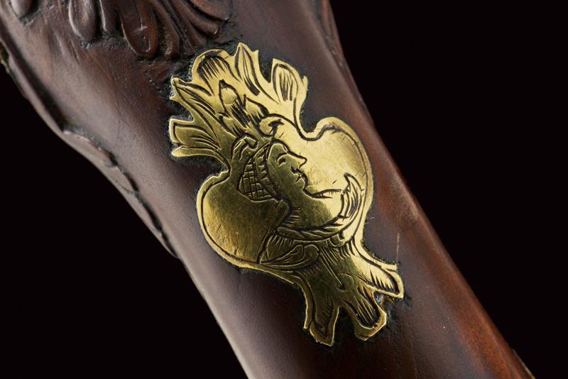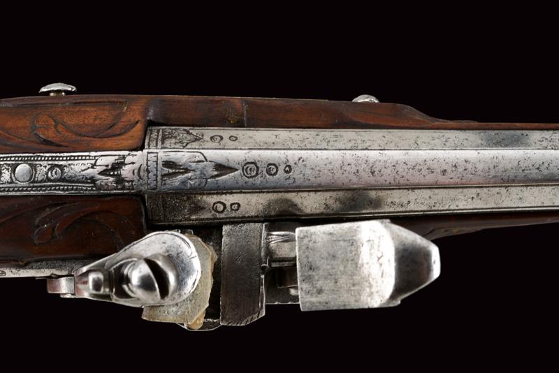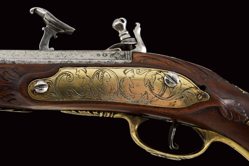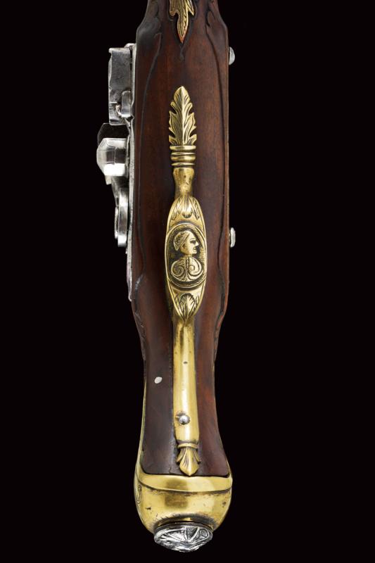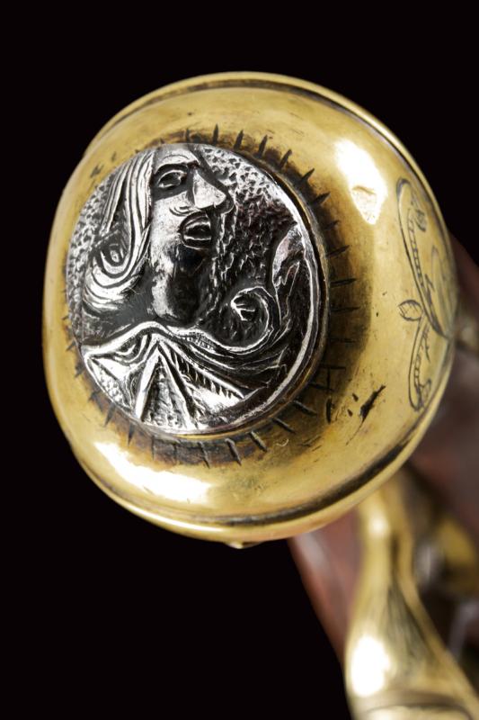 Pistola alla fiorentina, datazione: XVIII Secolo provenienza: Area Tosco-Emiliana, Canna liscia ottagonale, con piccole incisioni alla base e in volata, e ornata a delineature, cal. 12 mm. Il codolo con incisione a cornicetta. Batteria a cartella piatta con bordi scantonati e incisioni a grottesche. Meccanica funzionante. Cassa intera in legno con fornimenti in ottone. La coccia con cammeo in rilievo in ferro e incisioni floreali, un cammeo anche al ponticello, in ottone. La contropiastra con busto muliebre inciso fra grottesche. Bacchetta in corno con cavastracci in ferro. lunghezza 18,5 cm.