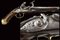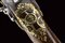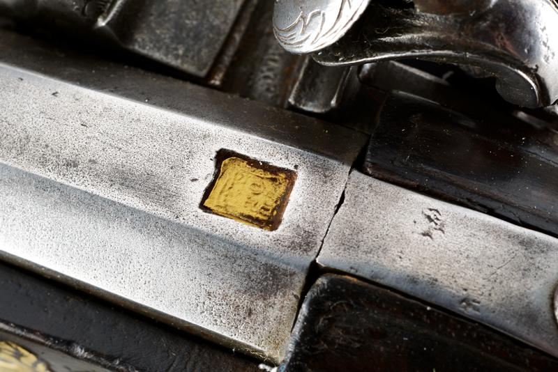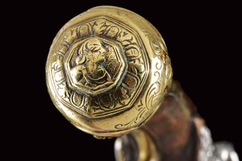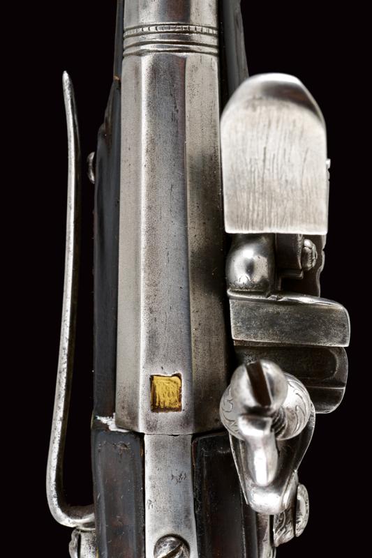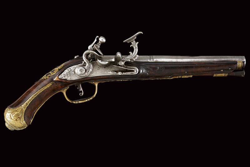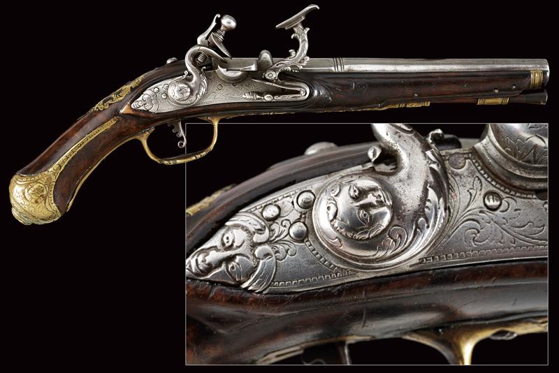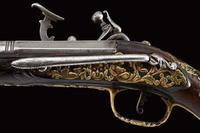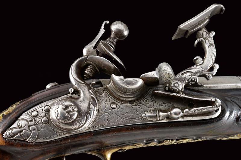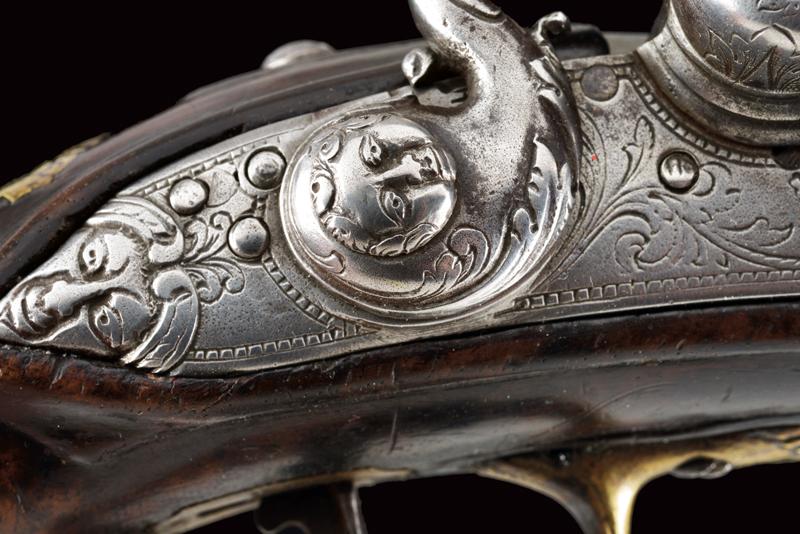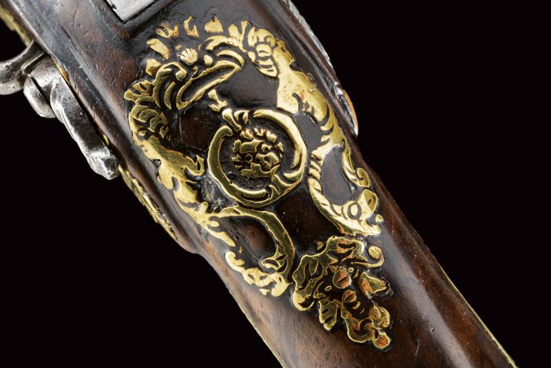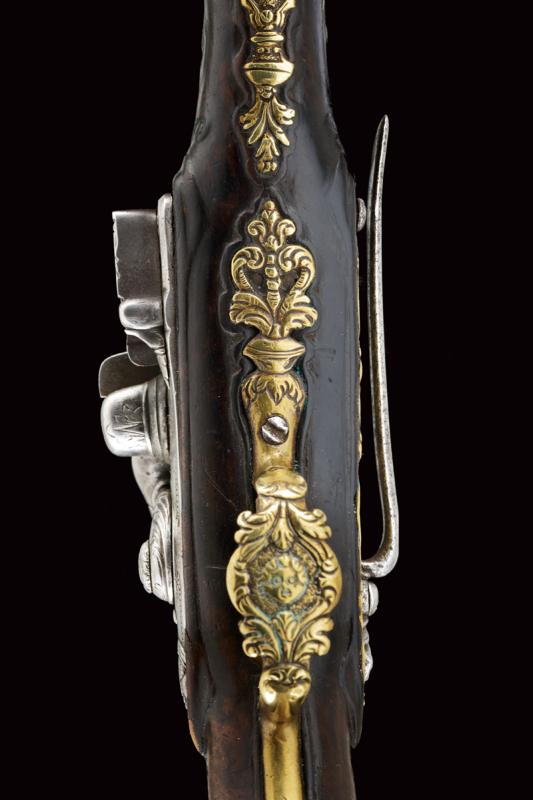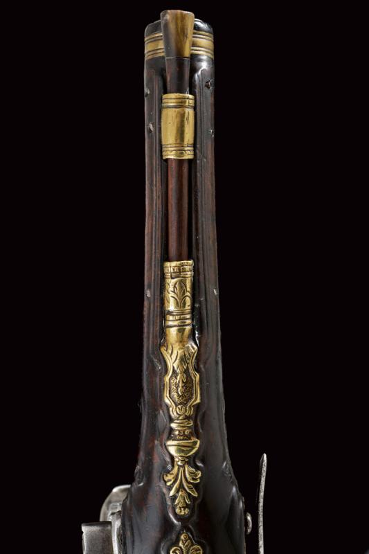 Elegante pistola 'terzetta' alla fiorentina, datazione: Seconda metà del XVIII secolo provenienza: Area Tosco-Emiliana, Canna liscia a due ordini, ottagonale e tonda, con punzone rimesso in oro alla base (non chiaramente leggibile), anellature al cambio e cal. 12 mm. in volata. Batteria a pietra alla fiorentina di gusto emiliano, con bei mascheroni alla base del cane e sulla codetta, entrambi in rilievo. Collo della martellina e del cane con ricci intagliati e traforati, la cartella incisa con cornicette e a fiorami. Meccanica funzionante ma il cane non sta in monta. Cassa intera in legno con piccolo restauro accanto alla batteria e resti di intagli a volute. Fornimenti in ottone. Coccia con mascherone con profilo di dama in rilievo al centro e mascheroni sui fianchi. Ponticello riccamente elaborato con mascherone e fiorami. La contropiastra intagliata e traforata a grottesche, munita anche di gancio da cintura in ferro. Traforato anche lo scudetto dorsale. Bacchetta in legno con battipalla in corno bruno e cavastracci in ferro. Cfr: vedi un esemplare simile in 'Armi da Fuoco Italiane' di A. Gaibi (Bramante Ed, Milano). Foto 595-596. lunghezza 30 cm.