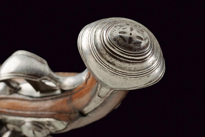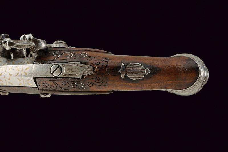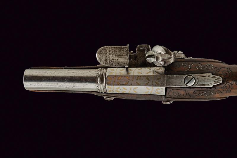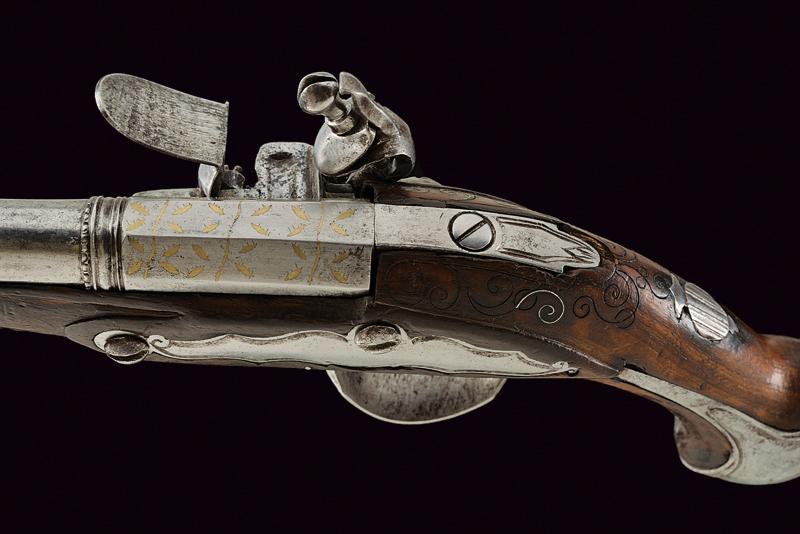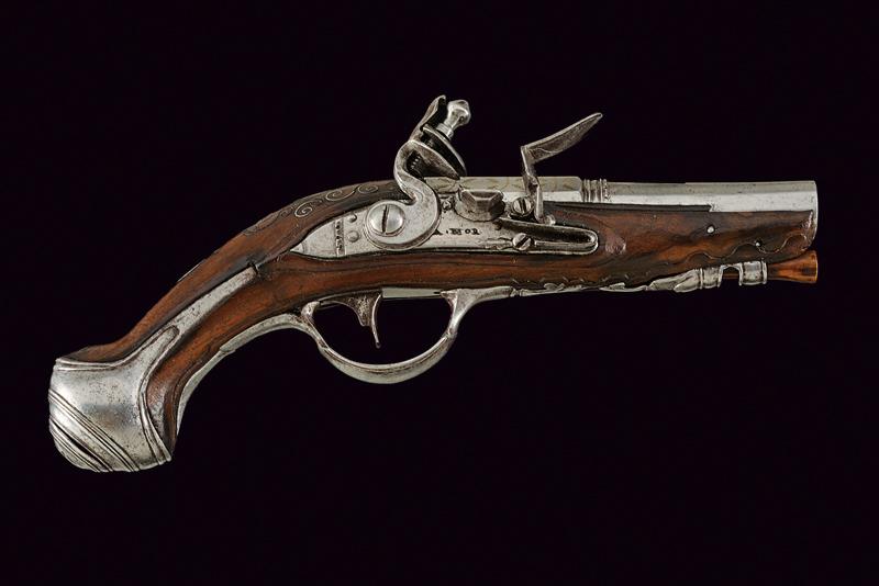 Pistola da viaggio a pietra focaia, datazione: XVIII Secolo provenienza: Italia del Nord, Canna a due ordini, ottagonale e tonda; il primo segmento con agemine dorate a foglie, al cambio sottili anellature, la volata leggermente strombata. Cal. 12,4 mm. Batteria a cartella piatta firmata 'A. MOR'. Meccanica funzionante. Cassa intera in legno con resti di agemine a volute al dorso. Fornimenti in ferro con delineature. Bacchetta in legno. Probabilmente si tratta di Moretti Antonio (VI) armaiolo bresciano della seconda metà del XVIII secolo. Vedi 'Repertorio Storico degli Archibugiari Italiani' di B. Barbiroli, pag. 377. lunghezza 18,5 cm.