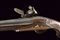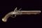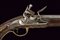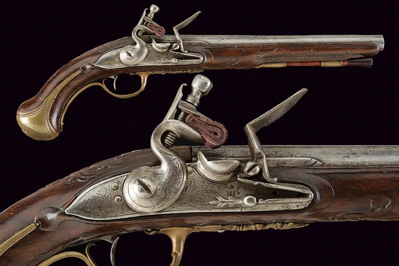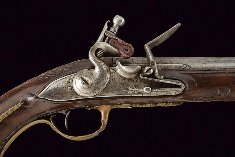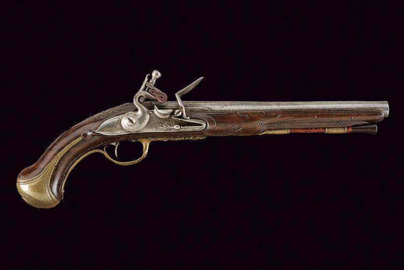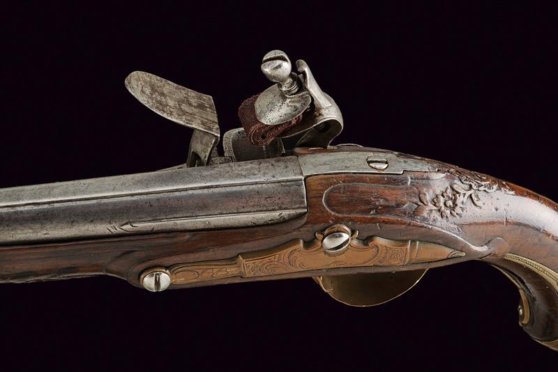 Pistola a pietra focaia, datazione: fine del XVIII Sec. provenienza: Francia, Canna tonda liscia, con bindella dorsale per quasi tutta la lunghezza (piccola riparazione su un lato?). Cal. 15 mm. Batteria a cartella leggermente tondeggiante, delineata e incisa a racemi, recante la sigla 'F.N.' e 'III6'. Inciso anche il collo del cane. la meccanica funzionante. Cassa intera in legno con intagli floreali. Fornimenti in ottone con belle incisioni a rocaille e fiorami. bacchetta in legno con battipalla in corno bruno. lunghezza 38 cm.