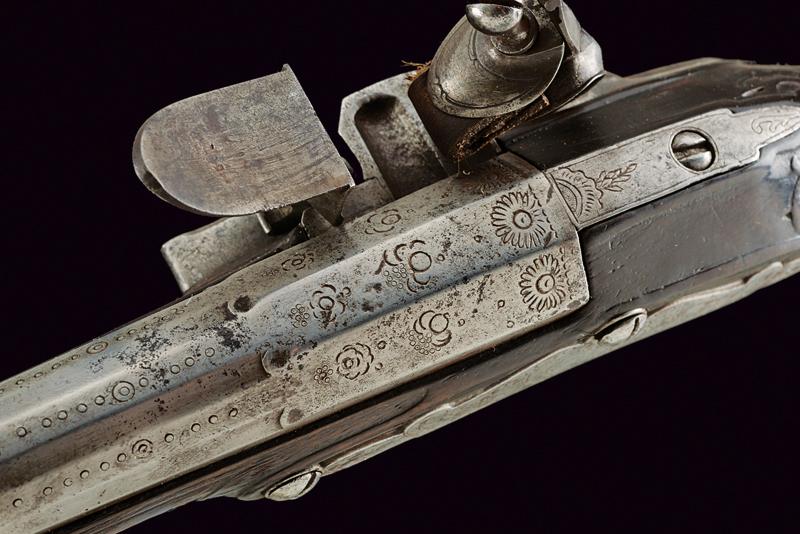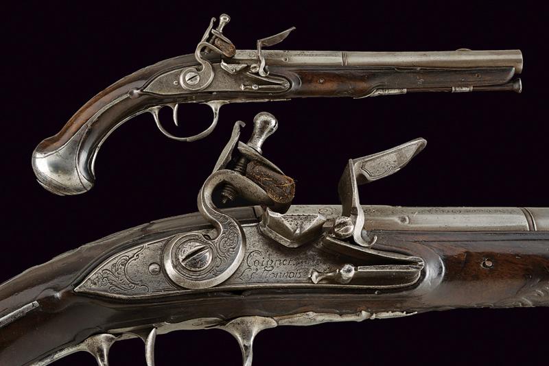 Interessante pistola da ufficiale mod. 1763 di Le Lionnais, datazione: Seconda metà del XVIII secolo provenienza: Francia, Canna liscia a tre ordini, ottagonale, faccettata e tonda, con incisioni a fiori, dotata di mirino, cal. 15,4 mm. Codetta incisa. Batteria con piccole incisioni a rocaille e firma 'Coignet Le Lionnais'. Cassa intera in legno (un piccolo tassello mancante). Fornimenti in ferro. Bacchetta in legno con battipalla in ferro. Vedi una pistola molto simile nella nostra asta n. 105 (lotto 672), da ufficiale dei cavalleggeri mod. 1763, con medesima firma (non chiaramente leggibile) 'Coignet Le Lionnais', marcata sulla canna 'Chevaux Lege', proveniente dalla collezione R. Brooker. Molto probabilmente in questo caso si tratta di una versione fuori ordinanza di tale pistola prodotta dalla stessa manifattura. lunghezza 36,5 cm.