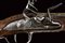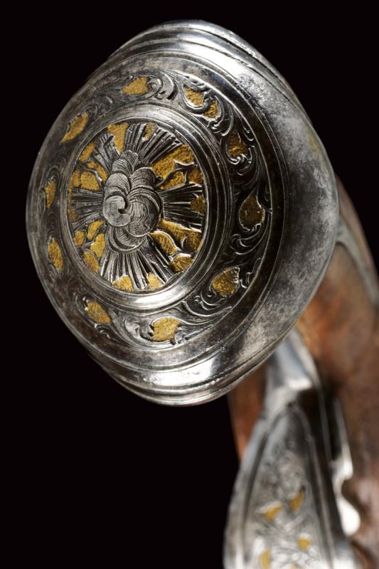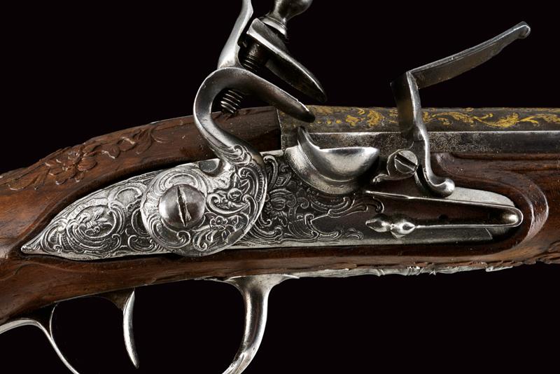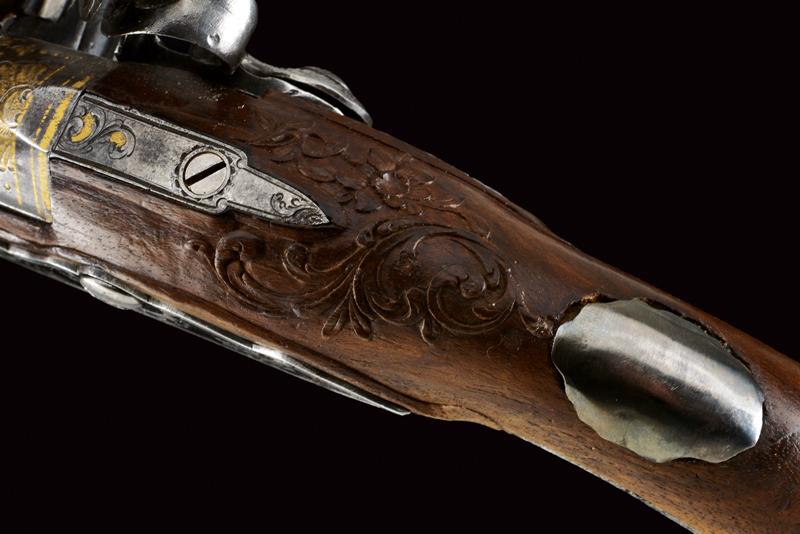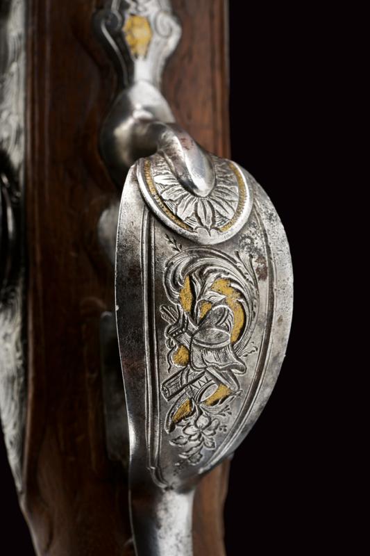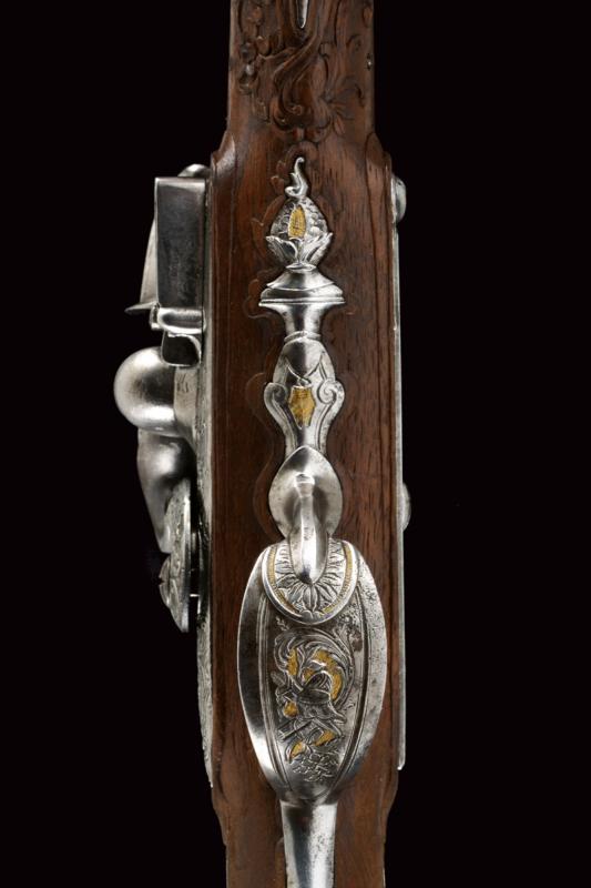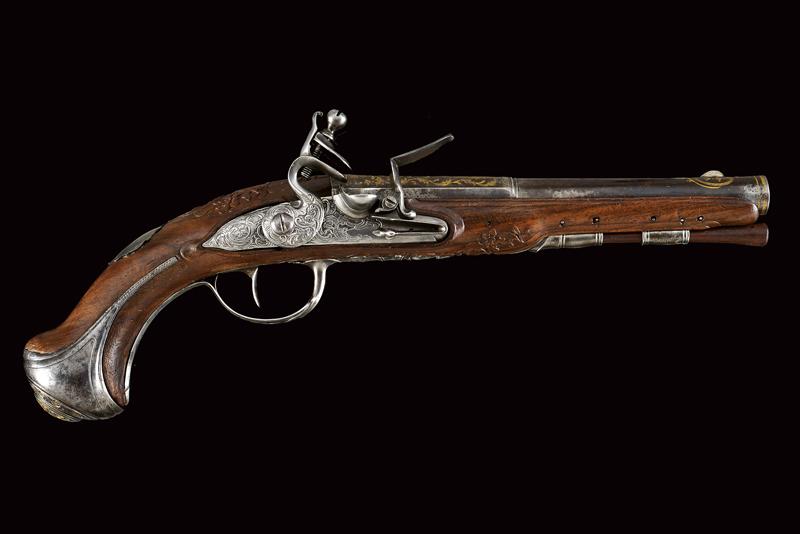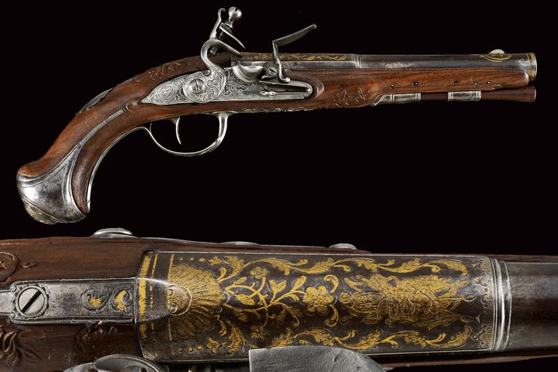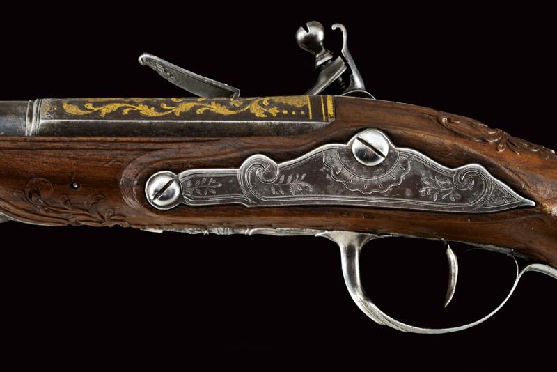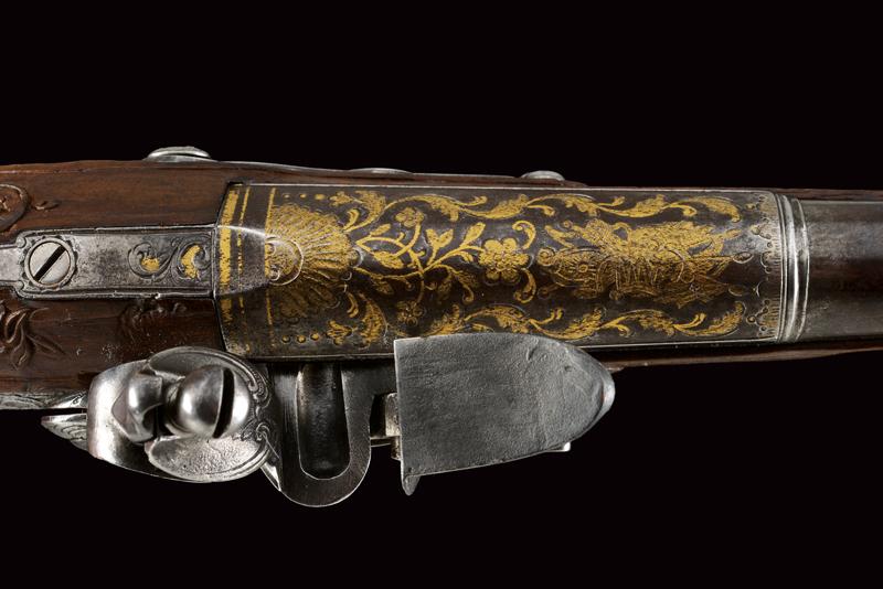 Bella pistola a pietra focaia, datazione: XVIII Secolo provenienza: Francia, Canna liscia a due ordini, la base tonda con lati quadri, dopo un anello tonda, incisa e dorata su fondo blu a trofei e motivi floreali nello stile di St. Etienne, mirino, cal. 15 mm; codetta incisa dorata. Batteria a pietra focaia riccamente incisa a motivi floreali in bassorilievo. Cassa intera in legno leggermente scolpita a motivi floreali, con fornimenti in ferro parzialmente incisi e dorati. Lo scudetto sul dorso probabilmente di ricambio. Bacchetta in legno. lunghezza 33 cm.