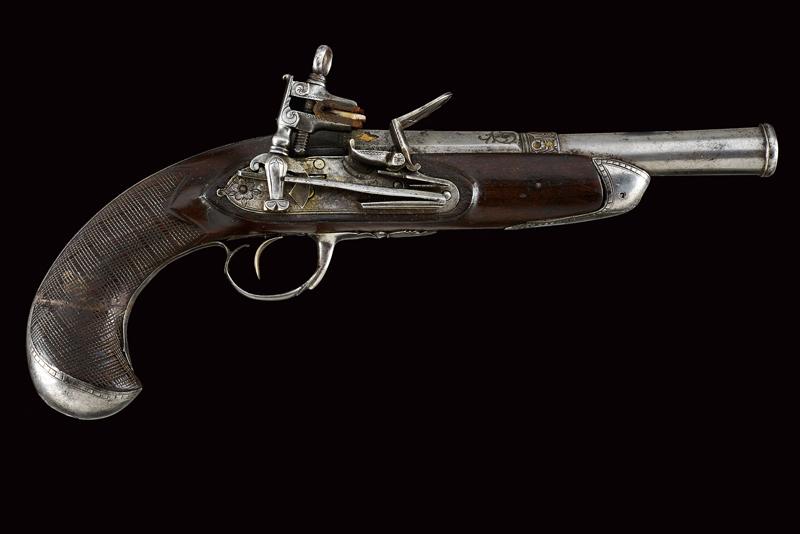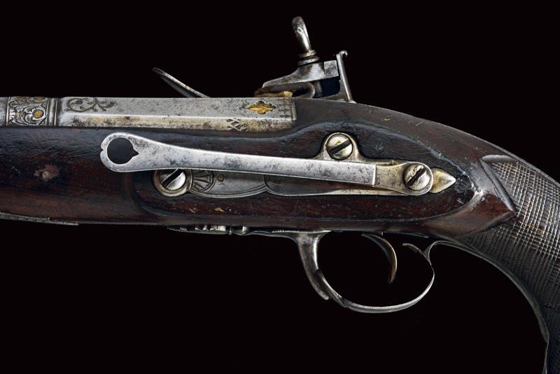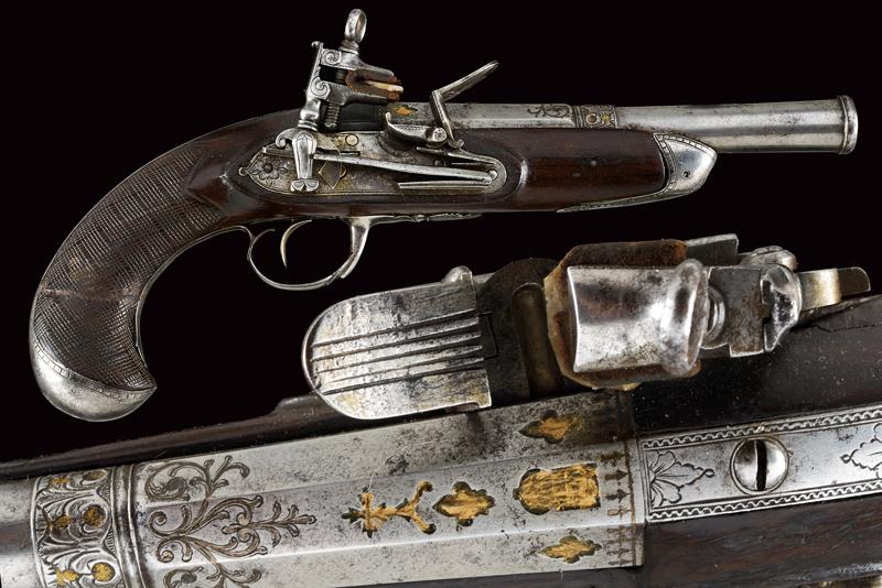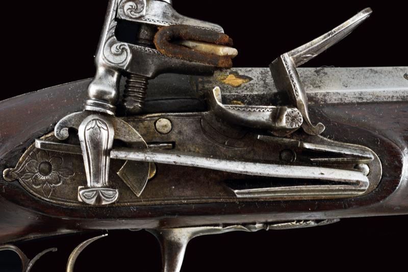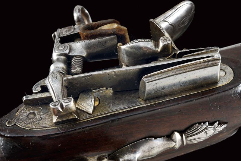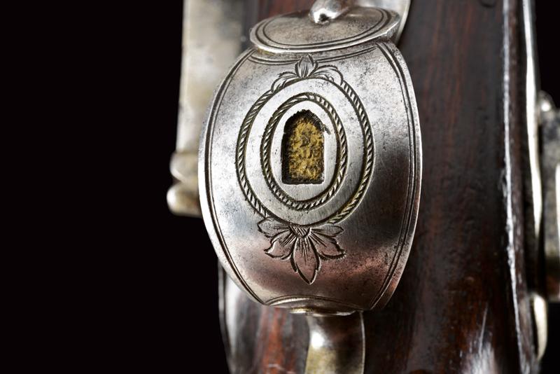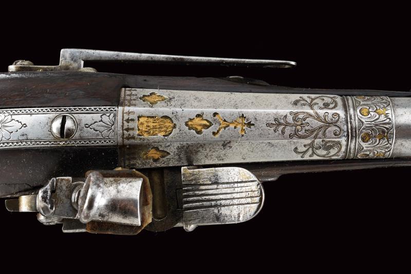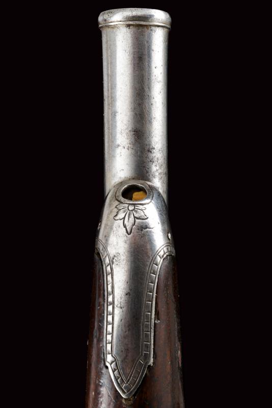 Pistola a pietra alla micheletta, datazione: 1800 circa provenienza: Spagna, Canna liscia a due ordini, ottagonale e tonda, recante alla base gigli ed altri punzoni dorati (doratura rinfrescata) non chiaramente leggibili, una cornice a fiori alla base e un fregio a racemi inciso e parzialmente ageminato al termine del segmento ottagonale; al cambio una spessa cornicetta intagliata a foglie d'acanto su fondo granulato con resti di doratura. Volata lievemente strombata e con gioia di bocca. Cal. 17 mm. Codetta incisa con foglie e cornicette. Batteria leggermente incisa e delineata. Meccanica funzionante, molla leggermente infiacchita. Cassa a tre quarti in legno, frattura restaurata all'impugnatura. Calcio zigrinato. Fornimenti in ferro. Bacchetta mancante. Coccia con lungo codolo che copre tutto il dorso dell'impugnatura. Ponticello con resti di un punzone. lunghezza 31,5 cm.