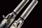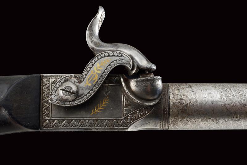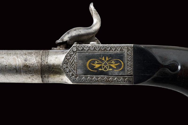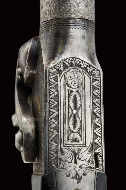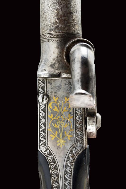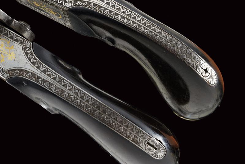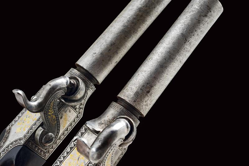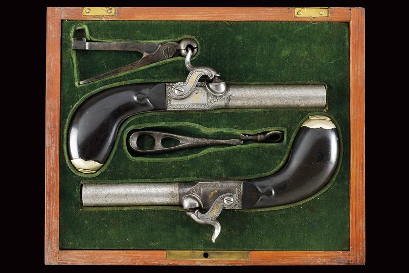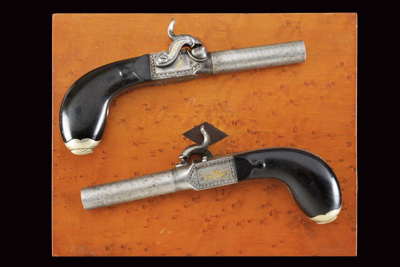 Paio di mazzagatti a luminello in cassetta, datazione: Metà del XIX Secolo provenienza: Europa, Canne cilindriche svitabili, in damasco, microrigate, cal. 11,3 mm. Castelli del tipo boxlock con meccaniche funzionanti. Le facce con cornicette intagliate. Piccole agemine dorate a racemi e foglie. I grilletti a scomparsa. Impugnature lisce in ebano. Cocce con portacapsule in metallo bianco lavorate a conchiglia. I lunghi codoli dorsali recanti cornicette. In cassetta lingea foderata all'interno in velluto verde, dotata di un attrezzo, un fondipalle e la chiave. lunghezza 19 cm.