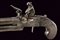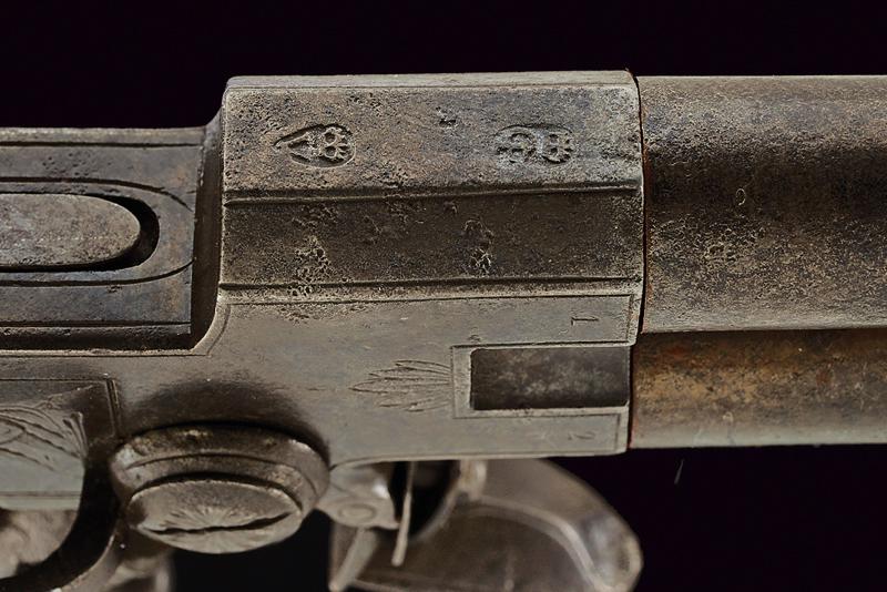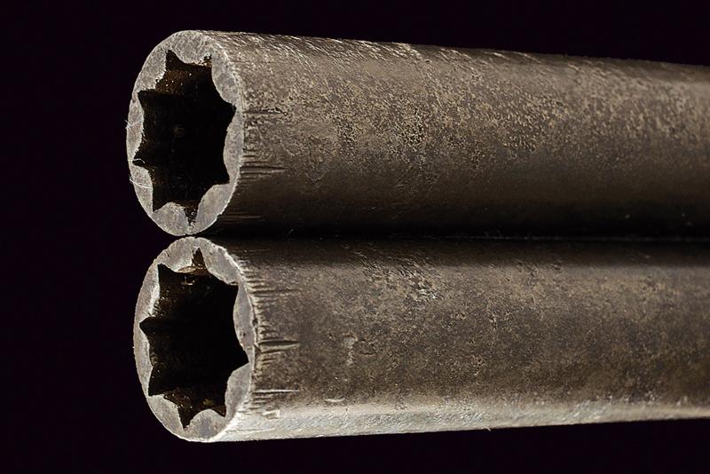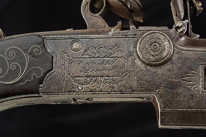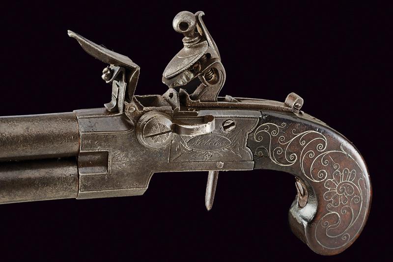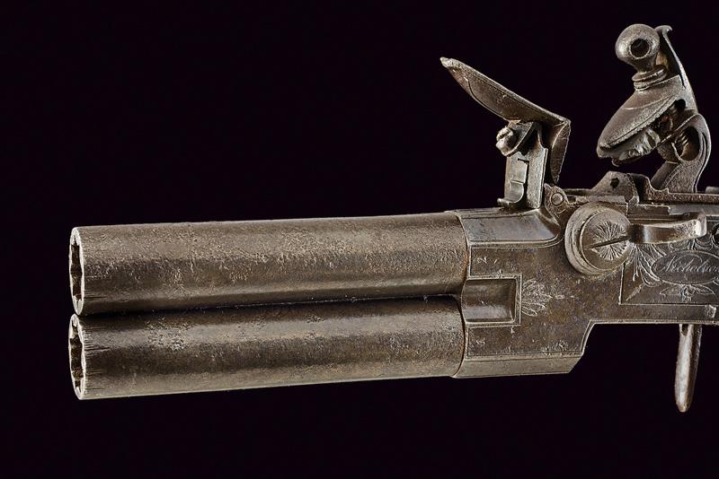 Mazzagatto a pietra a due canne sovrapposte firmato Nicholson, datazione: fine del XVIII Sec. provenienza: Inghilterra, Canne cilindriche svitabili, con resti di cornicette incise in volata, cal. 11 mm. Castello boxlock in ferro ornato con delineature e piccoli fregi a foglie e fiori. Sul fianco sinistro un trofeo con cartiglio ellittico che racchiude la firma 'Nicholson', su quello destro un differente cartiglio ornato di ghirlande recante l'iscrizione 'Corn=Hill / London'. Al dorso la martellina, sul fianco sinistro il selettore dei foconi per lo scodellino, funzionante.Cane dorsale dotato di sicura esterna, il grilletto a scomparsa. Meccanica funzionante (il grilletto tende a scendere). Intaccature. Calcio in legno con belle agemine a volute e rocaille. Per Willian Nicholson (circa 1783-1794) vedi 'Der Neue Stoeckel', vol. 2 pag. 870. E' documentato a Londra, nel 1789-1794 ha la sede a Corn Hill. lunghezza 20,5 cm.