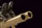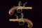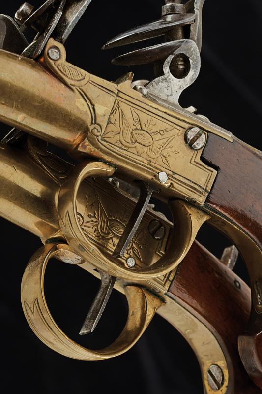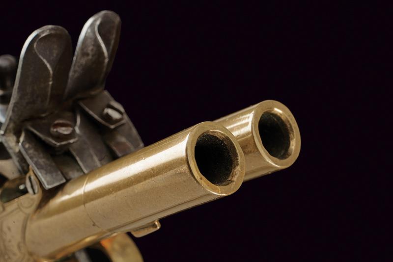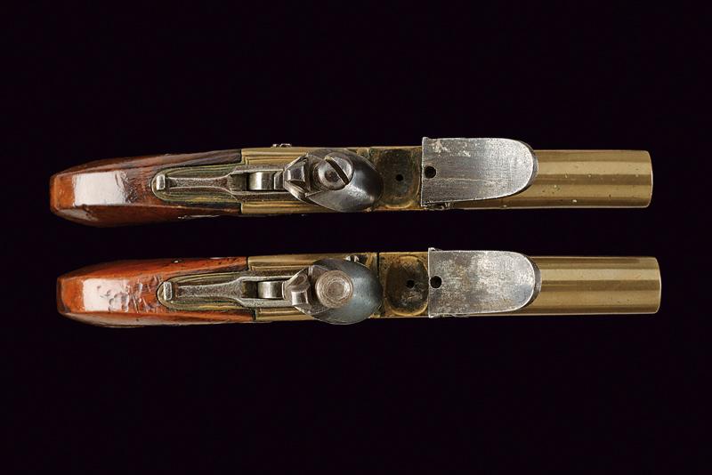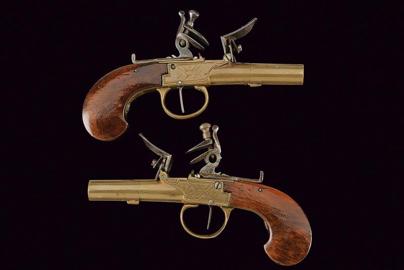 Paio di mazzagatti a pietra focaia da marina, datazione: 1800 circa provenienza: Inghilterra, Canne in ottone, svitabili, cal. 9,5 mm. Castelli di tipo boxlock con incisioni a trofei. Cani e martelline dorsali, in ferro. Meccaniche funzionanti, una a due scatti, una a scatto singolo. Sicure di blocco copriscodellino al dorso. Calci lisci in legno. Di gusto britannico. lunghezza 16,2 cm.