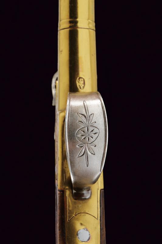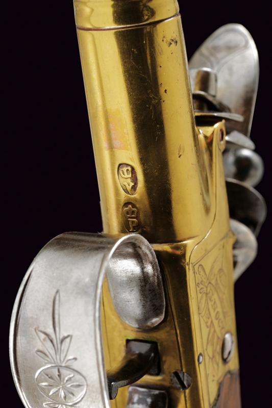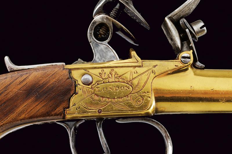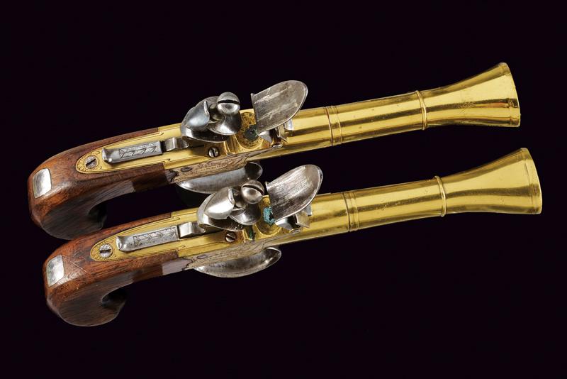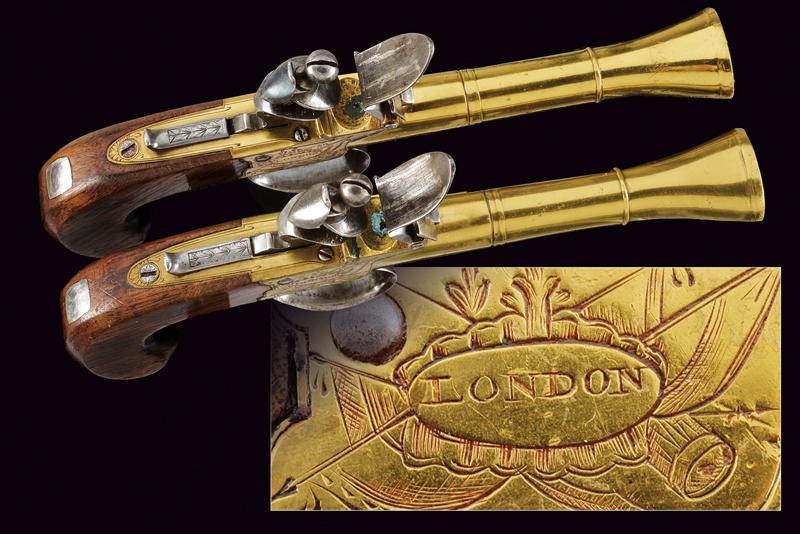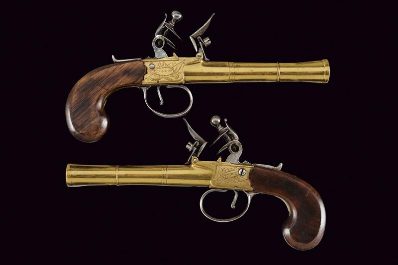 Paio di mazzagatti a pietra focaia da marina di Nock, datazione: Inizio del XIX Secolo provenienza: Inghilterra, Canne tonde a tre ordini separati da anellature, volate con forte strombatura ellittica. I castelli di tipo boxlock incisi a trofei e firmati 'H. NOCK' e 'LONDON'. Ponticelli, cani, martelline, grilletti e sicure in ferro. Calci in legno. lunghezza 20 cm.