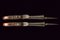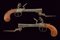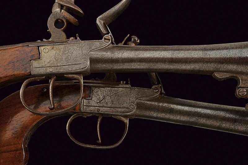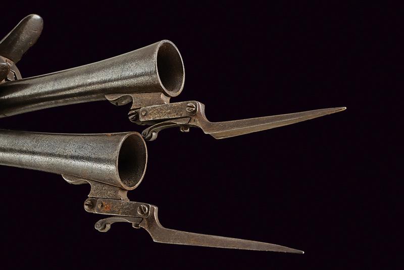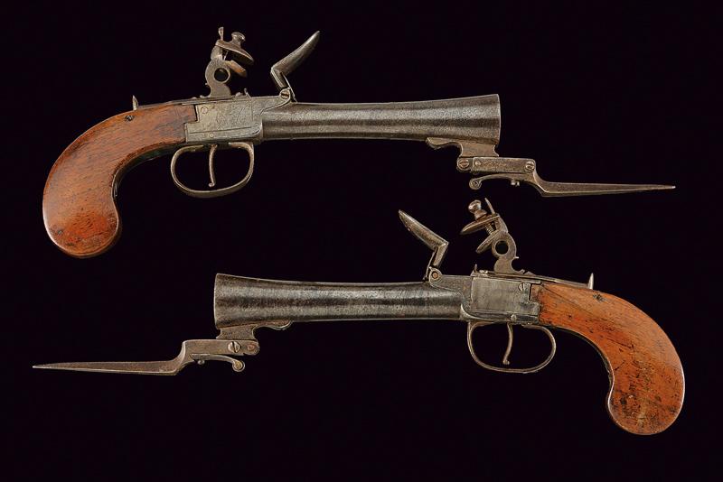 Paio di mazzagatti a pietra focaia con baionetta, datazione: 1800 circa provenienza: Inghilterra, Interessanti canne a forte strombatura circolare, in ferro, lavorate a torcione. Castelli in ferro con resti di incisioni a trofei. Cani e martelline dorsali. Meccaniche funzionanti, una a due scatti, una a scatto singolo. Calci lisci in legno. Sotto alle canne una baionetta a scatto (molla infiacchita) sganciabile tramite scorrimento del ponticello. lunghezza with open bayonet 33 cm.
