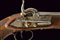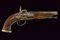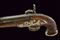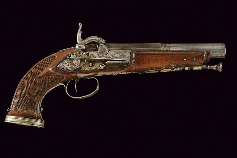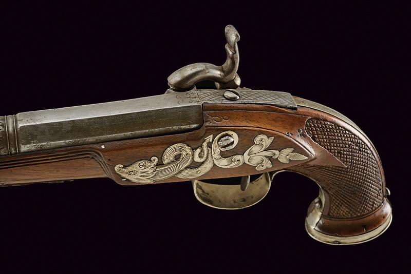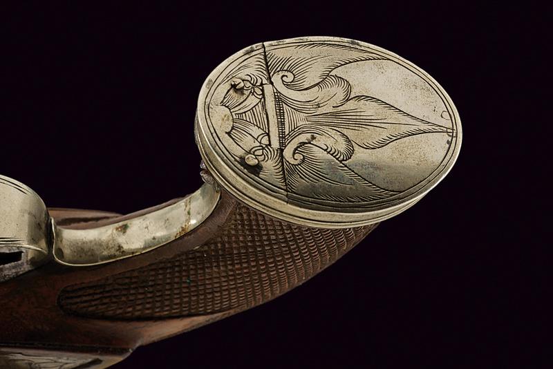 Pistola ridotta a luminello, datazione: Prima metà del XIX Secolo provenienza: Napoli o Spagna, Canna liscia a due ordini, prima ottagonale, recante resti di un fregio alla base (monogramma?) e due piccoli gigli poi faccettata, con anellatura e foglie d'acanto al cambio. Cal. 15,5 mm. in volata. Codolo inciso a rete. Batteria trasformata a luminello con cartella piatta incisa a fiorami. Cassa intera in legno con collo zigrinato e delineature. Fornimenti in metallo bianco. Coccia piatta incisa a fiorame e munita di portacapsule. Contropiastra lavorata a grottesche. Bacchetta in ferro. lunghezza 26,5 cm.