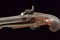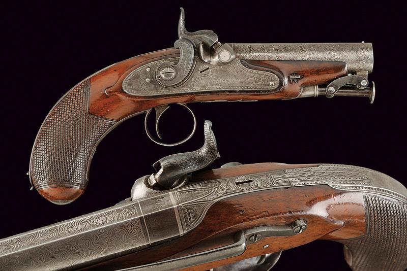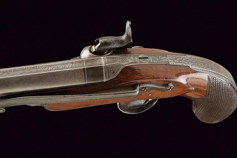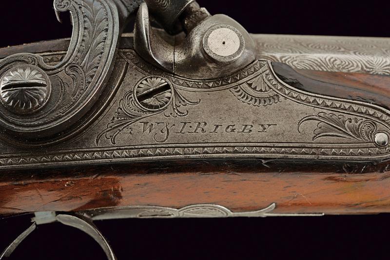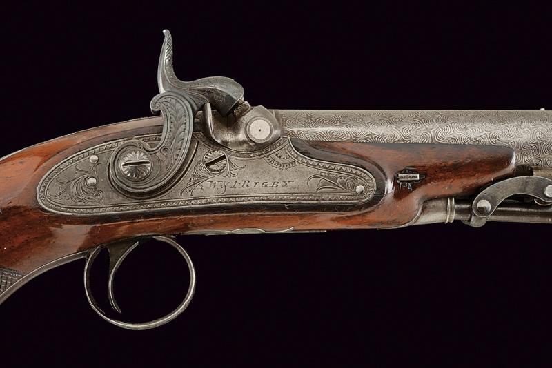 Bella e rara pistola a luminello di Rigby, datazione: Metà del XIX Secolo provenienza: Dublino, Canna in finissimo damasco, liscia, tonda, con base quadra e scanalatura nella parte superiore, su tutta la lunghezza marcata 'DUBLIN', la base incisa, mirino, cal. 12.5 mm; codetta incisa; batteria firmata 'W & I. RIGBY' finemente incisa a motivi floreali e geometrici, cassa intera in legno con calcio zigrinato, fornimenti in ferro decorato en suite. Il dorso con fornimento apribile che nasconde tre scompartimenti per pallottole. Coccia in argento, gancio da cintura e bacchetta a snodo in ferro. lunghezza 21 cm.