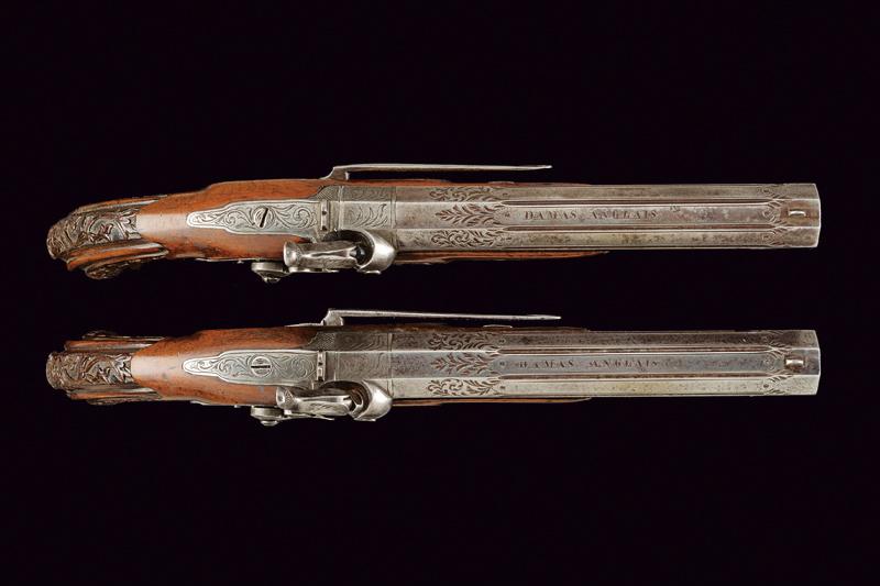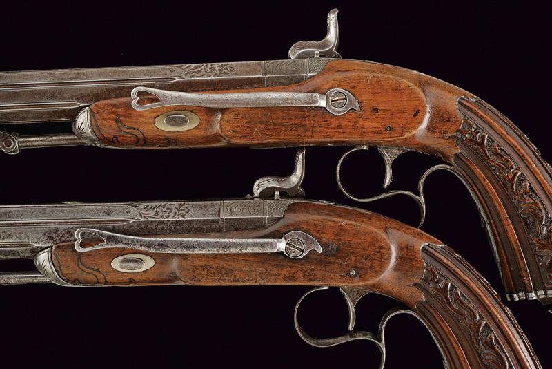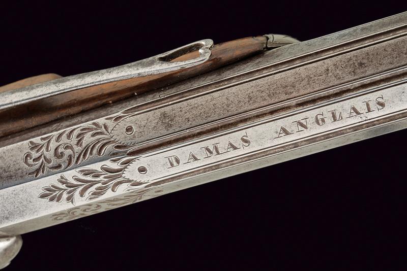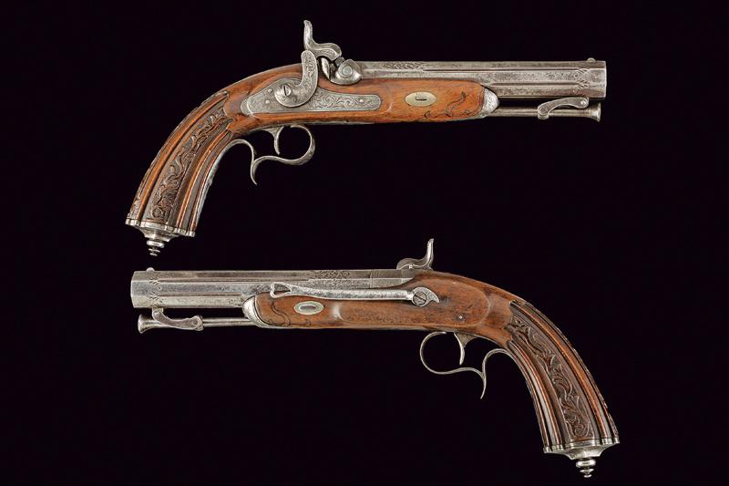 Paio di pistole a luminello, datazione: Metà del XIX Secolo provenienza: Europa, Canne rigate (rigatura ancora appena visibile), ottagonali, marcate 'DAMAS ANGLAIS', incise e scanalate, munite di mirino, cal. 17.5 mm; codette incise e munite di tacca di mira. Batterie a molla in avanti incise a motivi floreali. Casse in legno con calci scanalati e scolpiti fornimenti in ferro inciso, ponticelli con poggiadito, ganci da cintura e bacchette a snodo in ferro. lunghezza 34 cm.