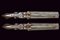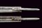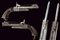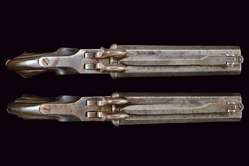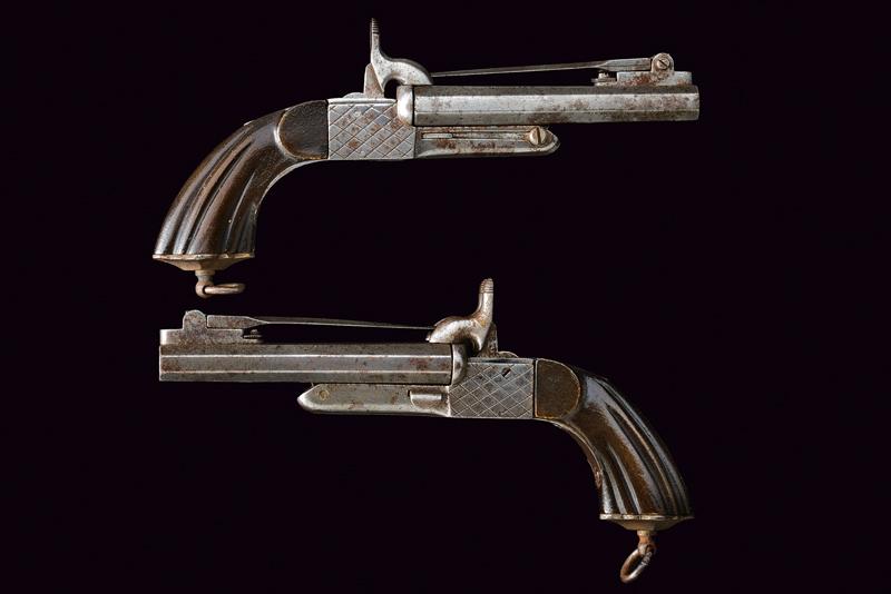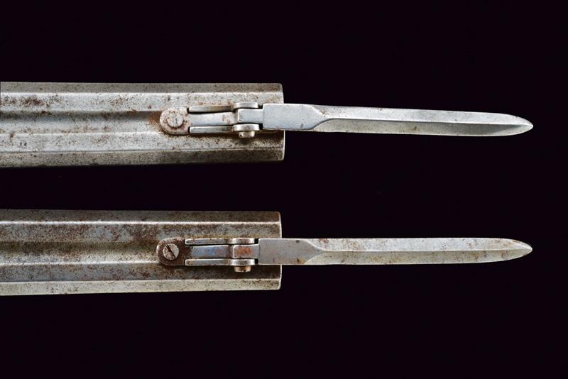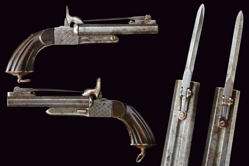 Paio di pistole a due canne a spillo con baionetta, datazione: 1870 circa provenienza: Europa, Canne lisce, ottagonali, con baionetta pieghevole, cal. 10 mm; castelli del tipo boxlock incisi a losanghe. Pulsante per l'apertura delle canne. Grilletti a scomparsa. Calcio in legno scanalato, coccia in ferro con anello di sospensione. lunghezza 22.5 open 31 cm.