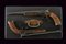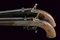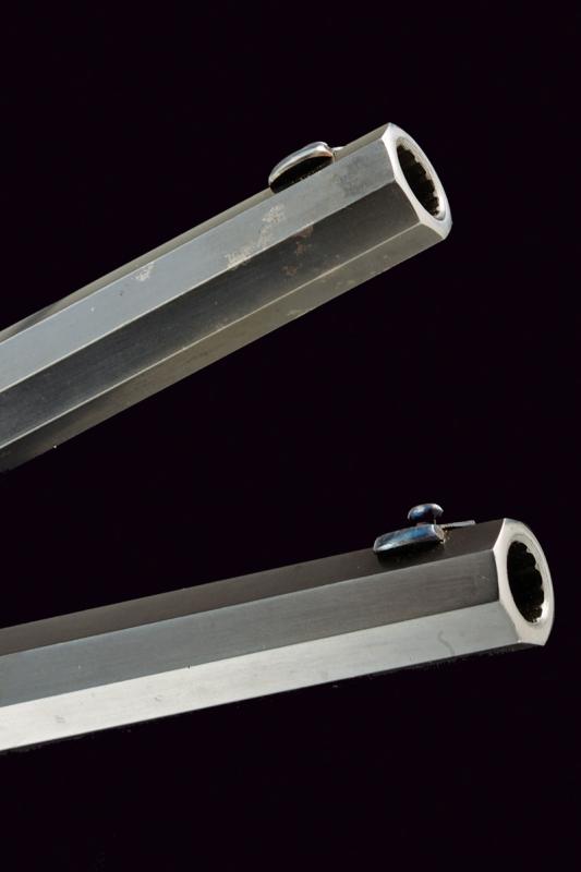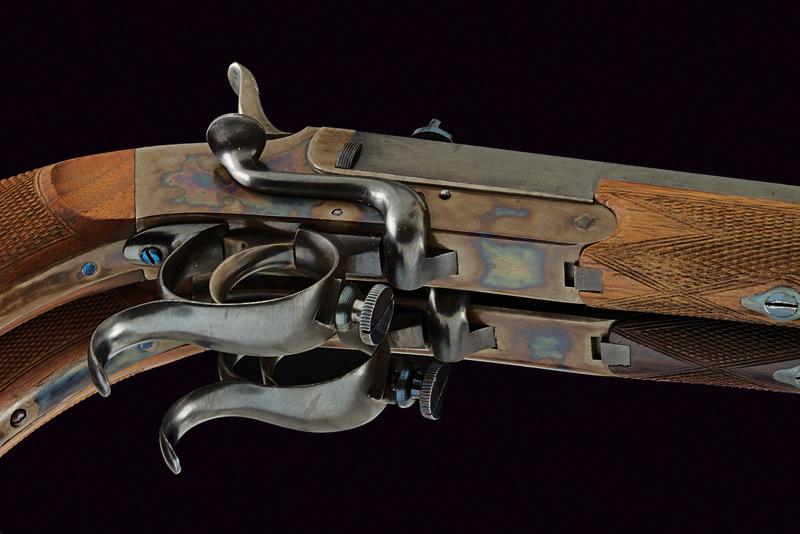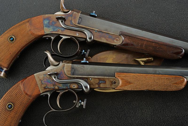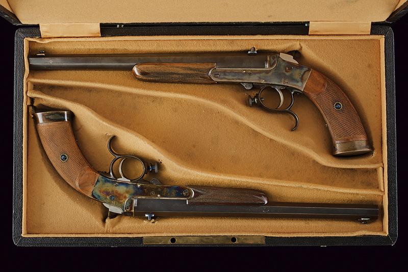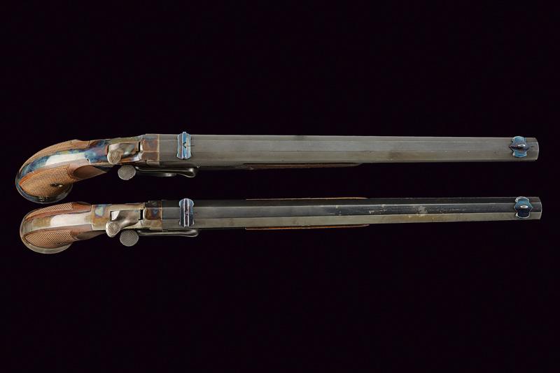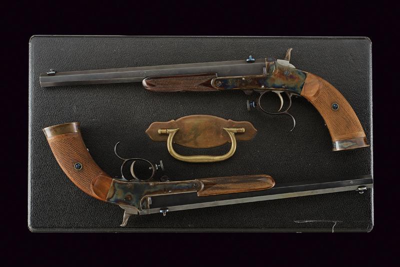 Paio di pistole da tiro a retrocarica in cassetta, datazione: 1875 - 1890 circa provenienza: Belgio, Canne ottagonali rigate, brunite (una brunitura con piccole mancanze), dotate di mirino e alzo fisso. Cal. 10,4 mm. Castelli tartarugati, con leva d'apertura sul lato destro. Astine e calci in legno con fine zigrinatura. Vari punzoni sulle canne quali 'AE' e timbro del banco di prova di Liegi. Ponticelli con poggiadito e con vite di regolazione. In una cassetta lignea foderata esternamente in marocchino nero, con fornimenti in ottone. L'interno in panno beige. lunghezza 38,5 cm.