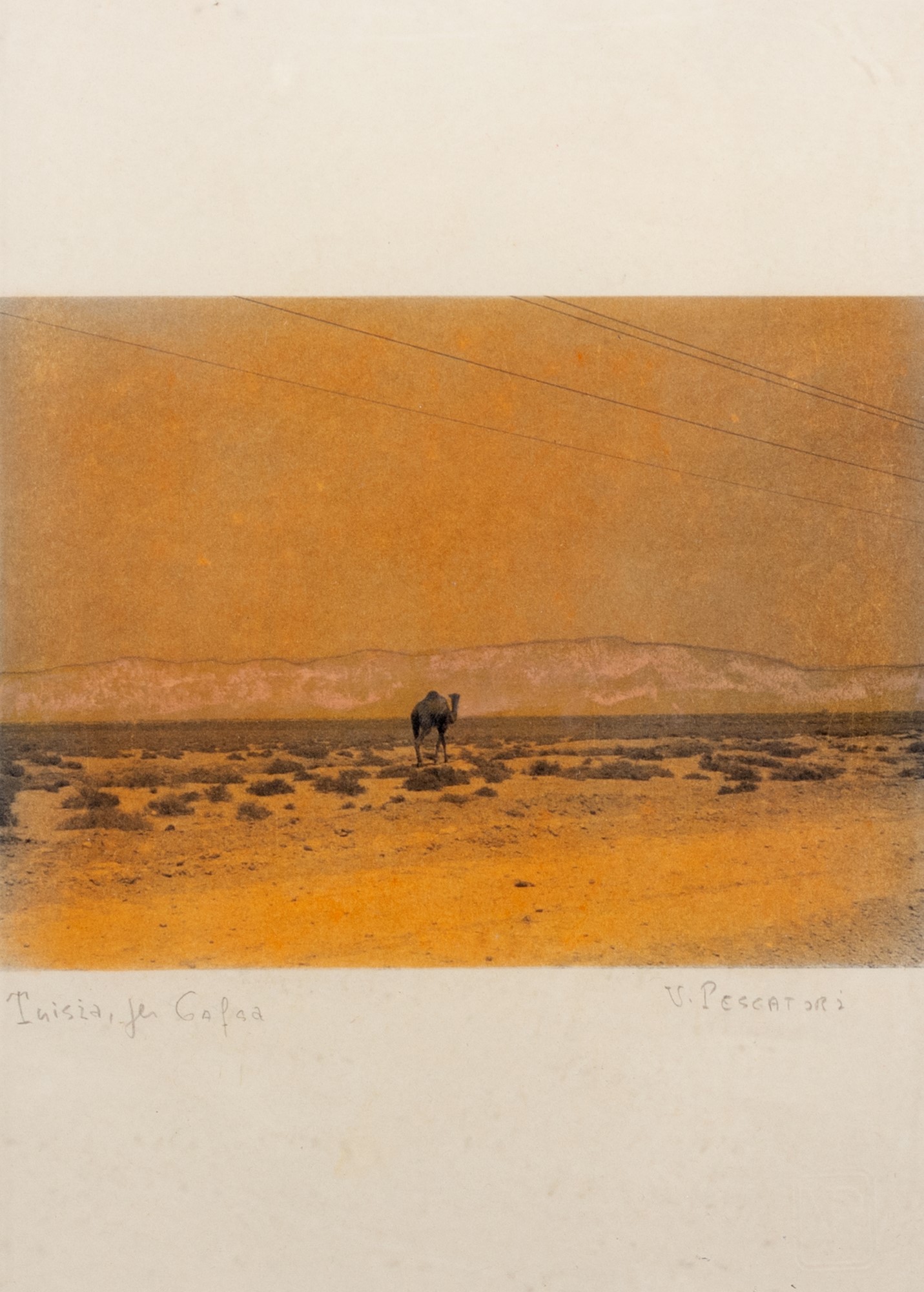 una intitolata Tunisia, per Gafsa in basso a sinistra e firmata a matita in basso a destra V. Pescatori; l'altra intitolata al verso Cité interdite I, numerata 4/10, datata 1996 e firmata indistintamente