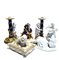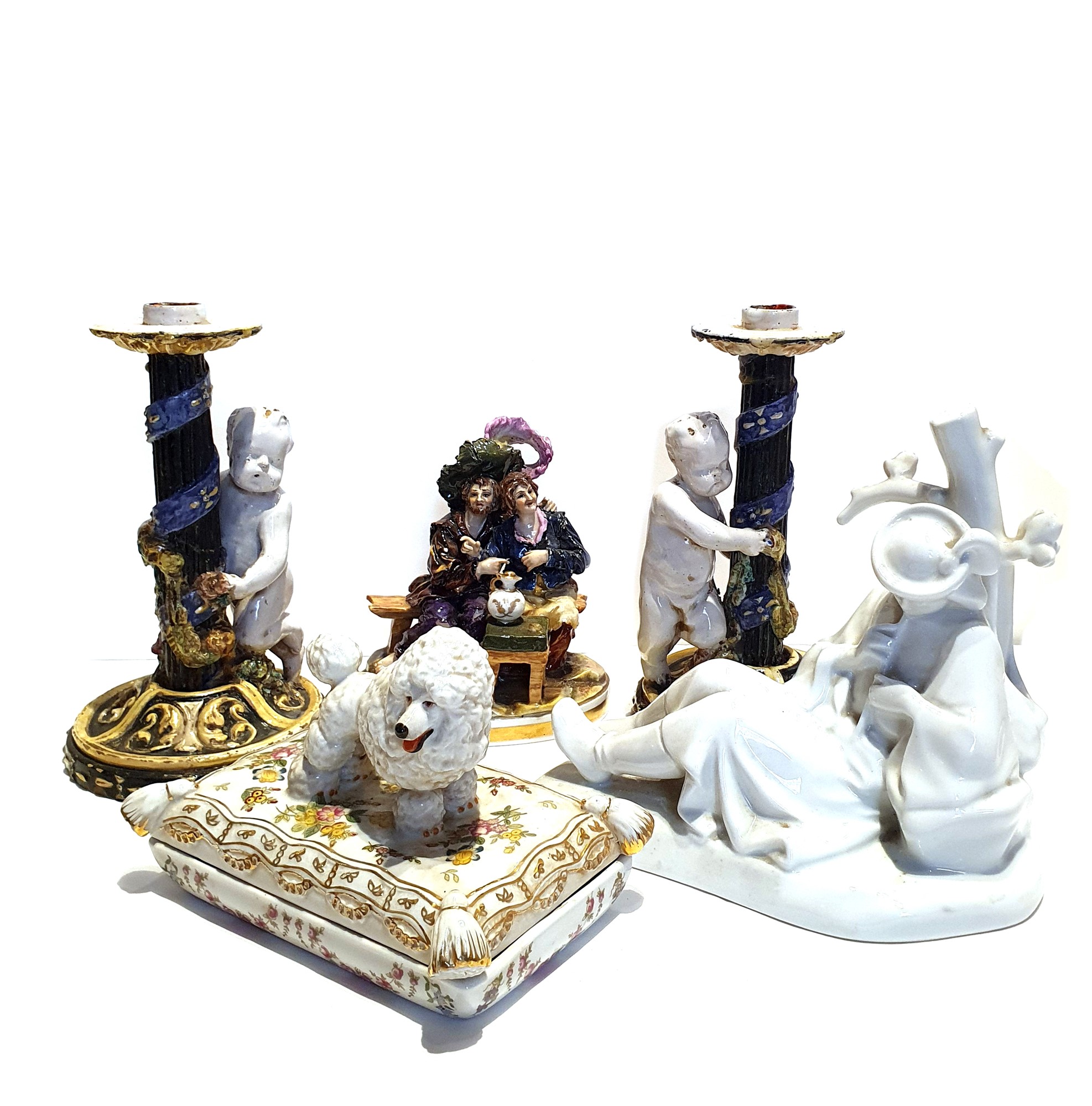 due candelieri in ceramica policroma con putti, secolo XIX; scultura in porcellana bianca raffigurante pifferaio; scultura in porcellana policroma raffigurante coppia di popolani; e scatola in porcellana policroma con presa a forma di barboncino