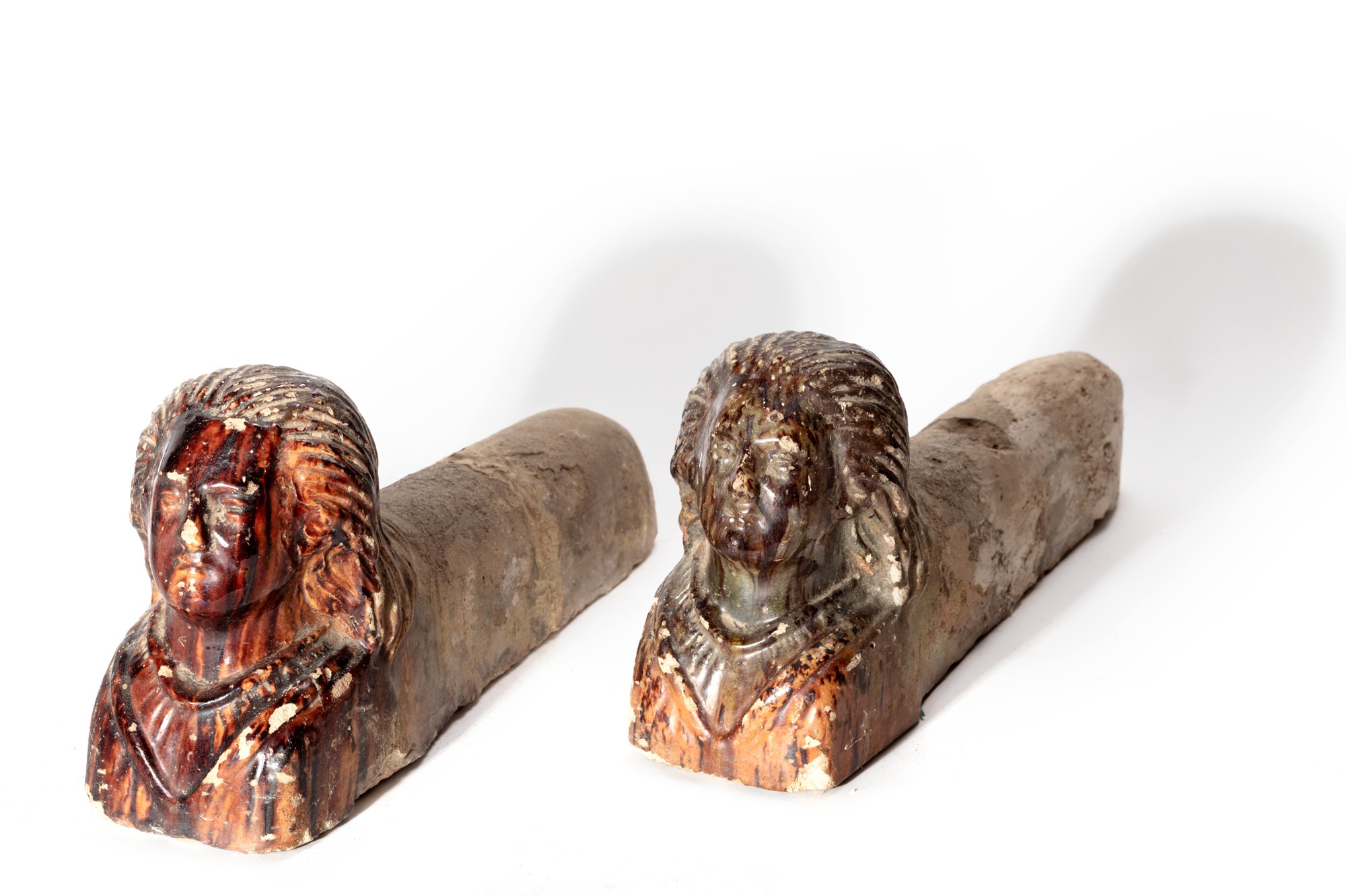Coppia di alari in ceramica con busti di sfinge, secolo XIX