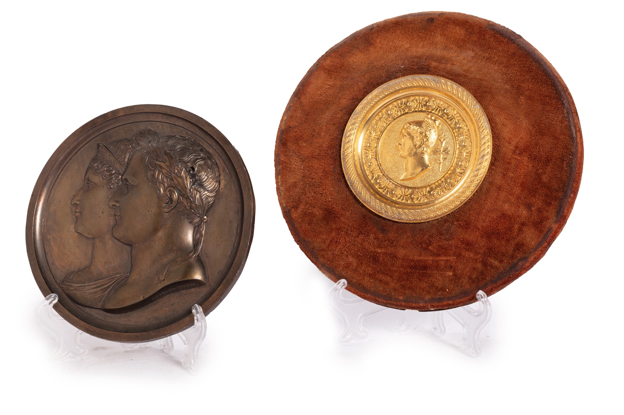 uno in metallo bianco patinato bronzo raffigurante Napoleone e Maria Luisa d'Austria; l'altro in bronzo dorato con profilo di donna (probabilmente Paolina Borghese)