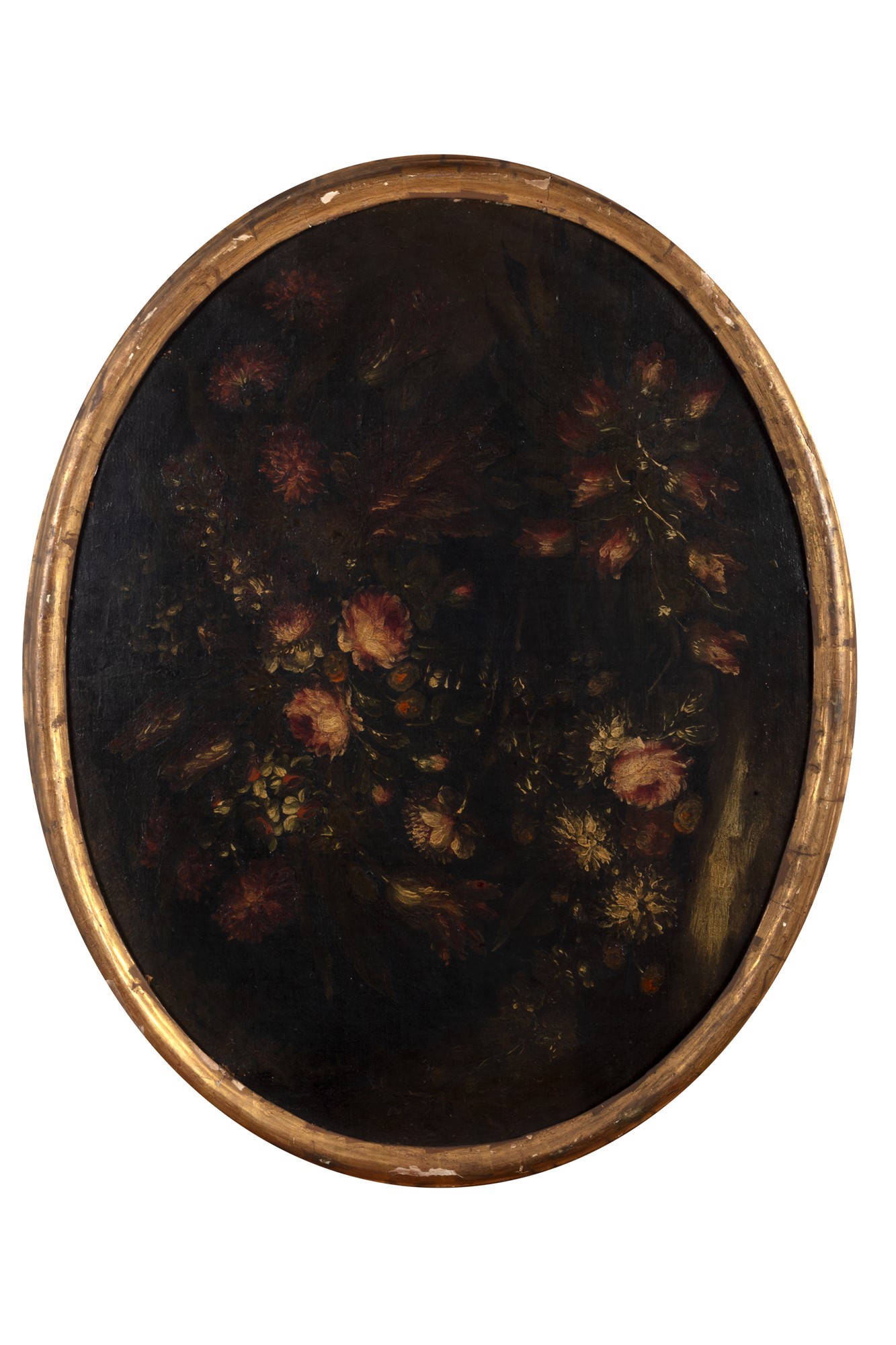 Scuola dell'Italia settentrionale, secolo XVIII - Rose, tulipani, garofani e altri fiori in un vaso d'argento sbalzato en plein air