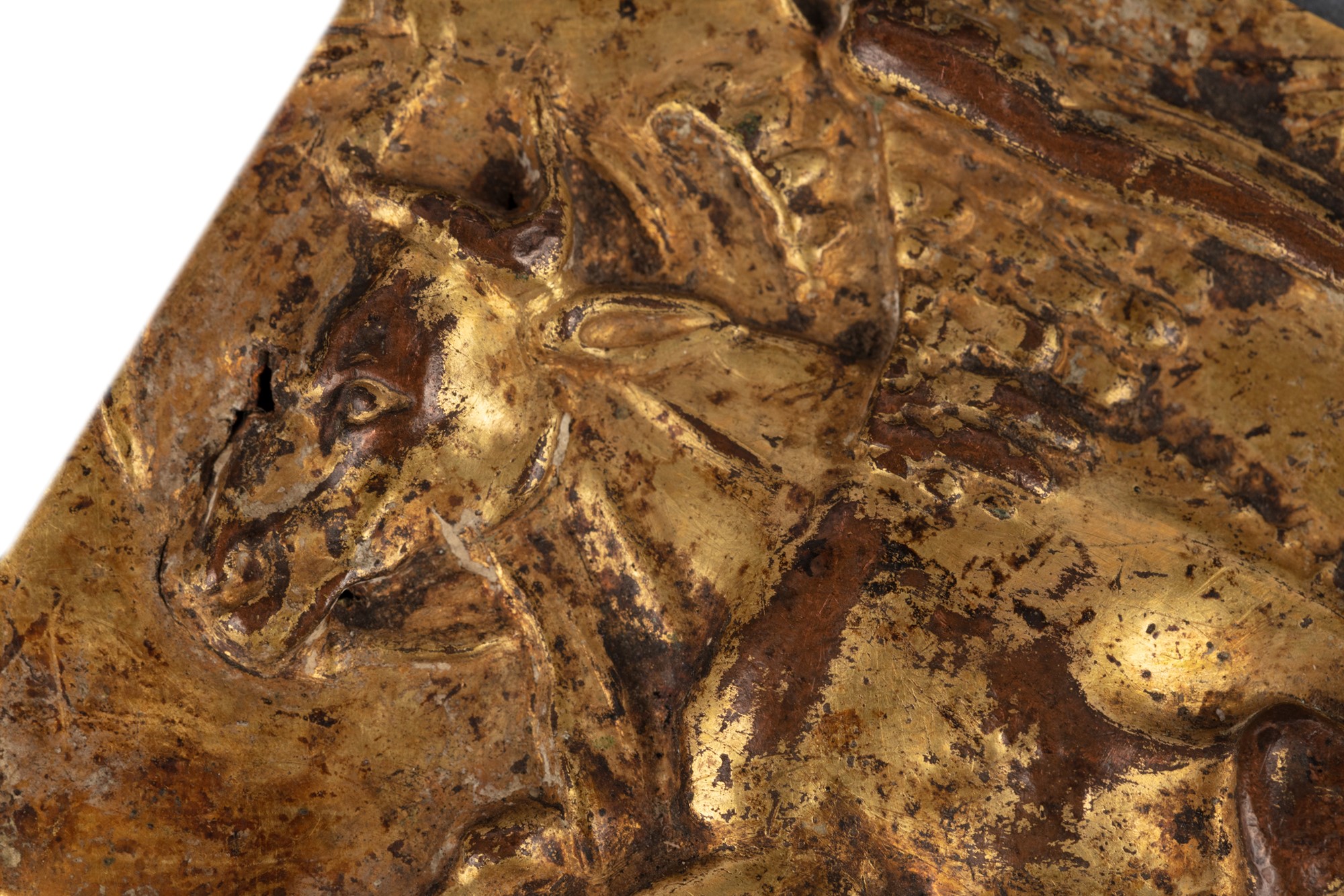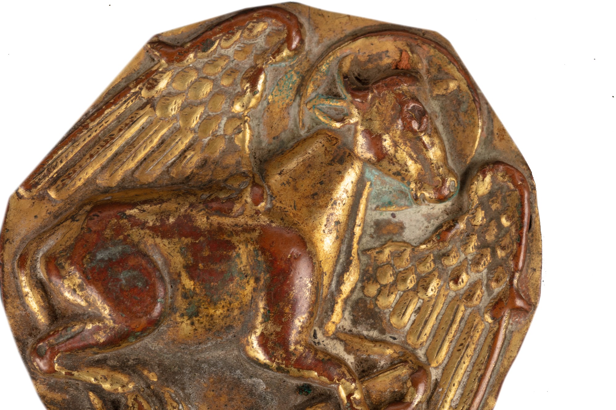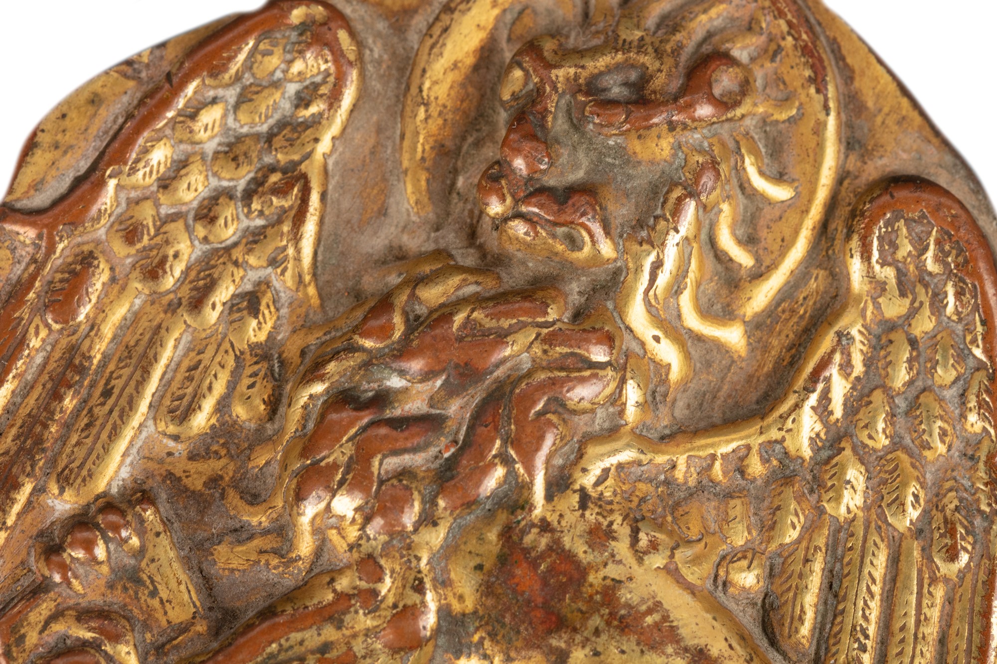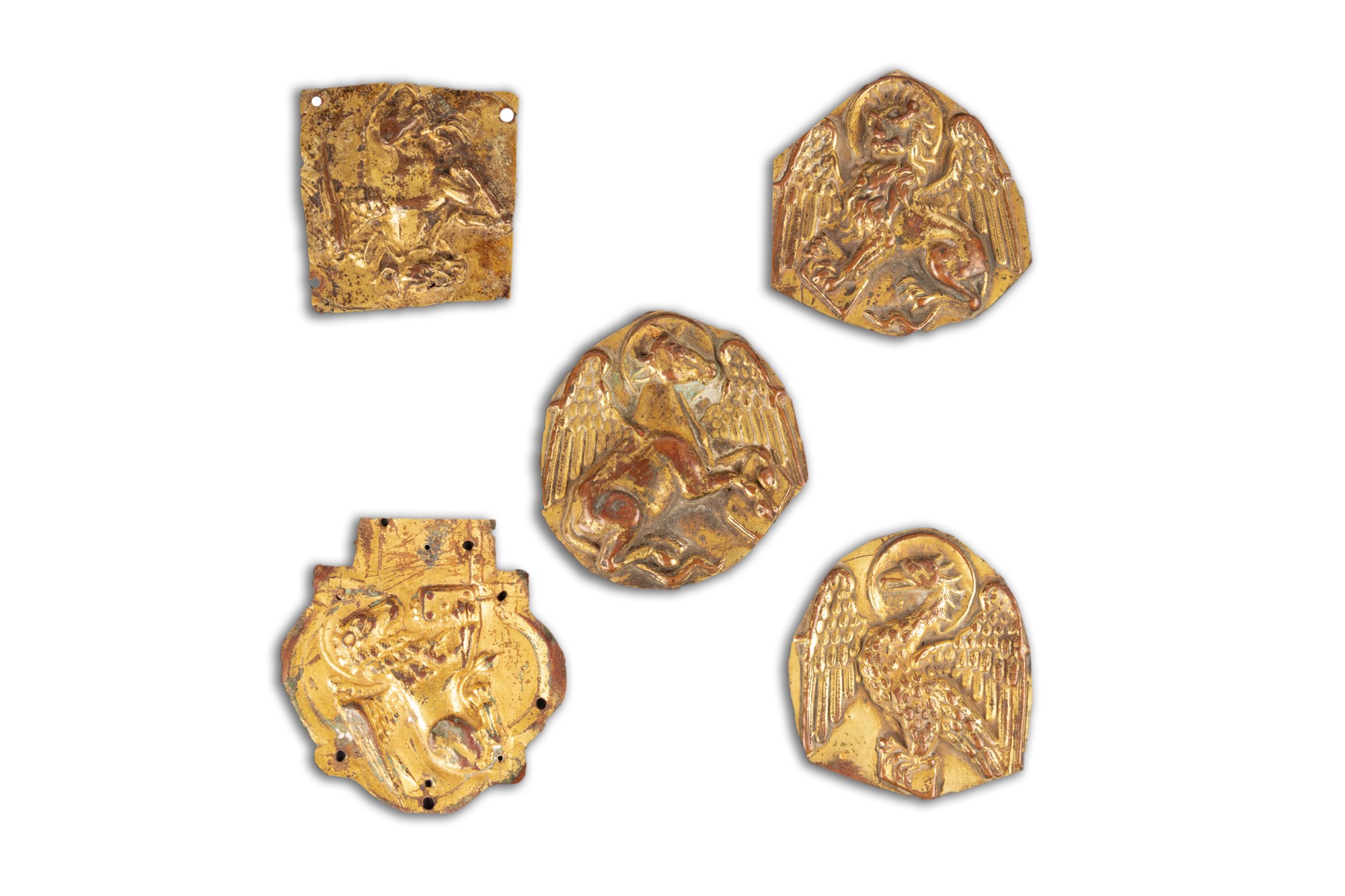 Lotto di cinque finimenti per croci processionali in lamina di rame sbalzato, cesellato e dorato con i simboli del Tetramorfo, secoli XIV - XV