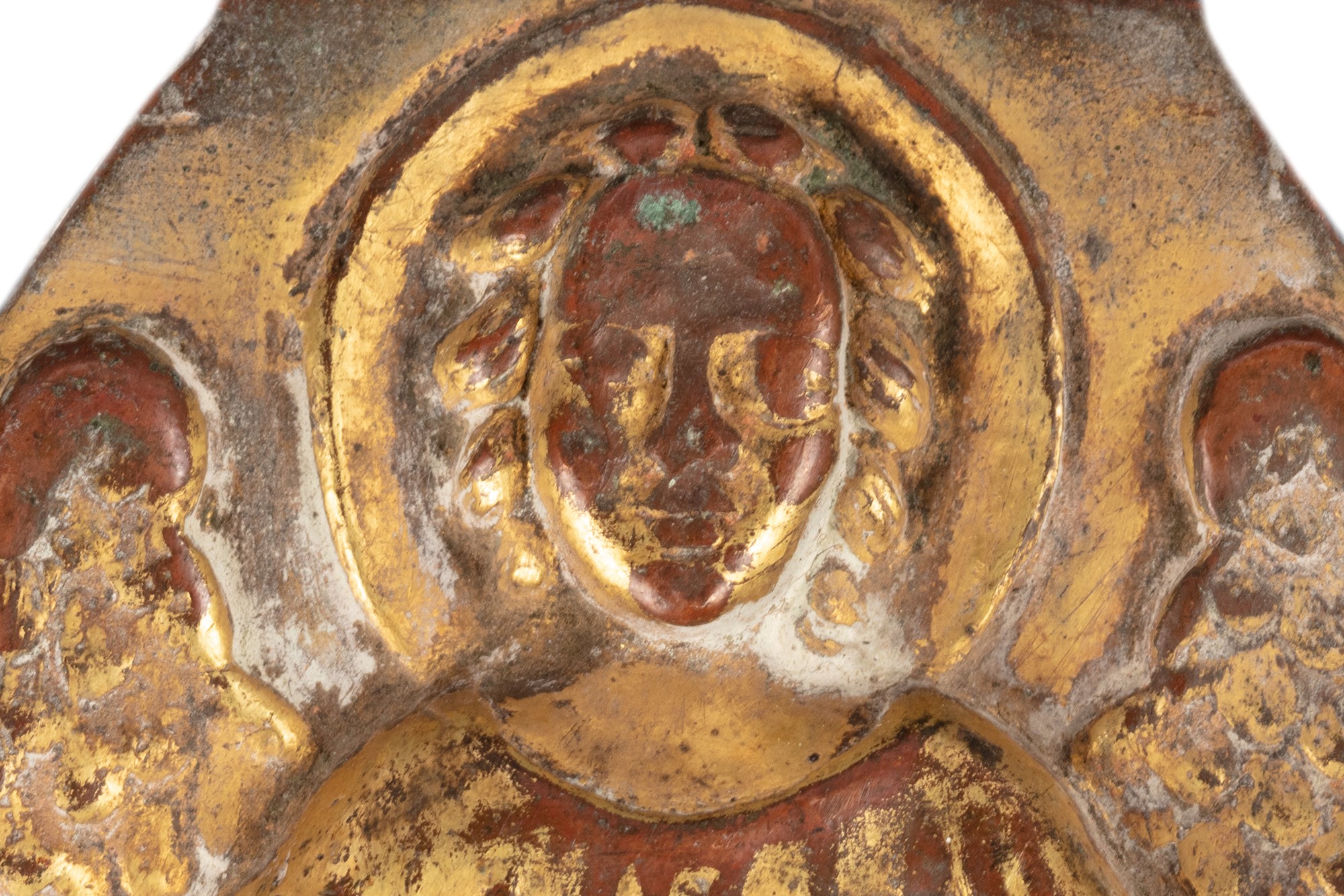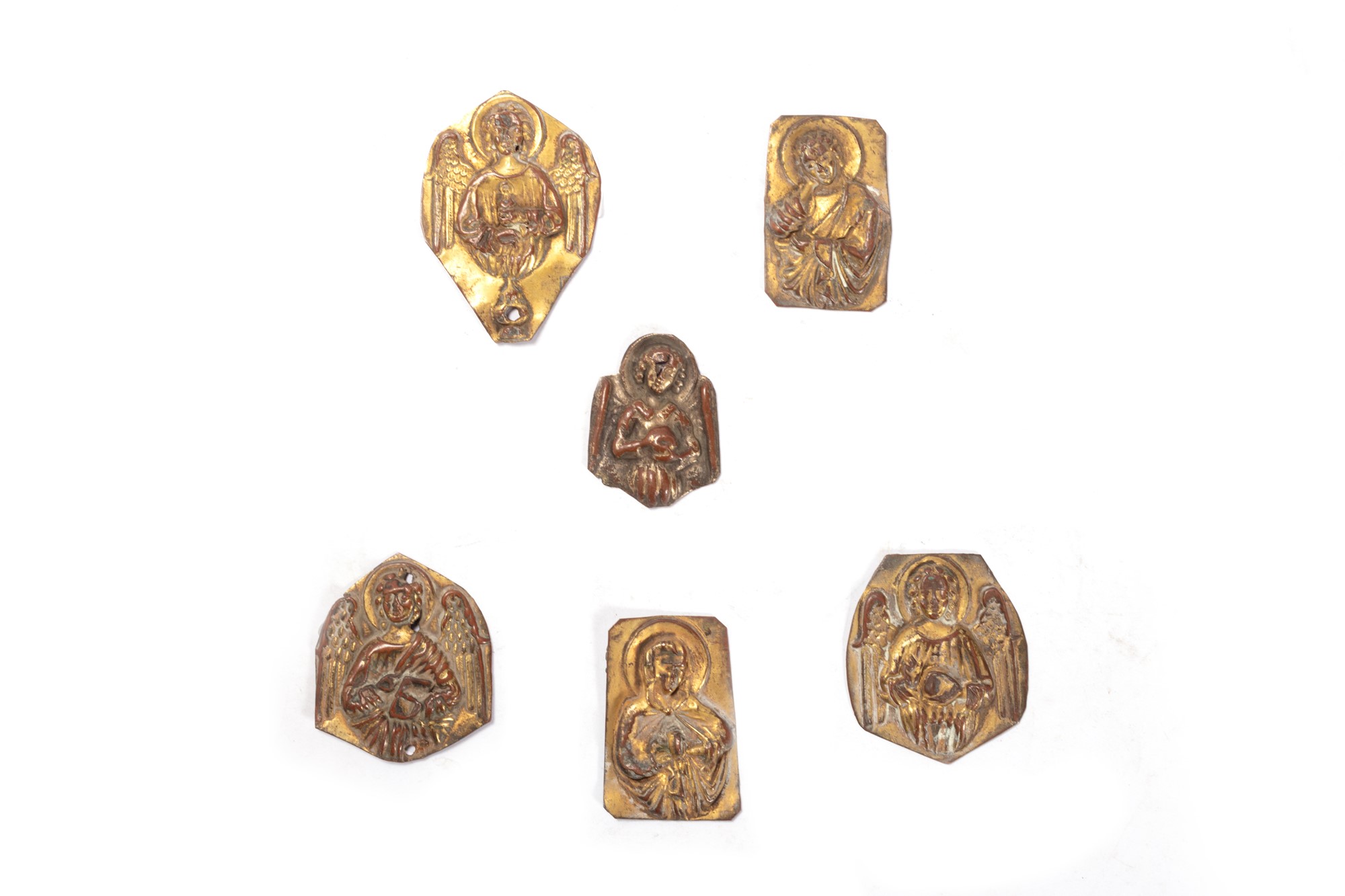 Lotto di sei finimenti per croci processionali in lamina di rame sbalzata, cesellata e dorata, secoli XIV - XV