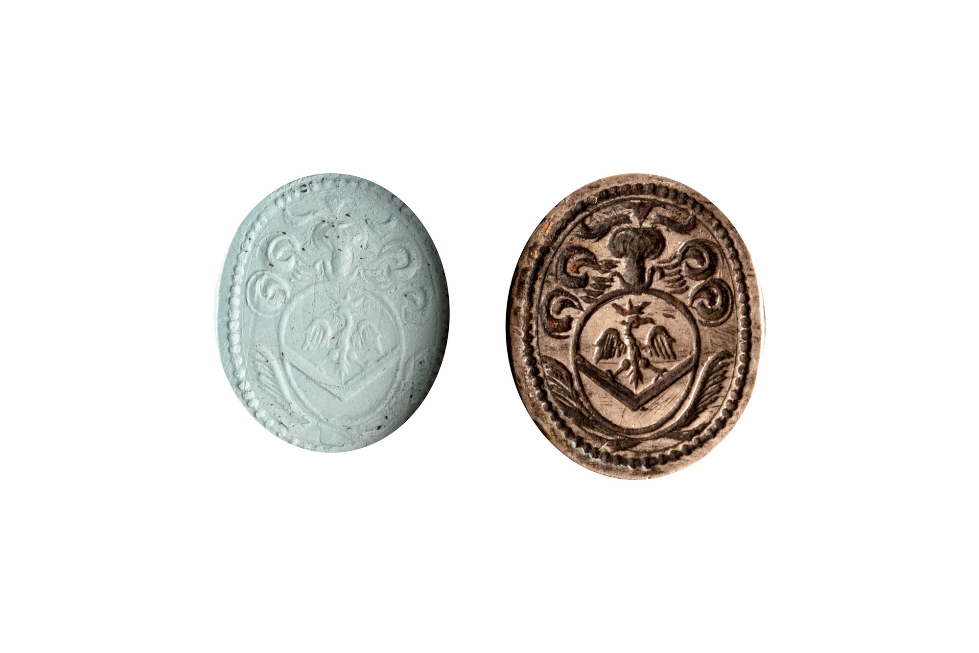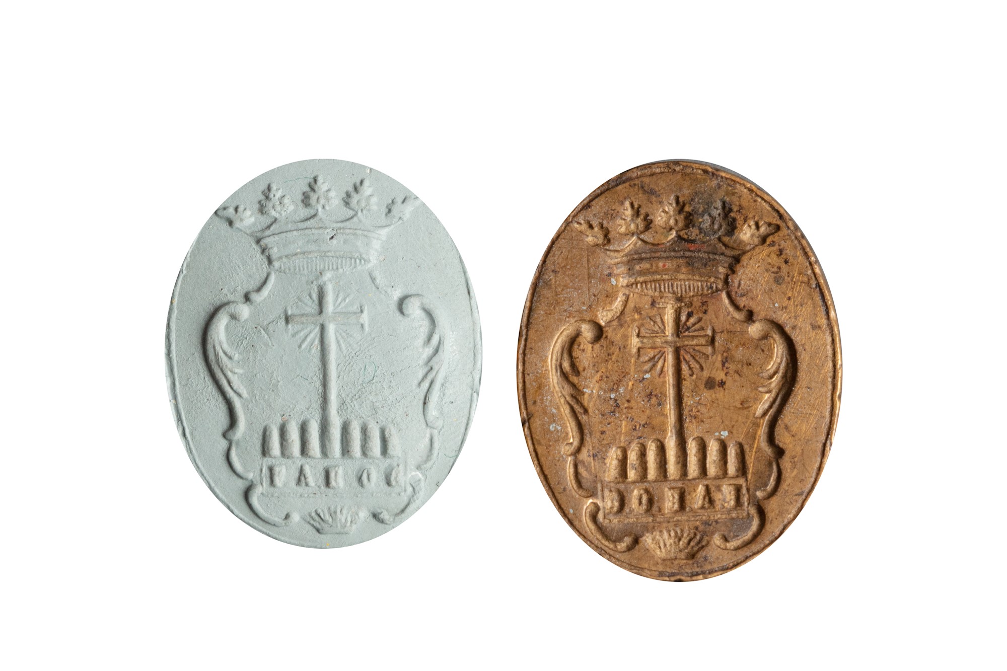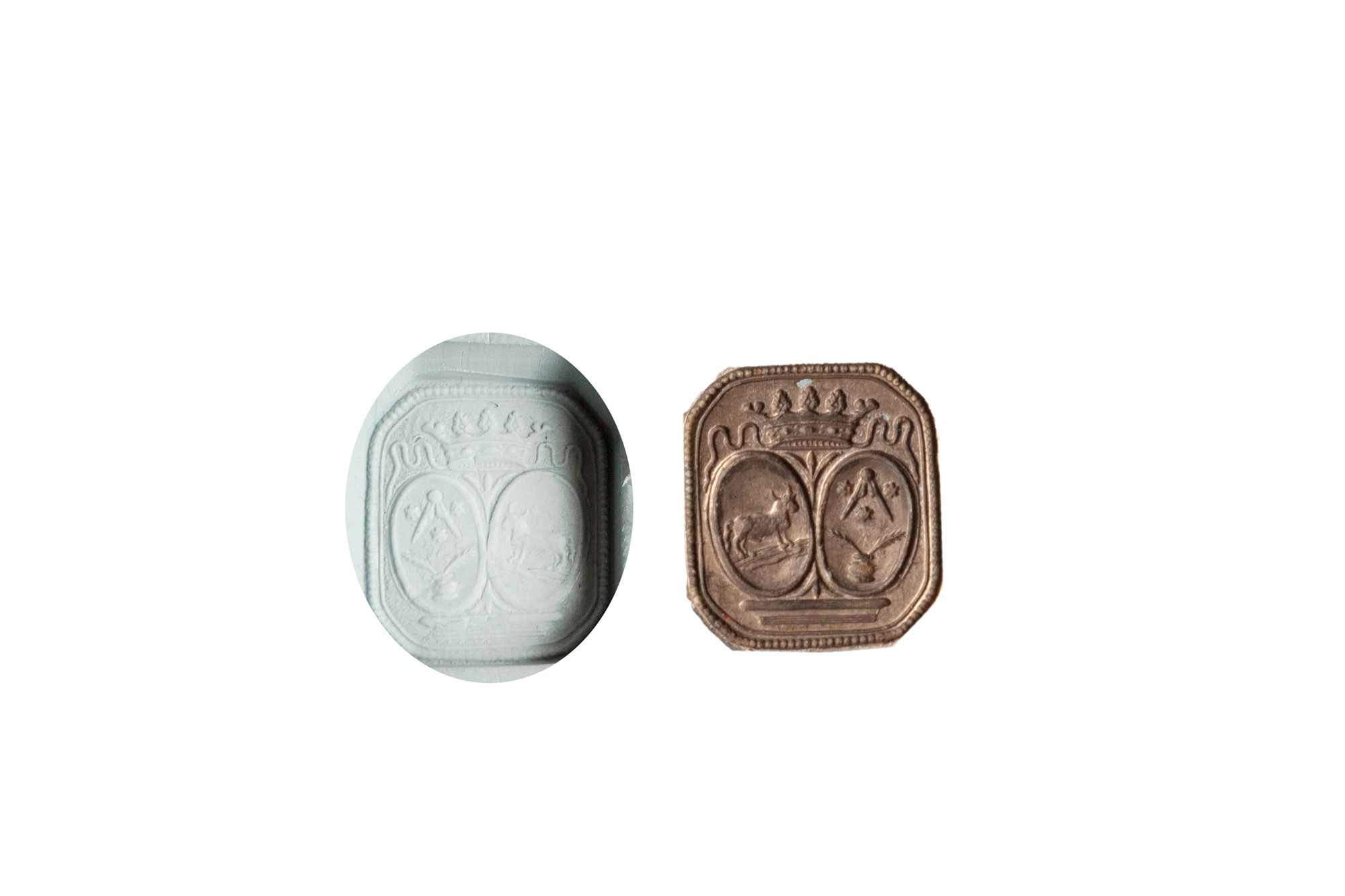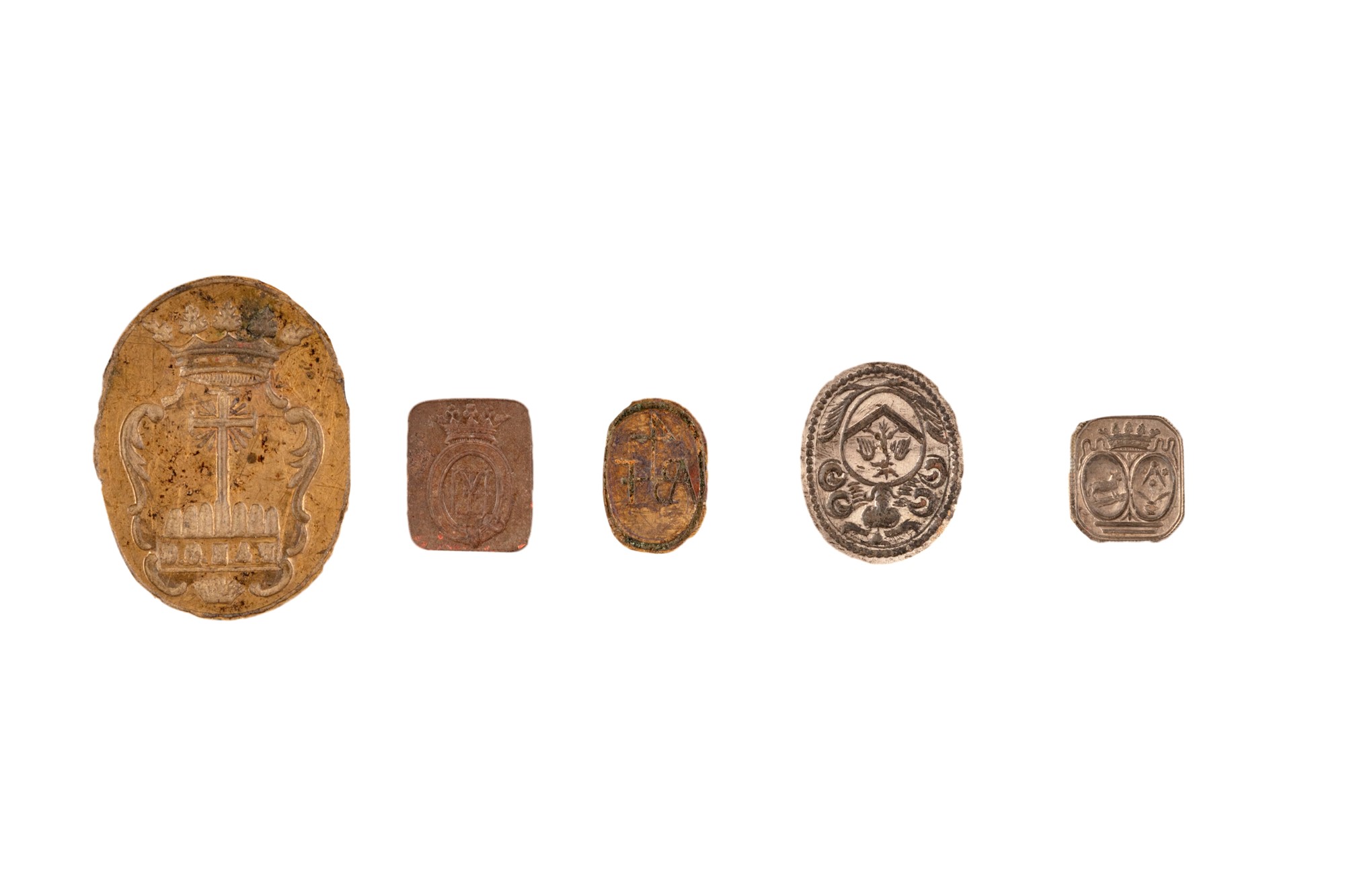 Lotto composto da cinque sigilli, di cui due in bronzo, uno in ferro e due in argento, privi di manico, con stemmi nobiliari, secoli XVIII - XIX