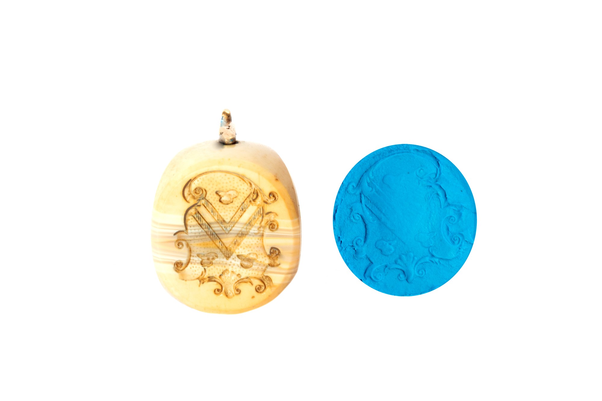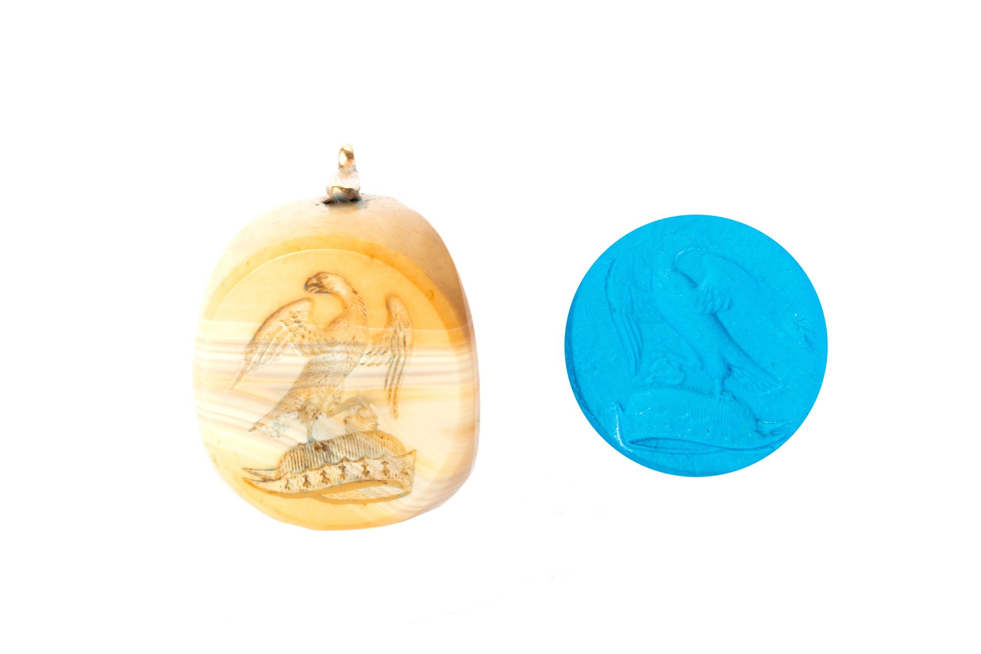 Lot 630 | Sigillo multiplo a pendente in oro 9 K 375 e pietra dura con stemma nobiliare, aquila e monogramma, Inghilterra secolo XIX