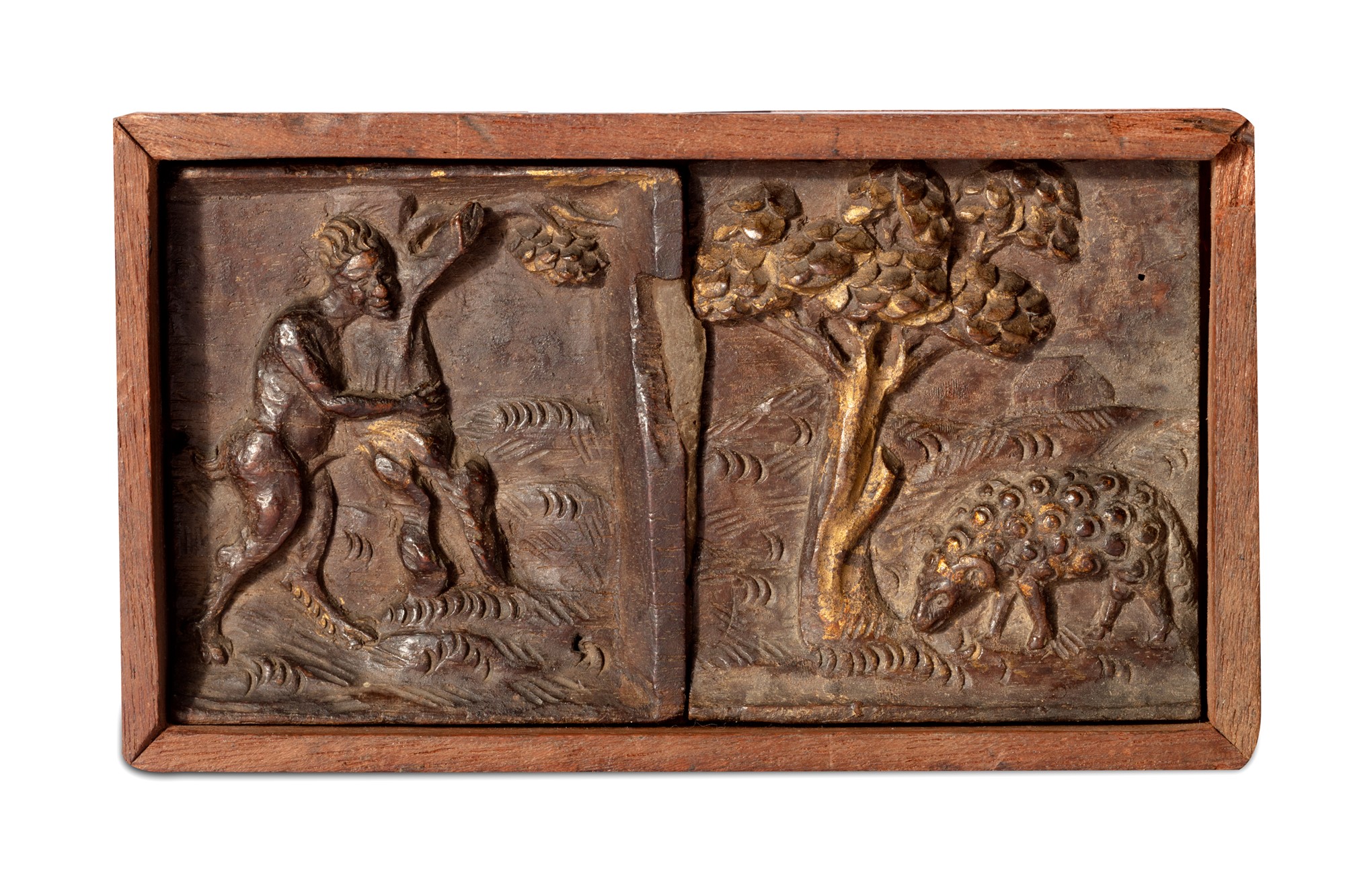 Lot 648 | Antico bassorilievo in legno raffigurante satiro e pecorella entro paesaggio