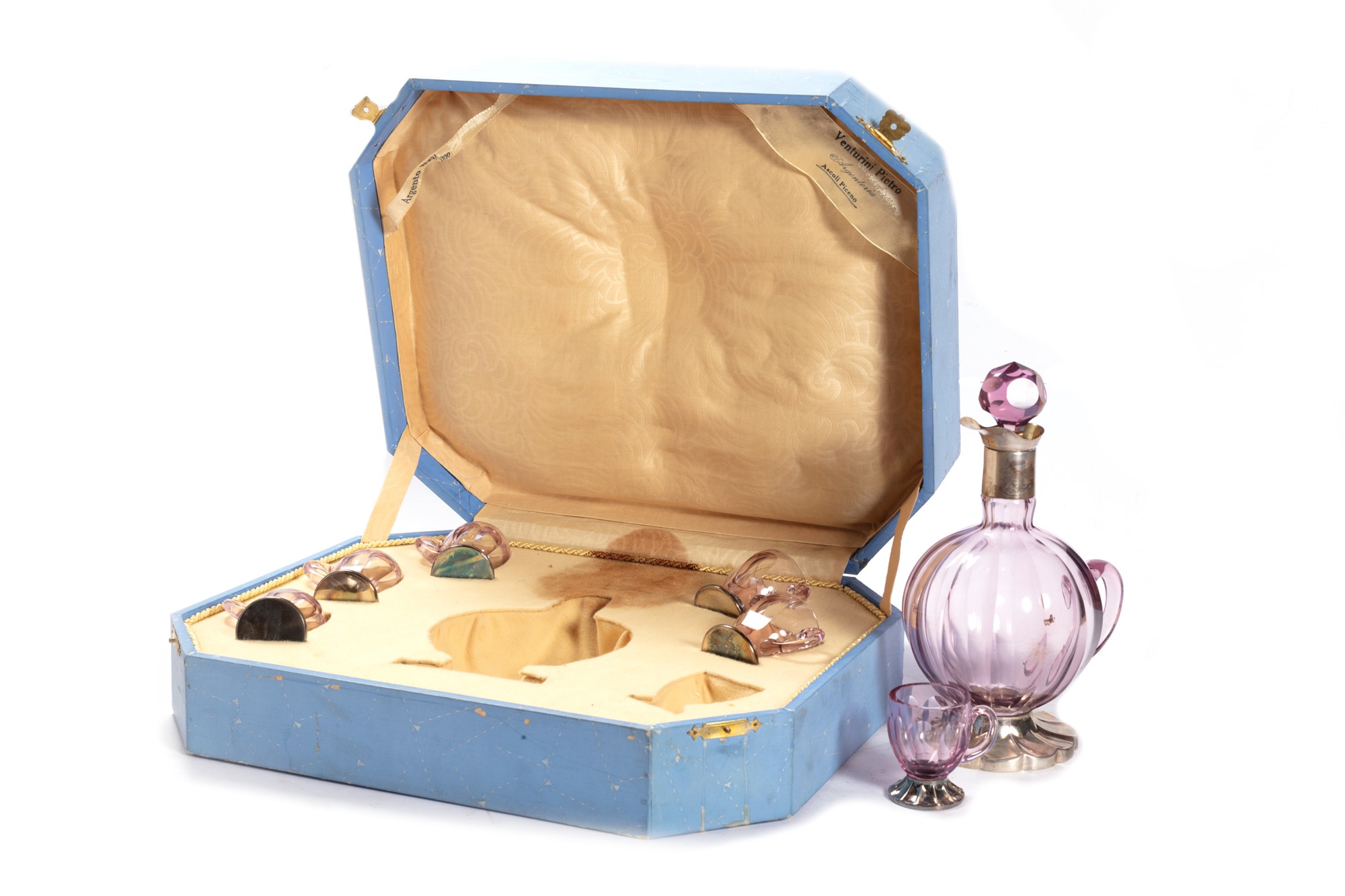 Servizio in vetro composto da sei tazzine e una caraffa, con scatola