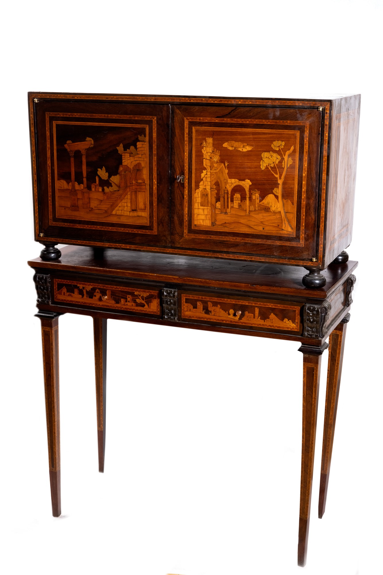 Stipo monetiere in legno finemente intarsiato con paesaggi e architetture, Italia centrale secolo XVIII