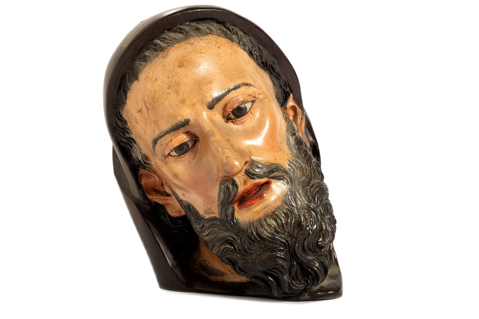Antica scultura in legno laccato raffigurante testa di frate