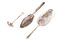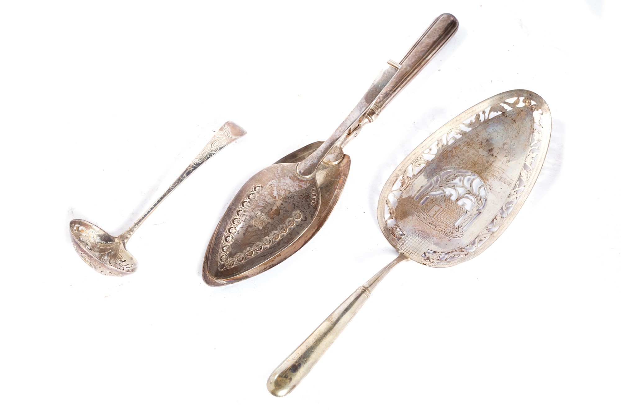 il mestolino traforato e inciso a motivi floreali e frutti, riporta punzoni Londra Giorgio III 1798; la pinza traforata incisa, riporta punzoni Londra Giorgio III 1798; la paletta traforata incisa con motivi a foglie, ripota punzone con data 1818