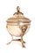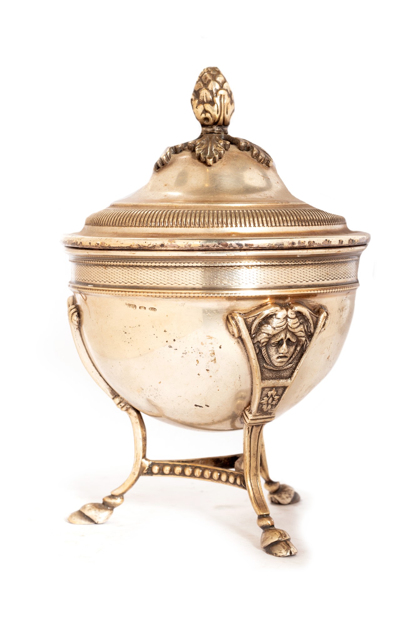 a tripode con piedi caprini, decorata con mascheroni e presa a pignaa tripode con piedi caprini, decorata con mascheroni e presa a pigna