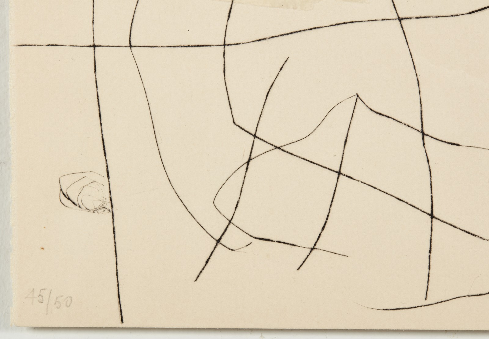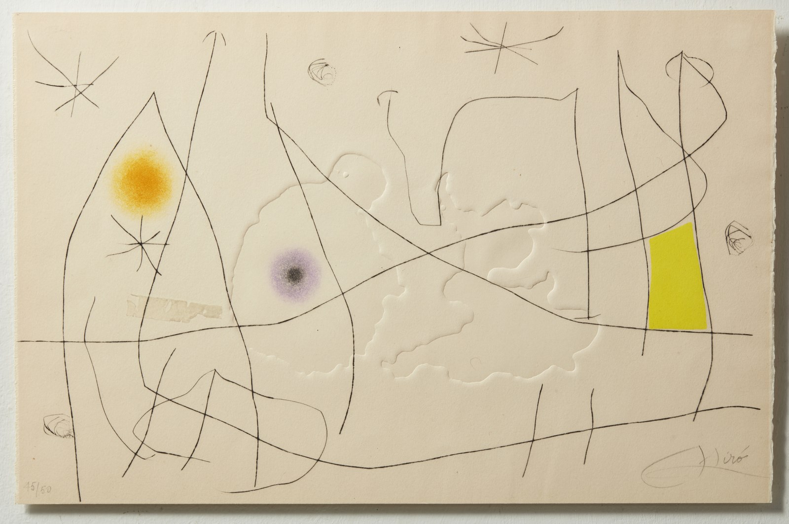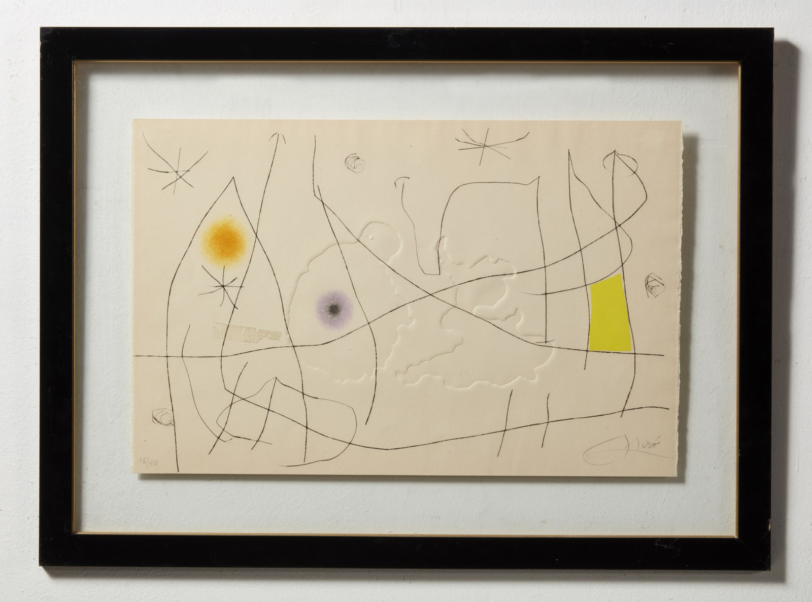 MIRO' JOAN (1893 - 1983) Dalla suite L'issue dérobée. 1974. Acquatinta e puntasecca. Cm 49,50 x 32,00. 42/50. Tiratura e firma in basso a matita. Grafica proveniente dal volume L'Issue Dérobée, Jacques Dupin, Editore Maeght, Parigi, 1974. Stampatore: Arte Adrien Maeght, Paris. Pubblicazione: Dupin, Jacques. Miró Engraver, vol. III 1973 - 1975, n.703. Cornice presente