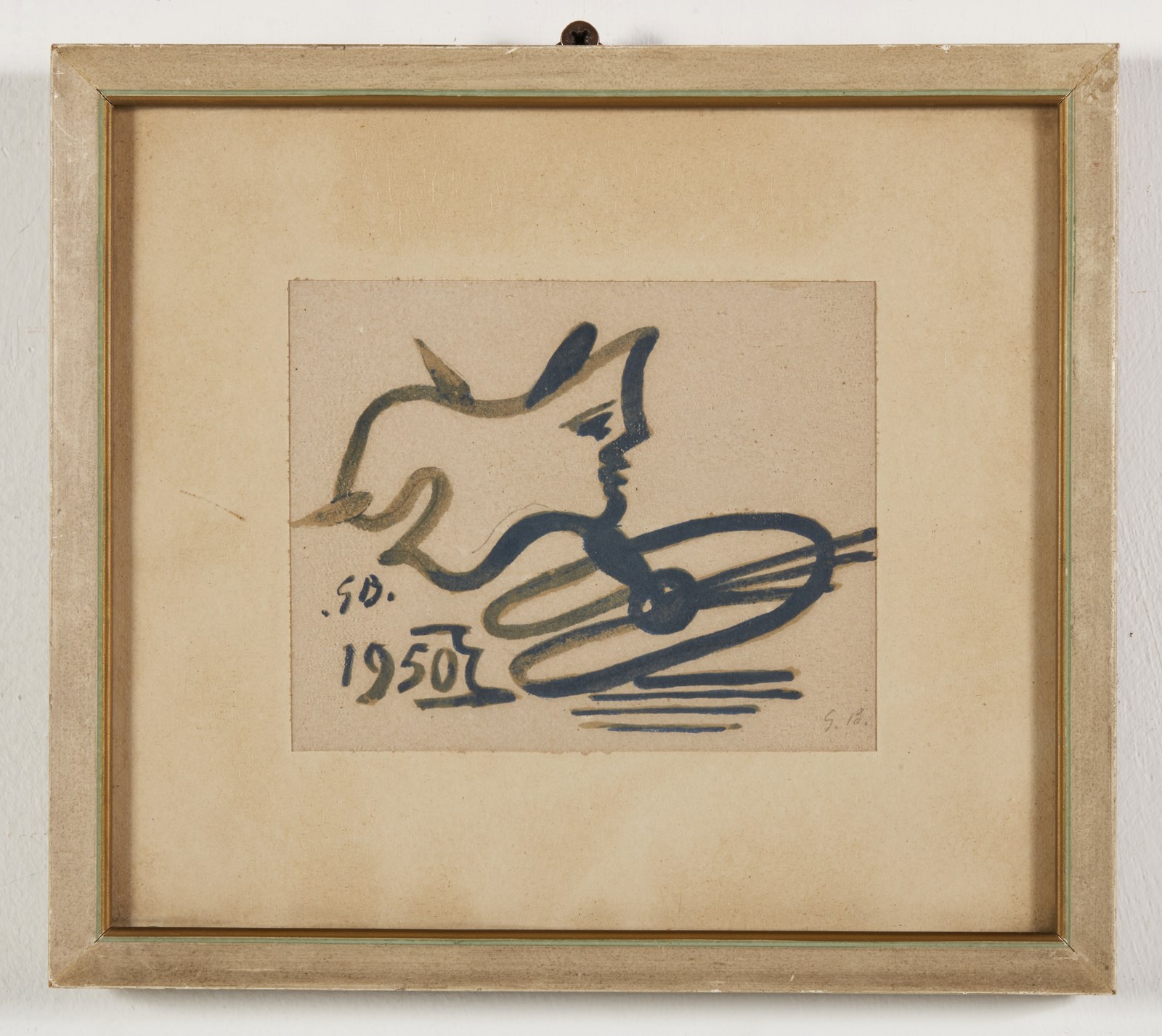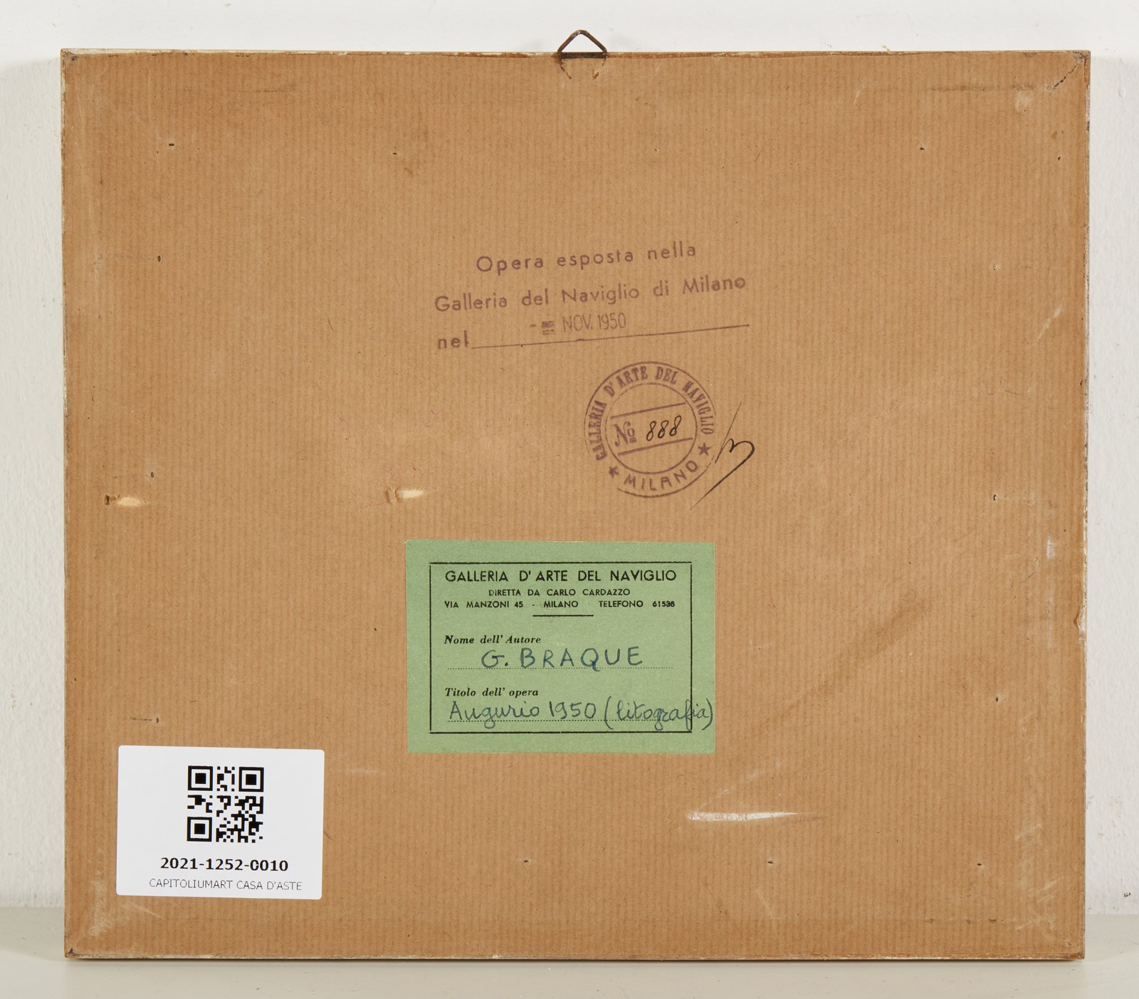 BRAQUE GEORGES (1882 - 1963) Augurio 1950. 1950. Litografia. Cm 14,50 x 12,00. Firma monogrammata in basso a destra. Al retro cartiglio descrittivo e timbro Galleria del Naviglio, Milano. Cornice presente
