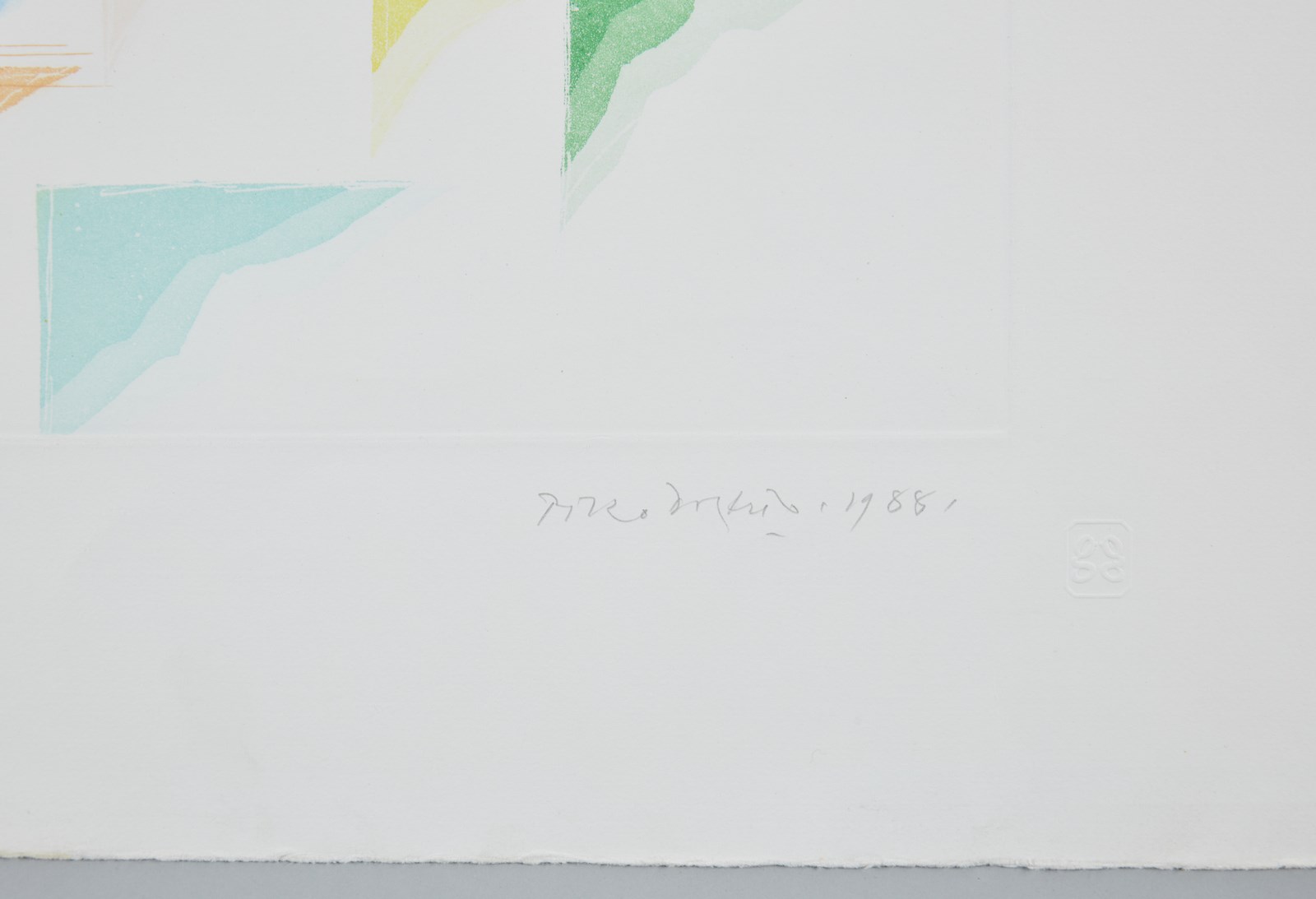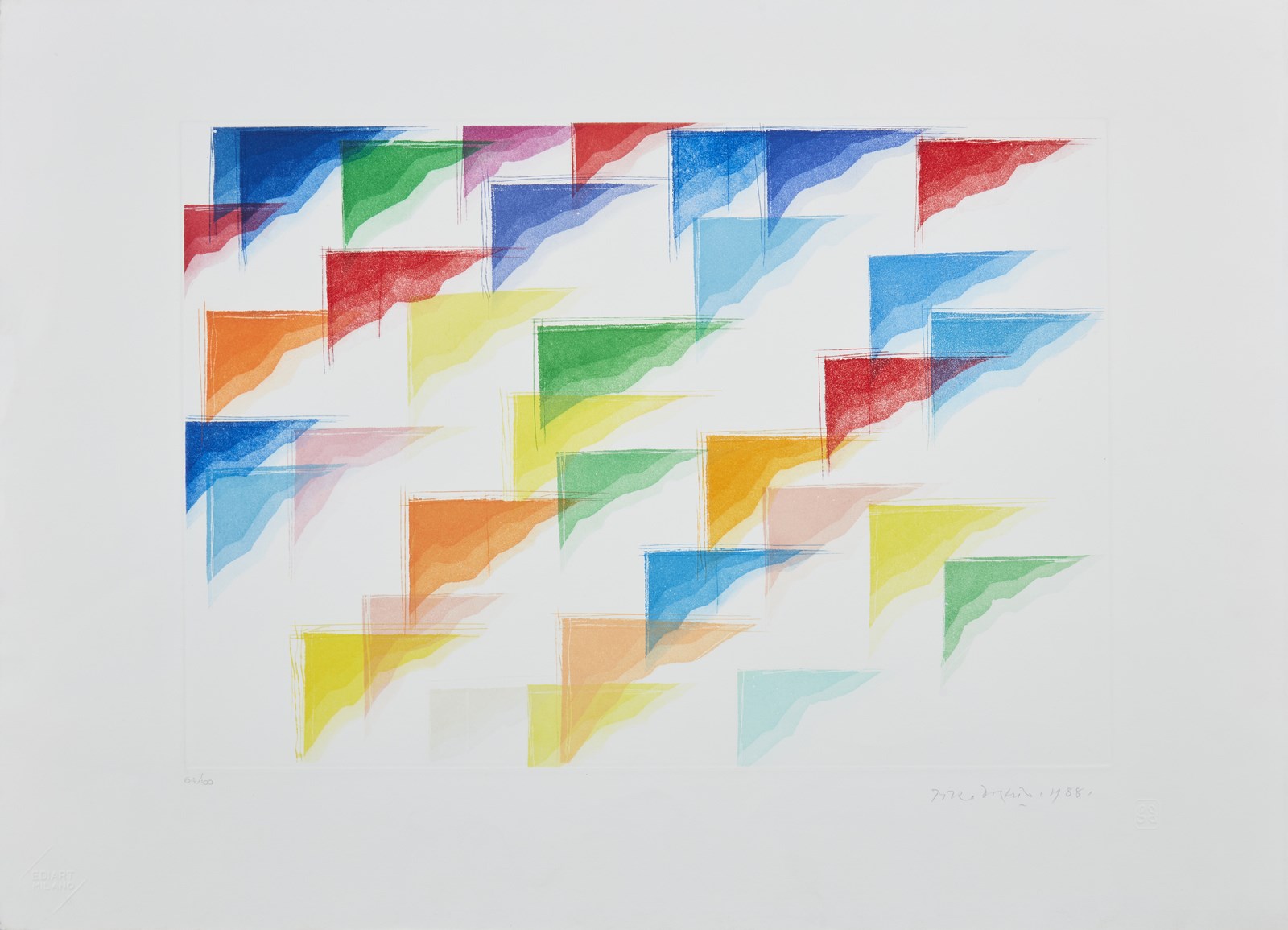 DORAZIO PIERO (1927 - 2005) Senza titolo. 1988. Acquaforte e acquatinta. Cm 70,00 x 50,00. 64/100. Tiratura a matita in basso a sinistra. Firma e anno a matita in basso a destra. Timbro a secco Ediart Milano. Difetti. Dimensione lastra: 34x49 cm.