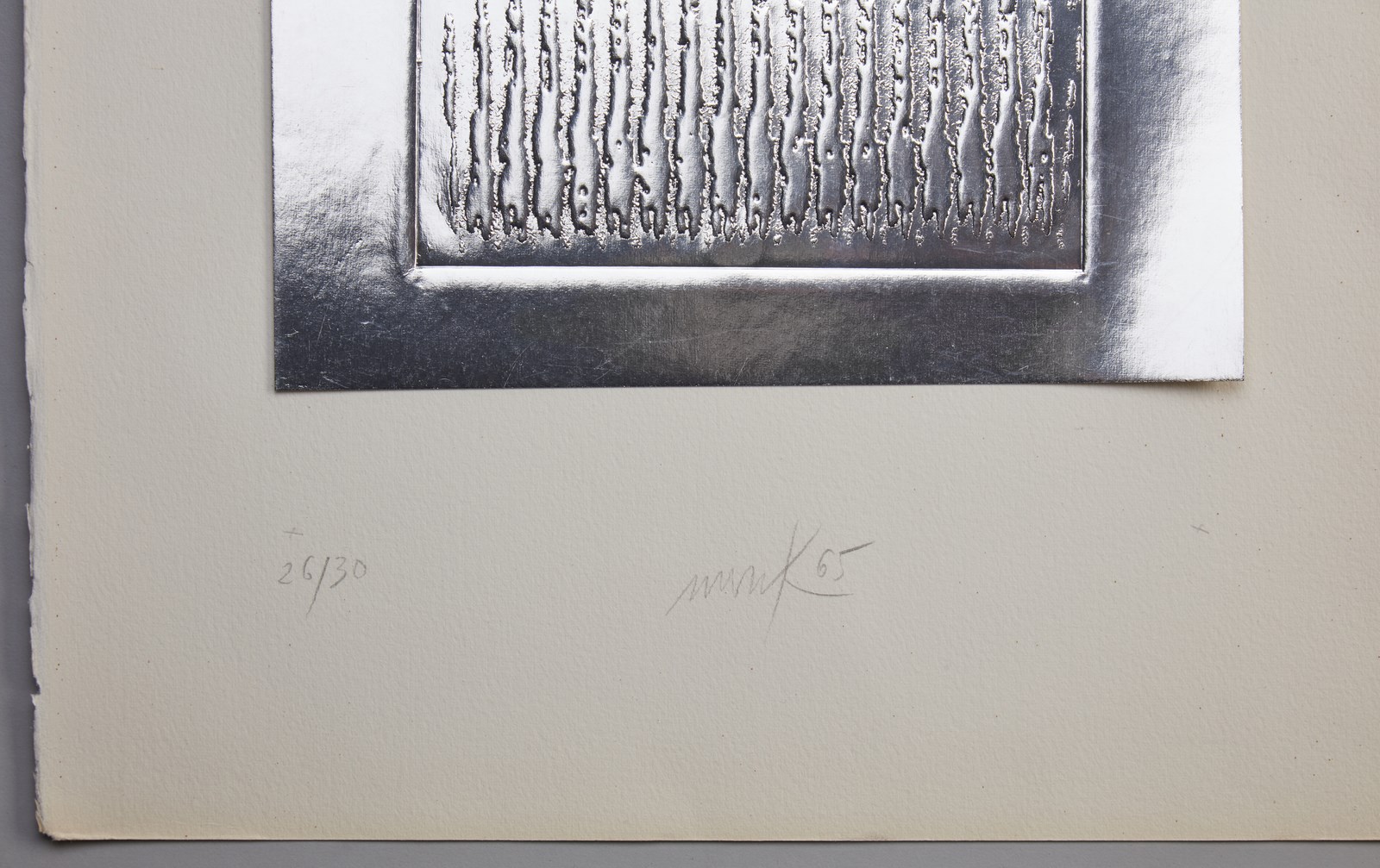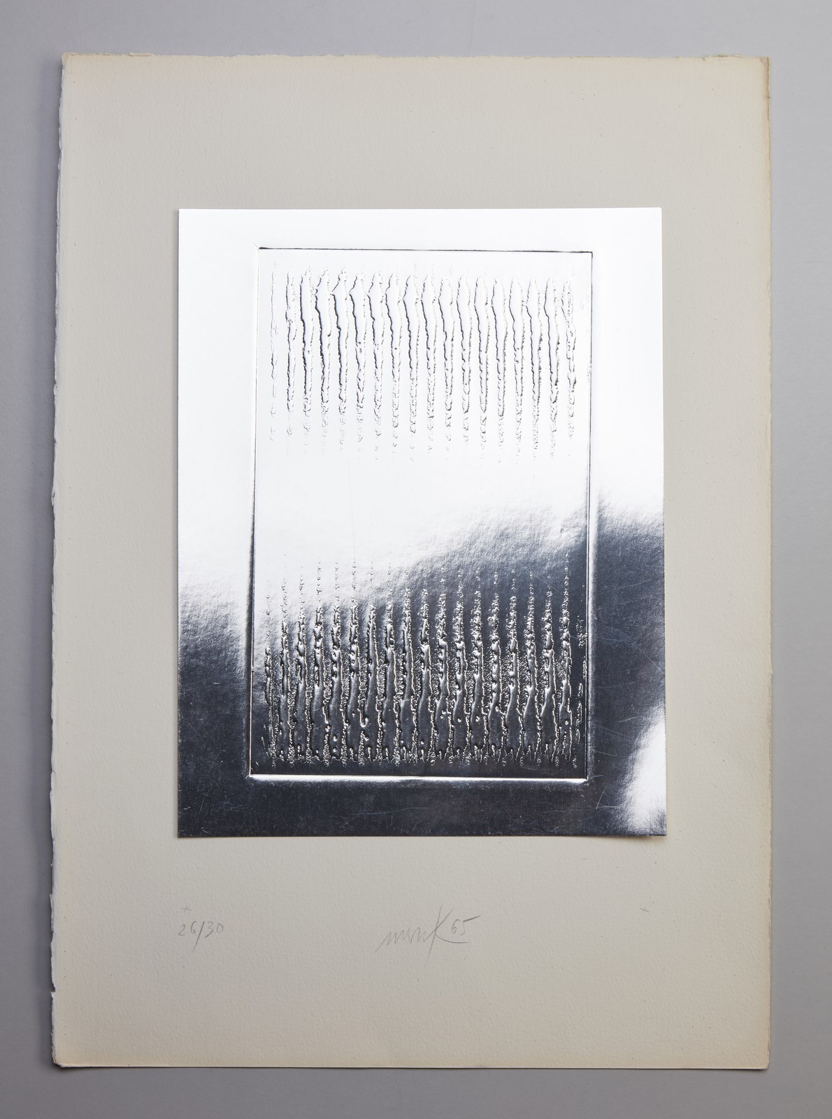 MACK HEINZ (n. 1939) Senza titolo. 1965. Incisione. Cm 35,00 x 50,00. 26/30. Tiratura, firma e anno in basso a matita. Dimensione lastra: 26.5x16.5 cm Provenienza: Collezione Lana, Milano. Edizioni La Quercia, Milano.