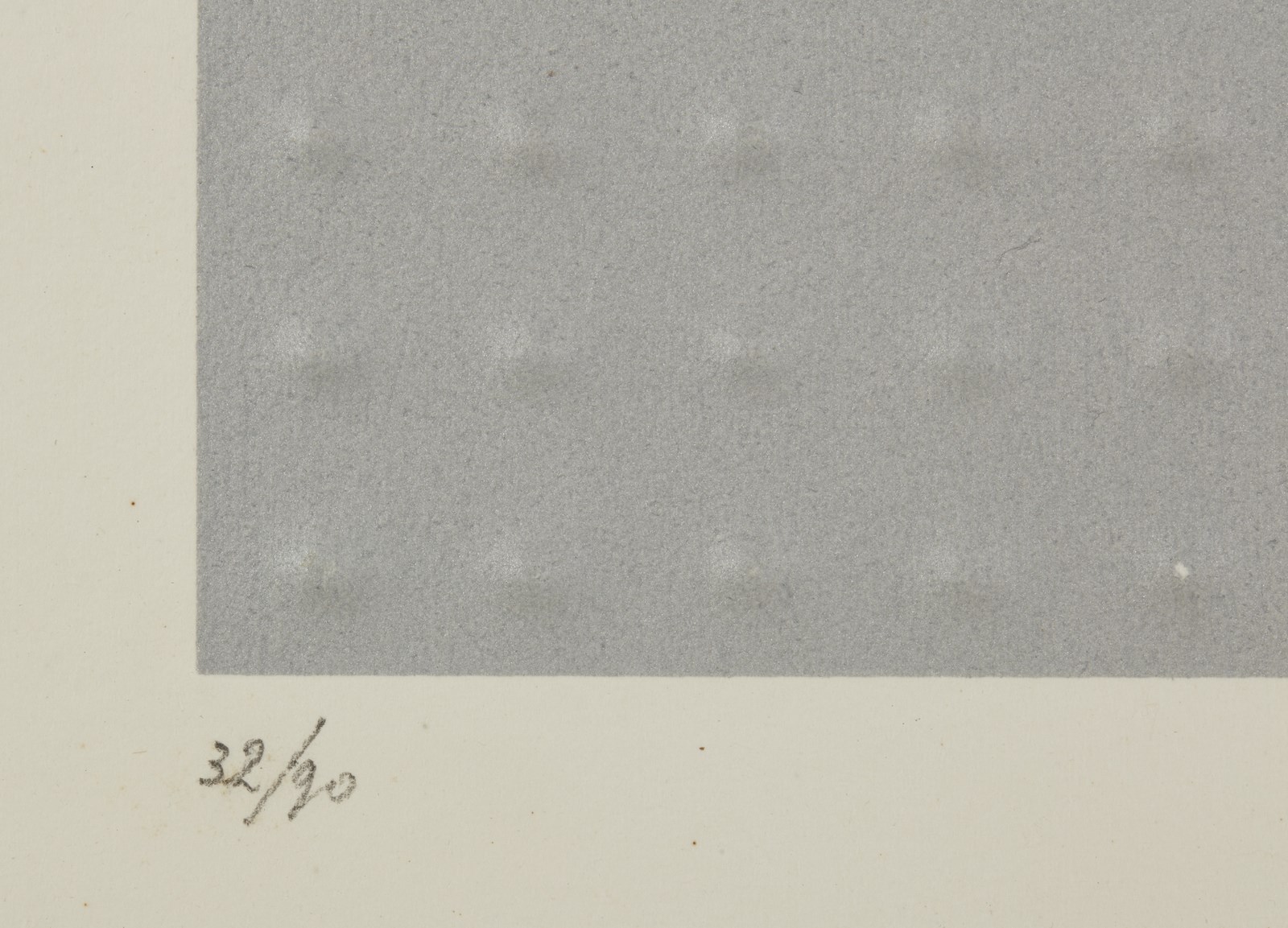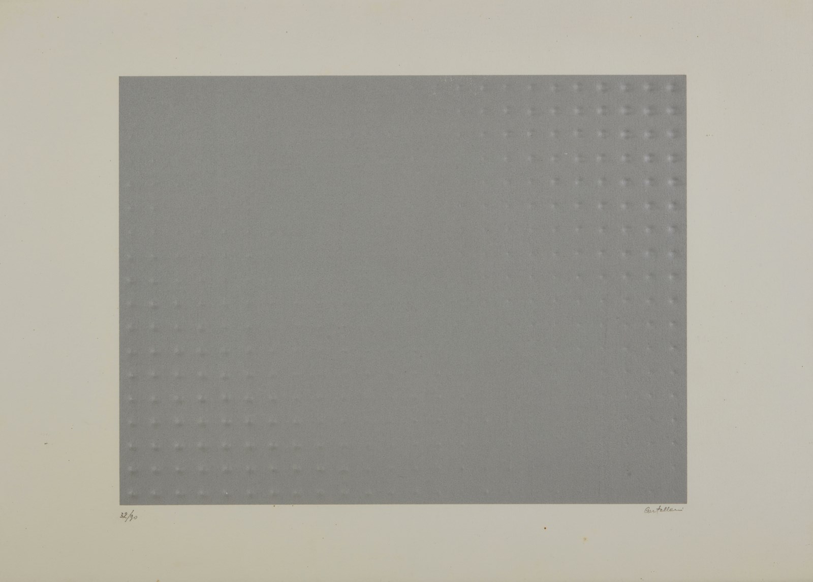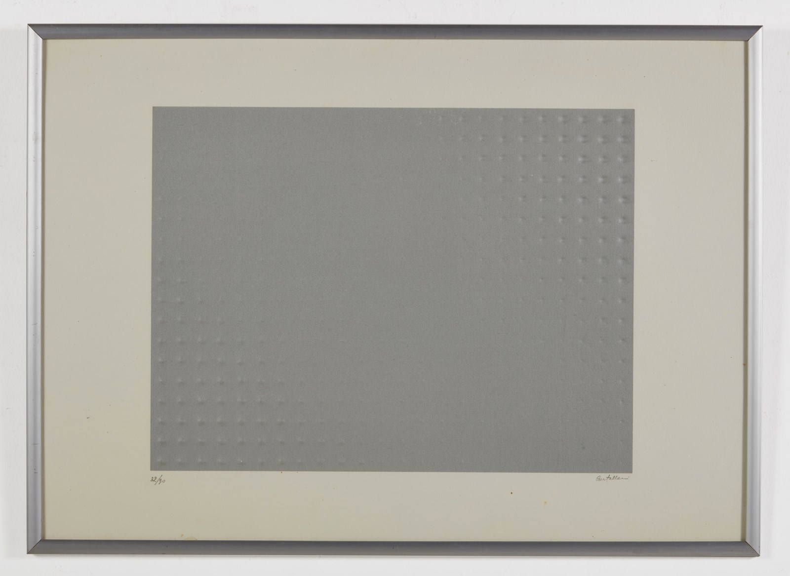 CASTELLANI ENRICO (1930 - 2017) Rilievo Argento. 1974. Litografia e rilievo a secco. Cm 77,00 x 56,00. 32/90. Tiratura e firma in basso a matita. Carta Fabriano. Edizioni Ariete, Milano. Edizione totale: 90 esemplari + 10 p.d.a. Pubblicazione: L.Magini, Enrico Castellani opera grafica 1960 - 1995, ed. Corraini, Mantova 1996 ripr.b/n nn. 16-20. Cornice presente