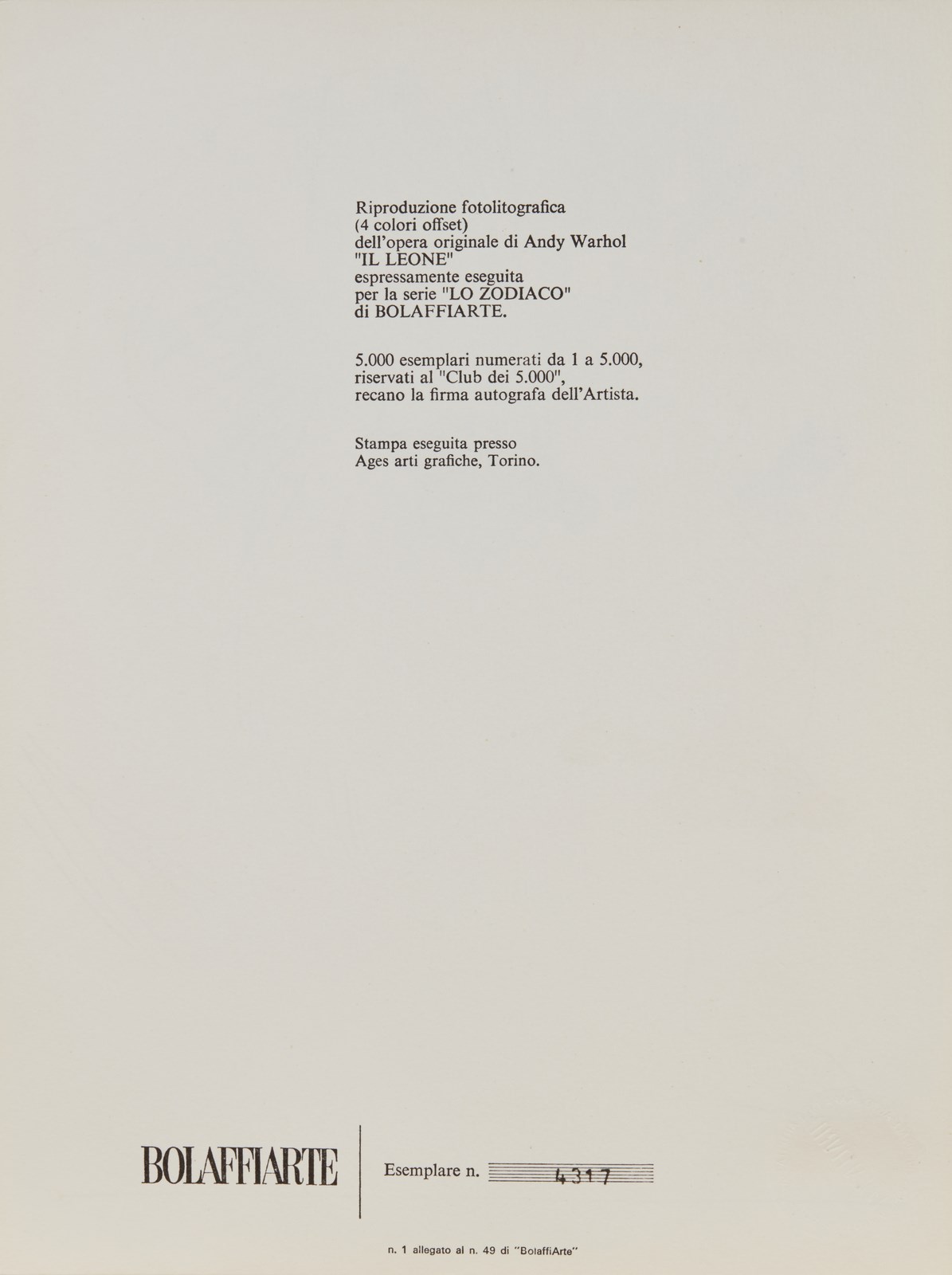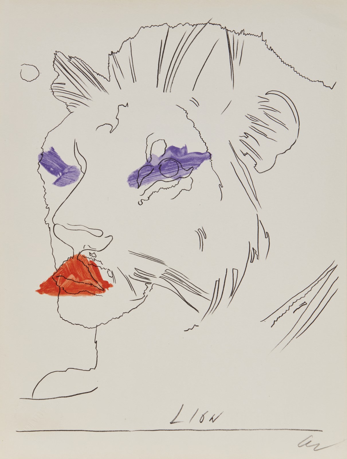 WARHOL ANDY (1928 - 1987) Dalla serie Lo Zodiaco: Il Leone. Serigrafia. Cm 20,00 x 28,00. 4317/5000. Firma in basso a destra, Timbro a secco Bolaffi Arte in basso a sinistra. Edizione totale 5000 esemplari realizzati per il Club dei 5000. Stampatore: Ages Arti grafiche, Torino. . Cornice presente