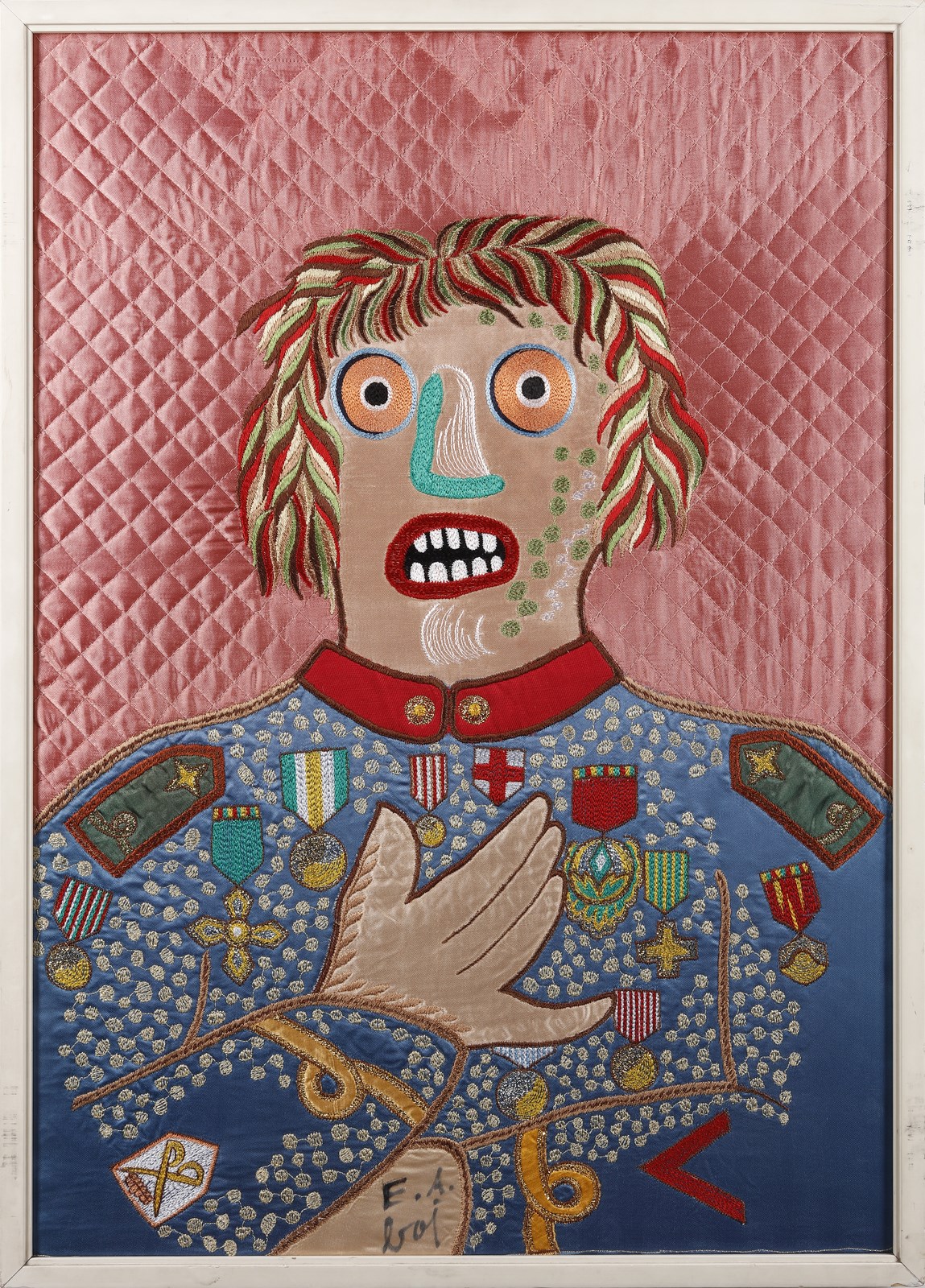 BAJ ENRICO (1924 - 2003) Generale. 1976. Raso trapuntato, collage e ricami su cartone. Cm 50,00 x 70,00. E.a. Tiratura e firma in basso al centro. Autentica dell'artista su fotografia. Esposizione: Cross-roads. Incroci a cura di Achille Bonito Oliva, Palazzo Colonna, 2001. Provenienza: Collezione privata; Gallarate; Cambi, 2018; Collezione privata, Lecce. . Cornice presente