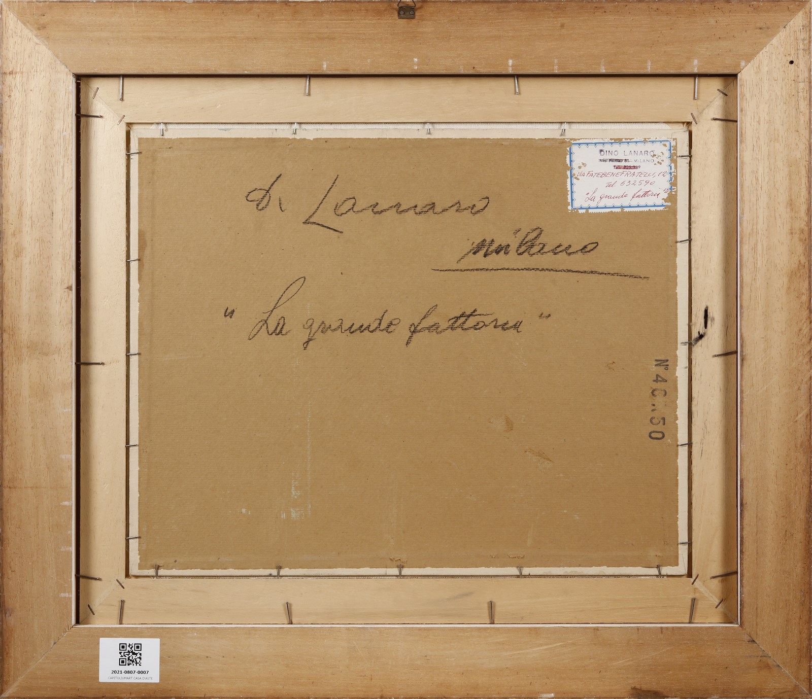 LANARO DINO (1908 - 1998) La grande fattoria. Olio su cartone intelato. Cm 50,00 x 40,00. Firma in basso a sinistra. Al retro titolo, firma e cartiglio dell'artista. Cornice presente