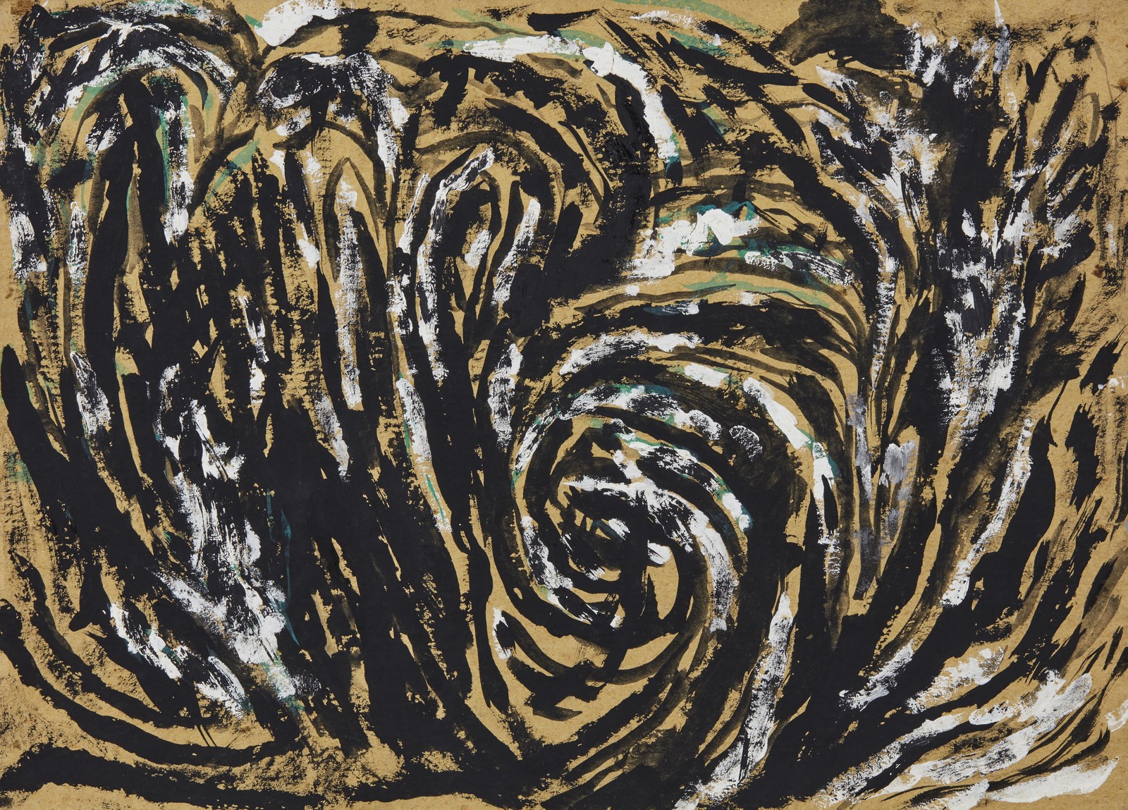 CINGOLANI MARCO (n. 1961) Giù nel bosco. 1982. Tecnica mista su carta. Cm 43,50 x 31,00. Al retro titolo, firma e anno. Lievi difetti.