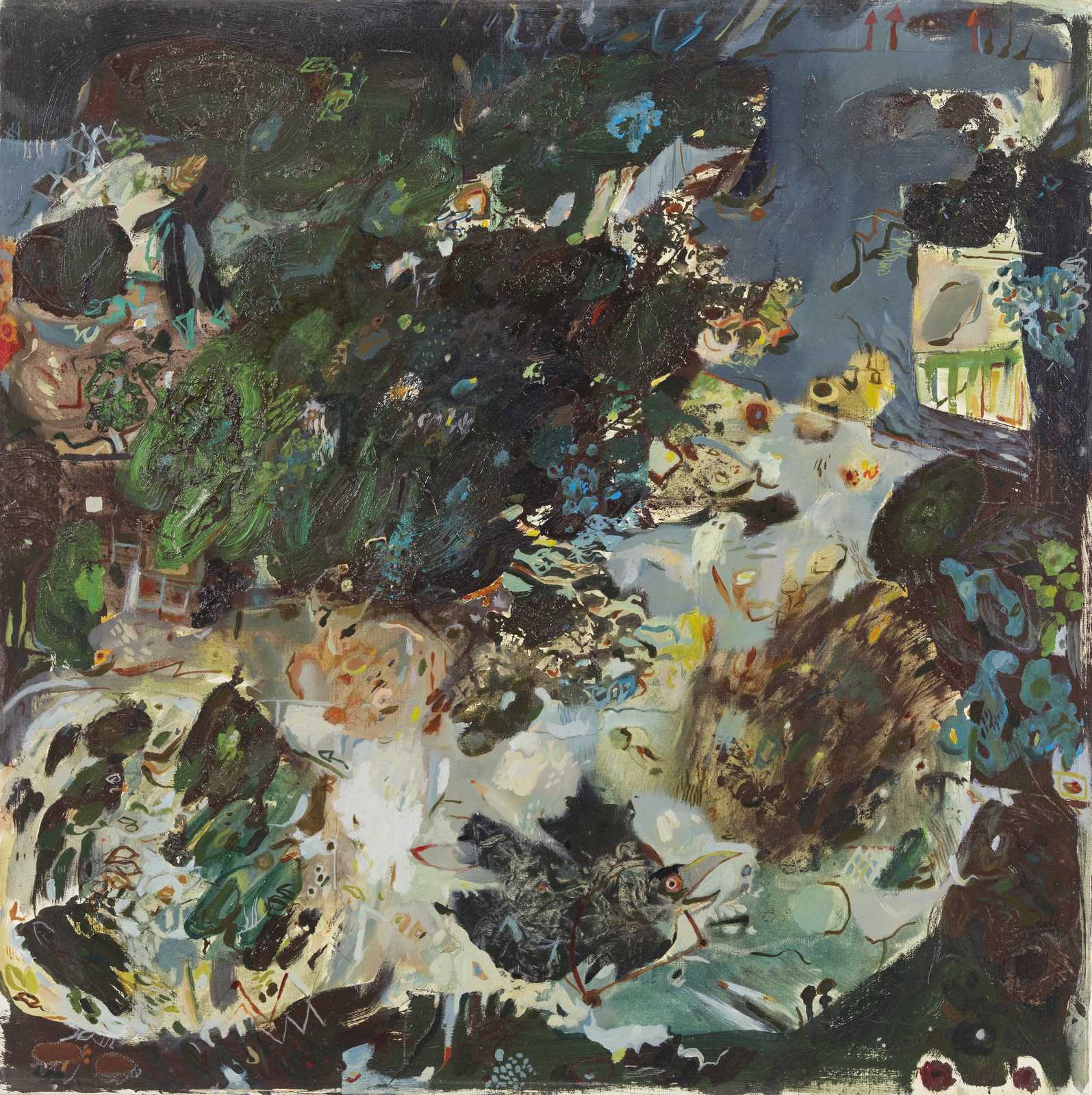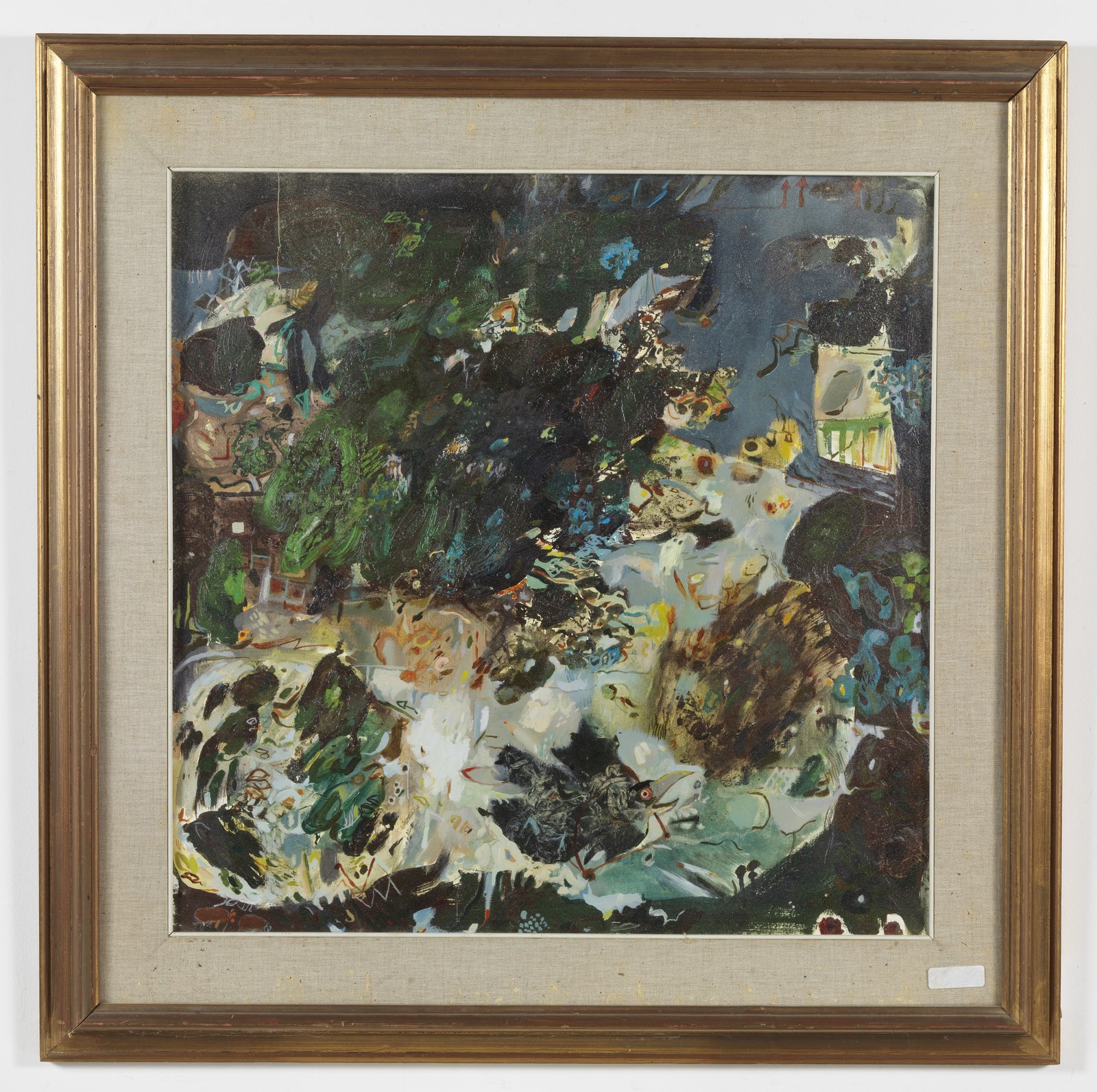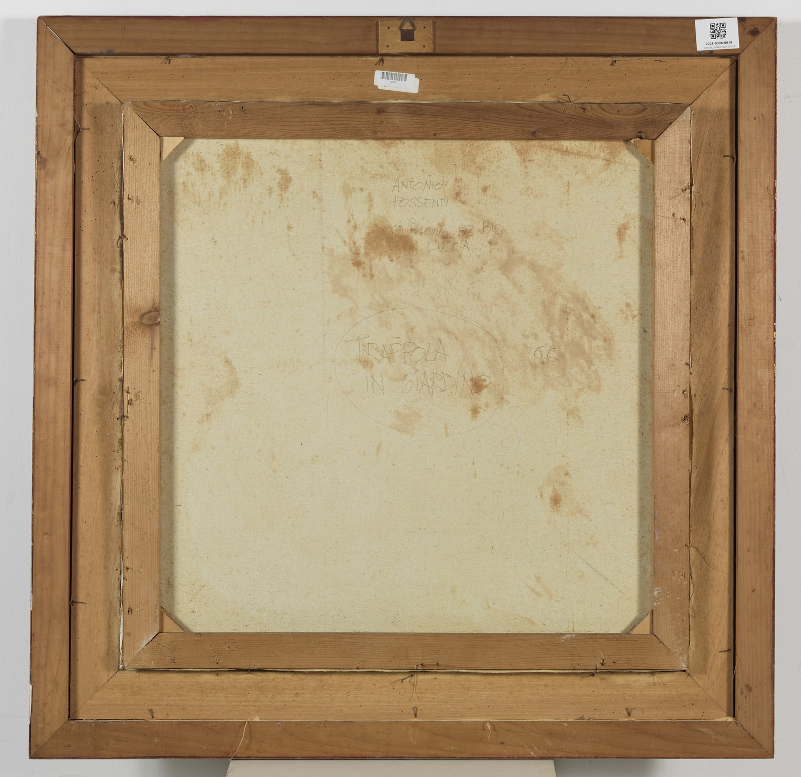 POSSENTI ANTONIO (n. 1933) Trappola in giardino. 1966. Olio su tela . Cm 70,00 x 70,00. Al retro titolo, firma e anno. Certificato di provenienza Fabiani Arte, Montecatini Terme. Difetti. Cornice presente