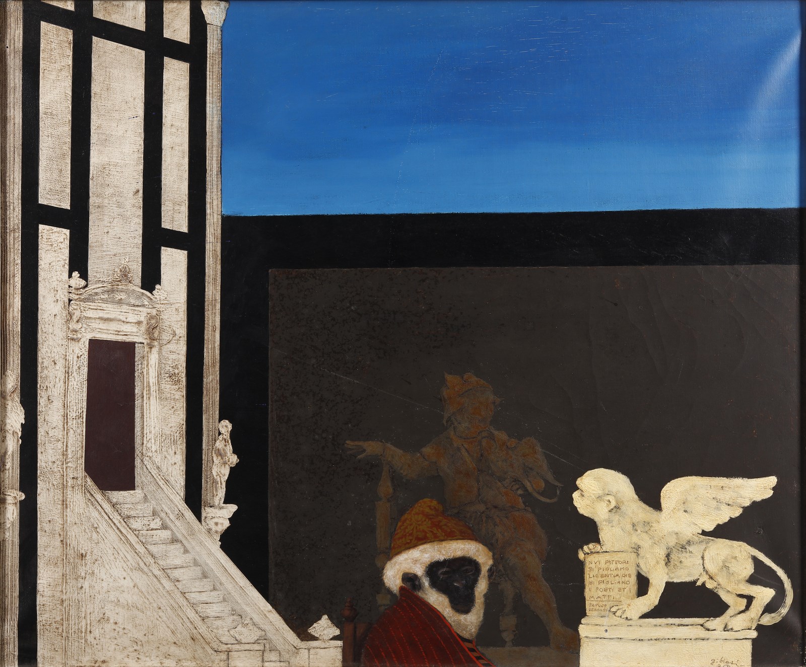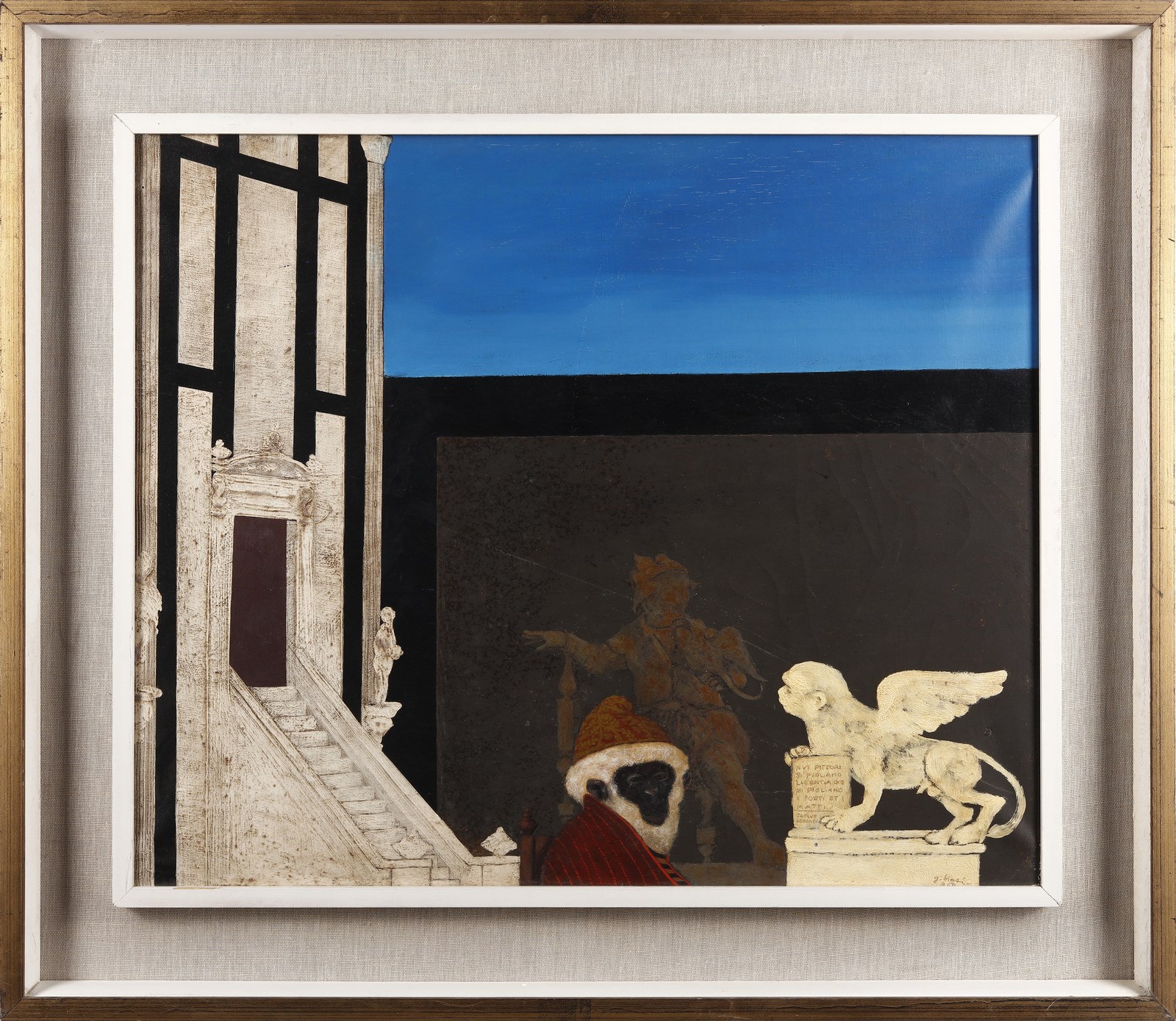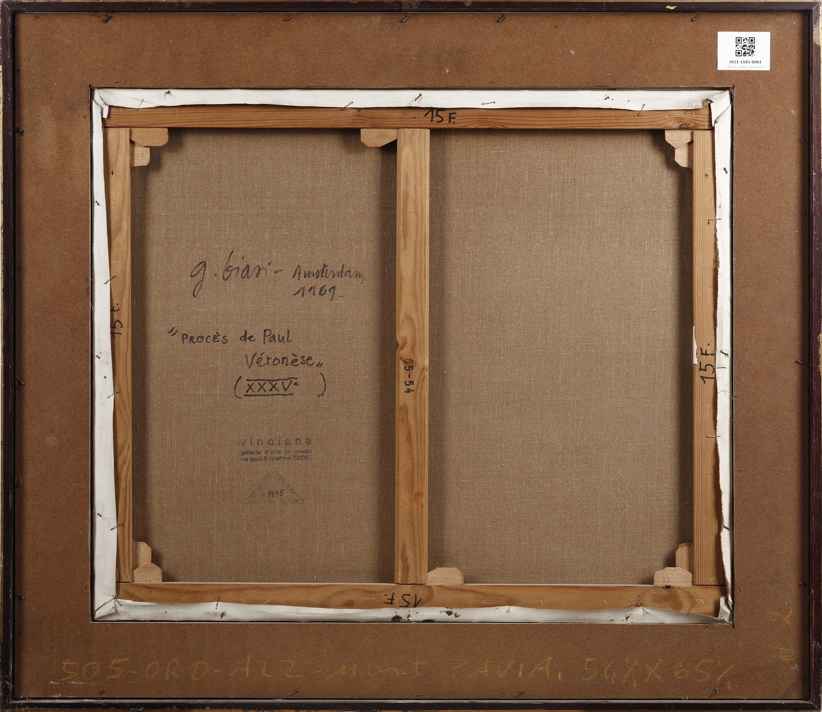 BIASI GUIDO (1933 - 1982) Proces de Paul Veronese. 1969. Olio su tela . Cm 65,00 x 54,00. Al retro titolo, firma, anno e timbro della Galleria Vinciana. Cornice presente