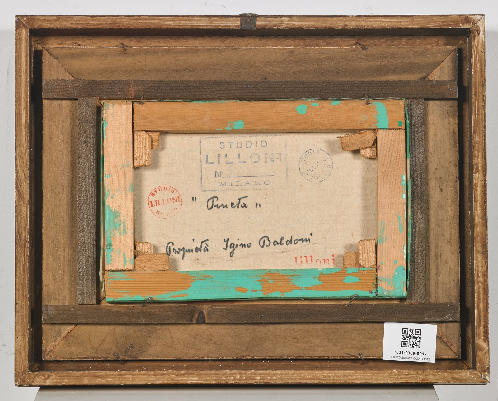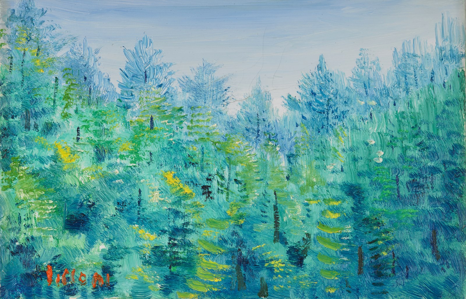 LILLONI UMBERTO (1898 - 1980) Pineta. Olio su tela . Cm 30,00 x 20,00. Firma in basso a sinistra. Al retro titolo e timbri Studio Lilloni, Milano. Provenienza: Collezione Baldoni. Lievi difetti. Cornice presente
