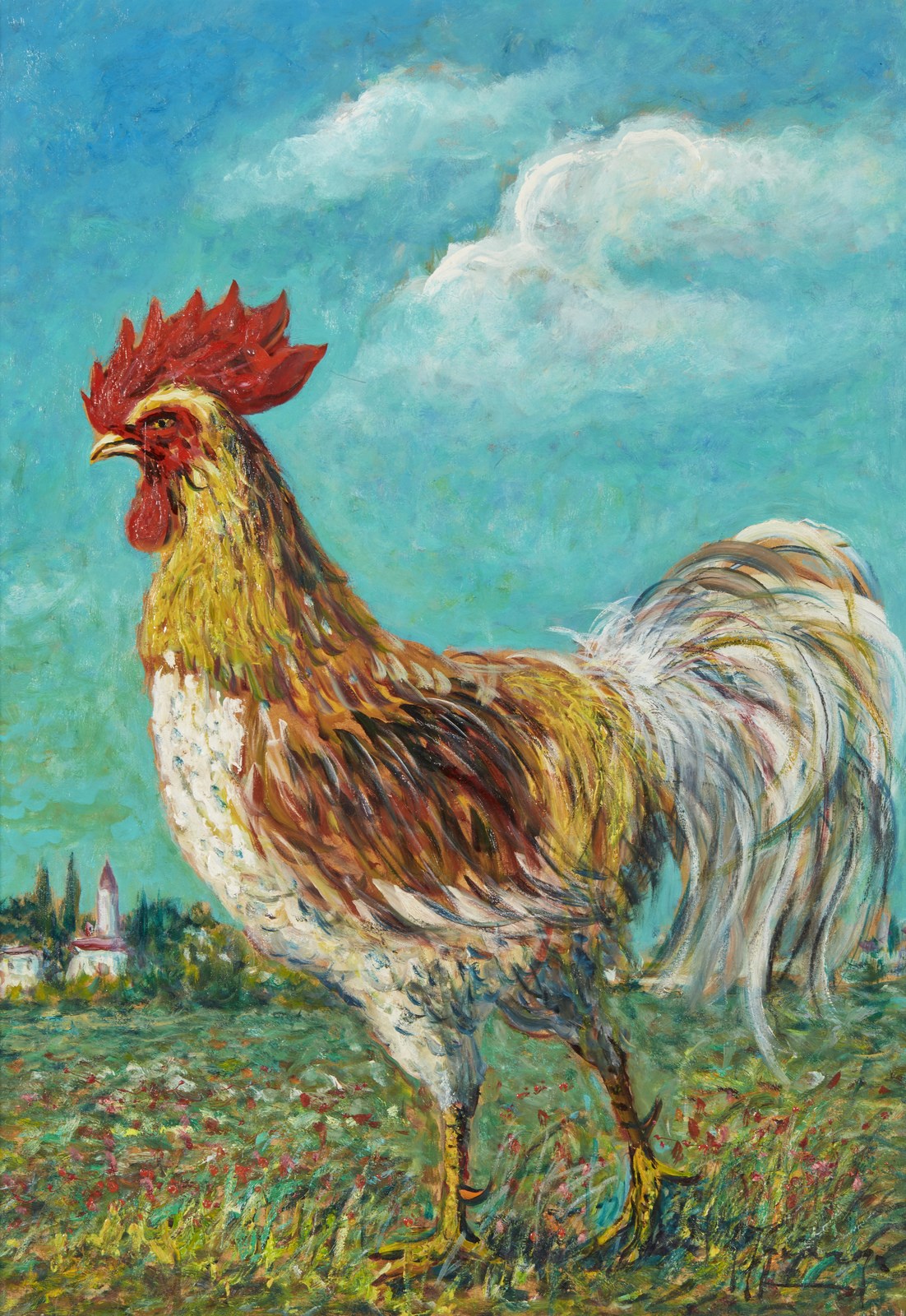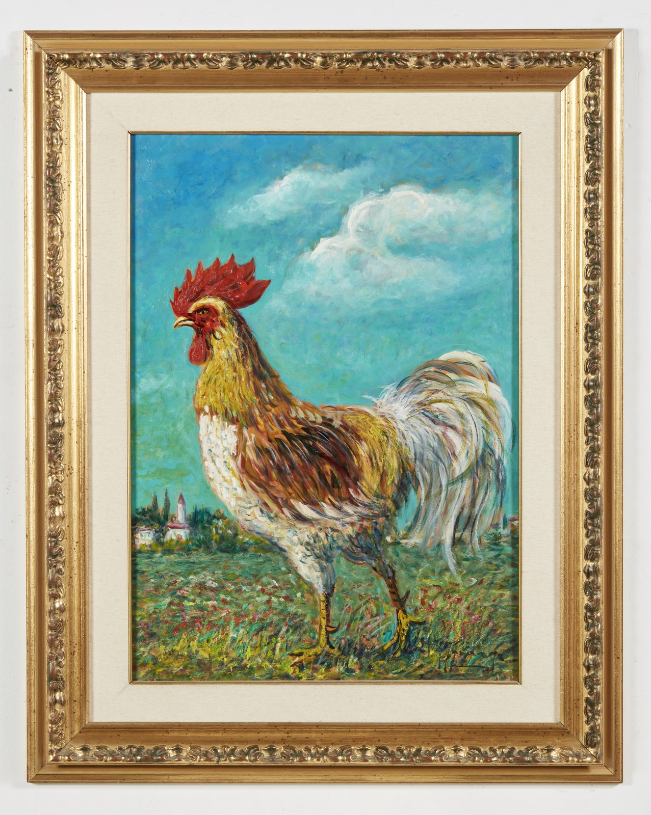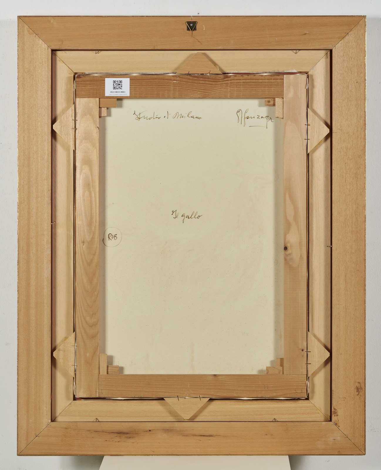 GONZAGA GIOVAN FRANCESCO (1921 - 2007) Il gallo. Olio su tela . Cm 50,00 x 70,00. Firma in basso a destra. Al retro titolo e firma. Autentica dell'artista su fotografia. Cornice presente