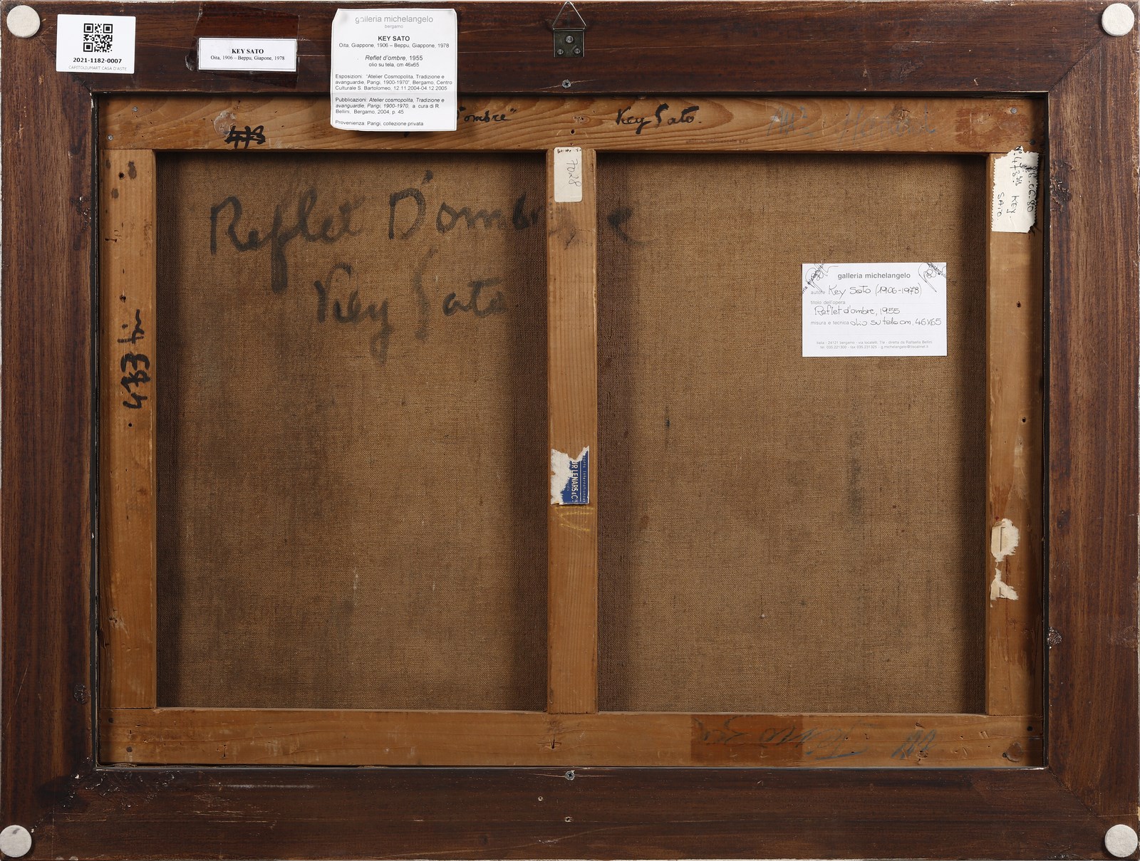 SATO KEY (1906 - 1978) Reflet d'ombre. 1955. Olio su tela . Cm 65,00 x 46,00. Firma e anno in basso a destra. Al retro titolo, firma e cartiglio descrittivo Galleria Michelangelo, Bergamo. Certificato di provenienza Galleria Michelangelo, Bergamo. Esposizone: Atelier Cosmopolita, tradizione e avanguardie, Parigi, 1900 -1970, Bergamo, 12 Novembre 2004 - 4 Dicembre 2005. Pubblicazione: Atelier Cosmopolita, tradizione e avanguardie, Parigi, 1900 -1970, a cura di R. Bellini, Bergamo, 2004, p 45. Cornice presente
