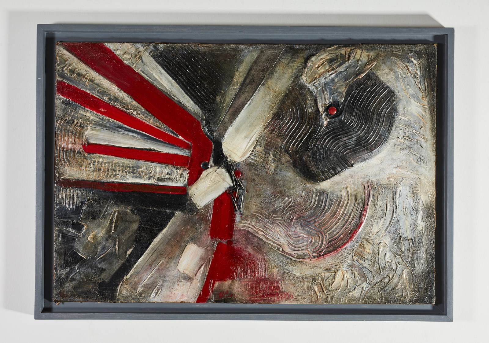 DEL PEZZO LUCIO (n. 1933) Senza titolo. 1958. Tecnica mista su tela. Cm 126,00 x 83,00. Firma e anno in basso al centro. Lievi difetti. Cornice presente