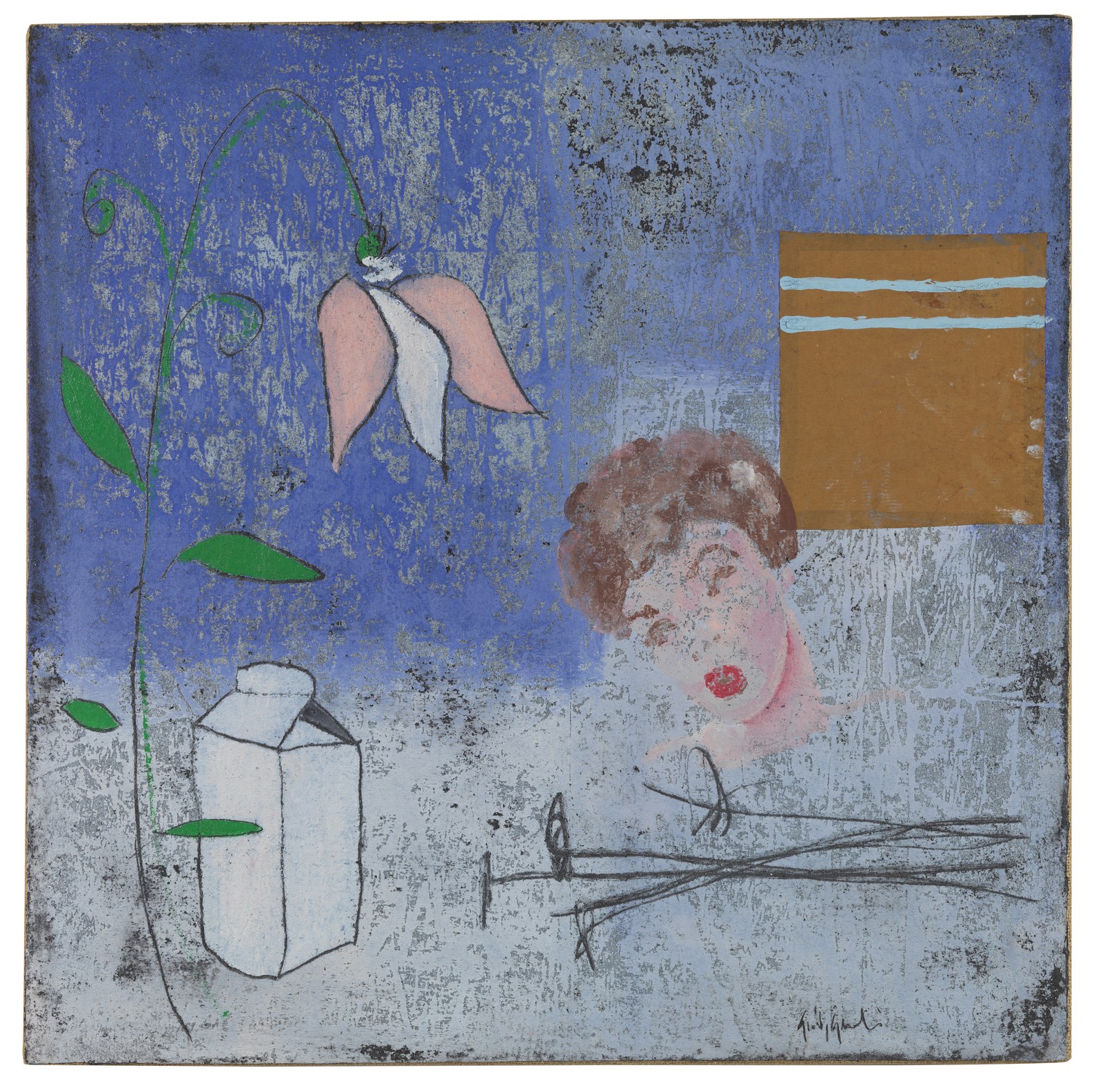GIOVAGNOLI LUCA (n. 1963) Indossava una veste bianca. 2003. Tecnica mista su tela. Cm 70,00 x 70,00. Firma in basso a destra. Al retro titolo, firma e anno.