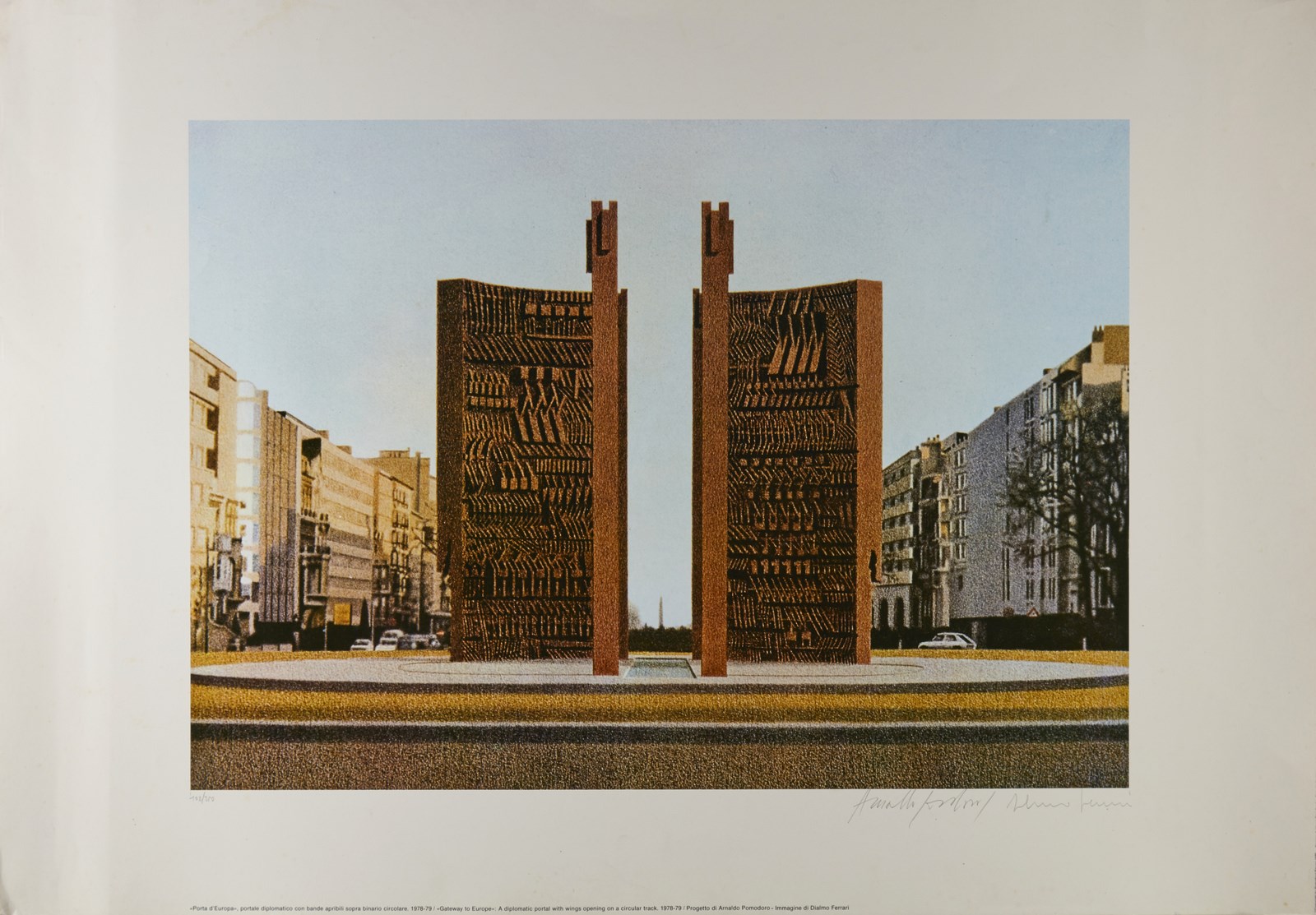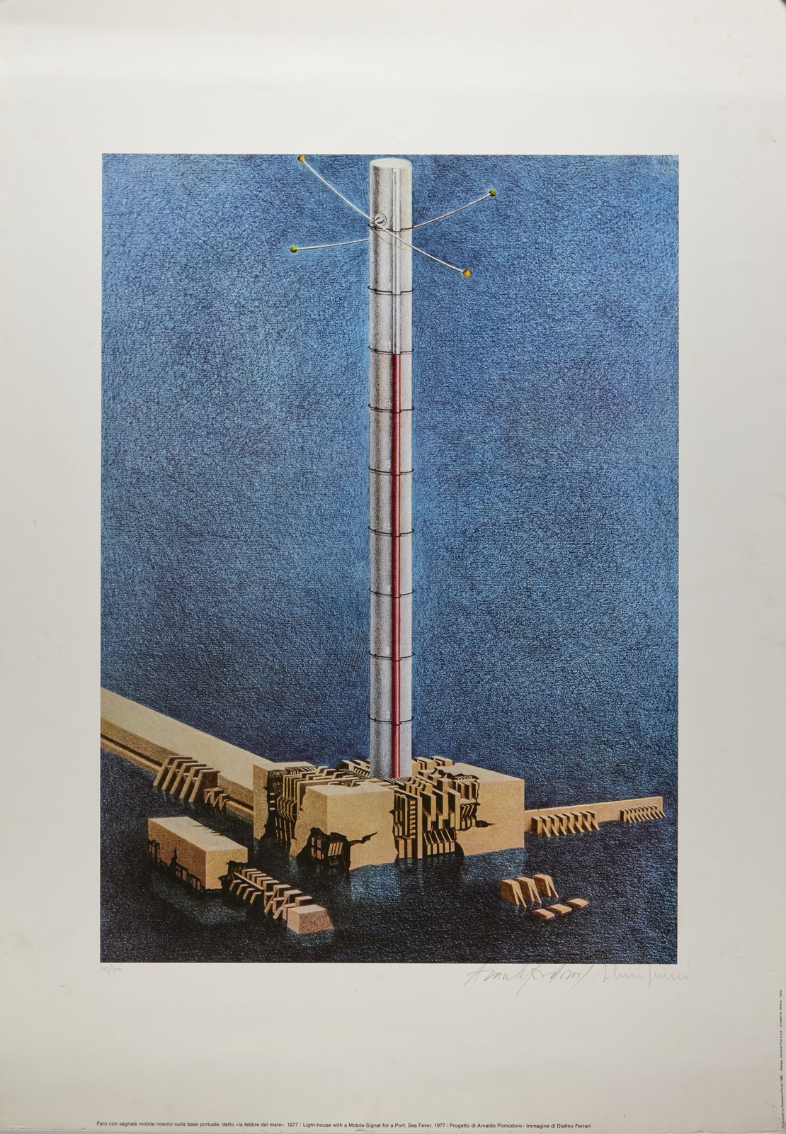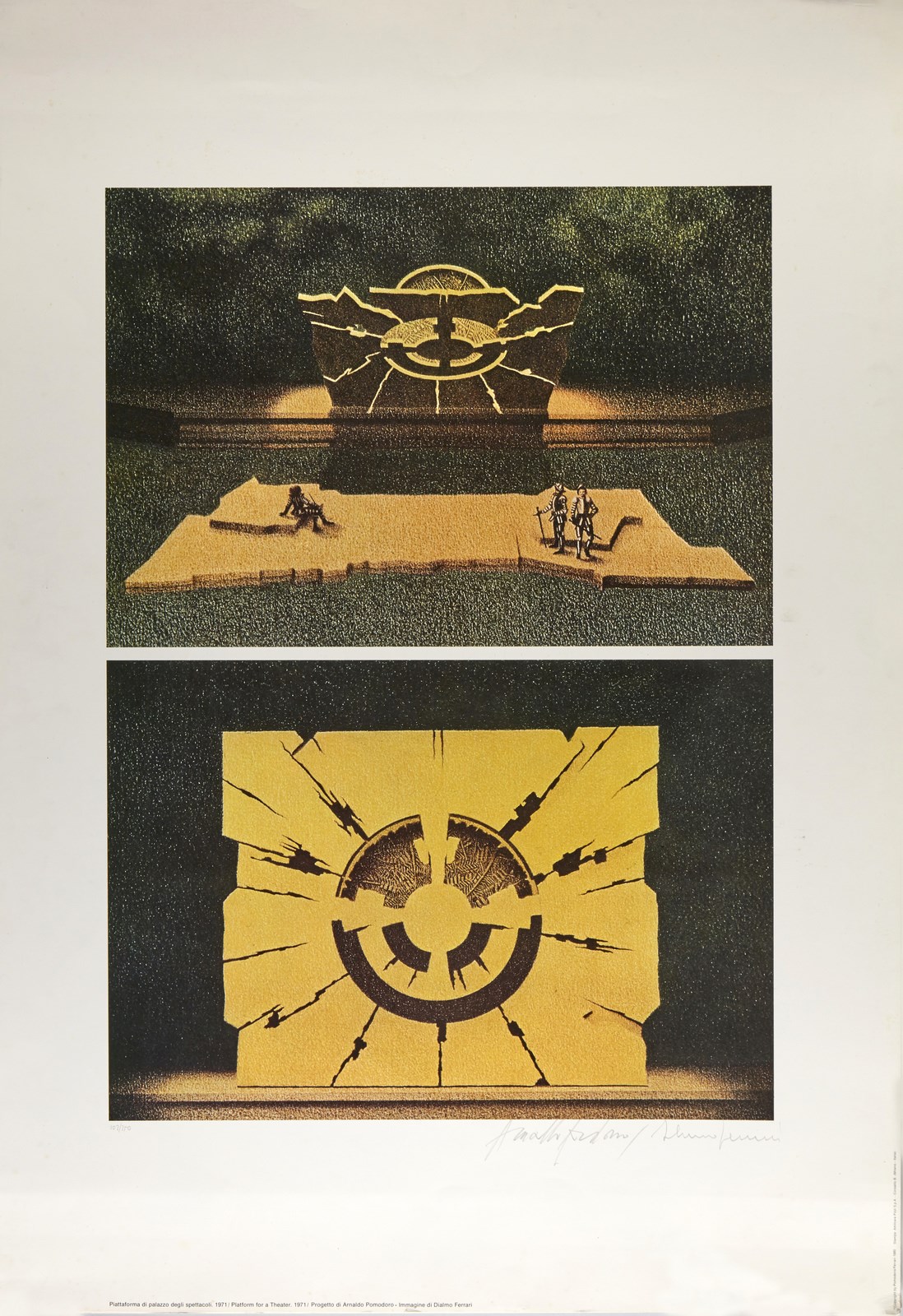 FERRARI DI ALMO & POMODORO ARNALDO Lotto composto da n. 6 fogli. 1980. Poster. Cm 69,00 x 99,00. 102/250. Cartella non completa. Ogni foglio presenta tiratura e firma in basso a matita. Palazzo degli spettacoli, 1971; La febbre del mare 1977; Pietrarubbia paese 1975; Piattaforma di palazzo degli spettacoli 1971; Piattaforma di palazzo degli spettacoli con torri - gru e altri supporti 1971; Porta d'Europa. 1978-1979. Nel 1980, in occasione di una mostra alla Galleria Franca Mancini di Pesaro, intitolata “Le invenzioni di Arnaldo”, erano esposti diversi progetti di Arnaldo Pomodoro, fu prodotta un serie di 10 manifesti che riproducevano le 10 tavole ad essi relative, realizzate a cura di Dialmo Ferrari. Di tali manifesti, stampati in tiratura illimitata, solo 250 copie furono numerate e firmate da Arnaldo Pomodoro e Dialmo Ferrari e riunite in una cartella che conteneva i 10 soggetti. Difetti.