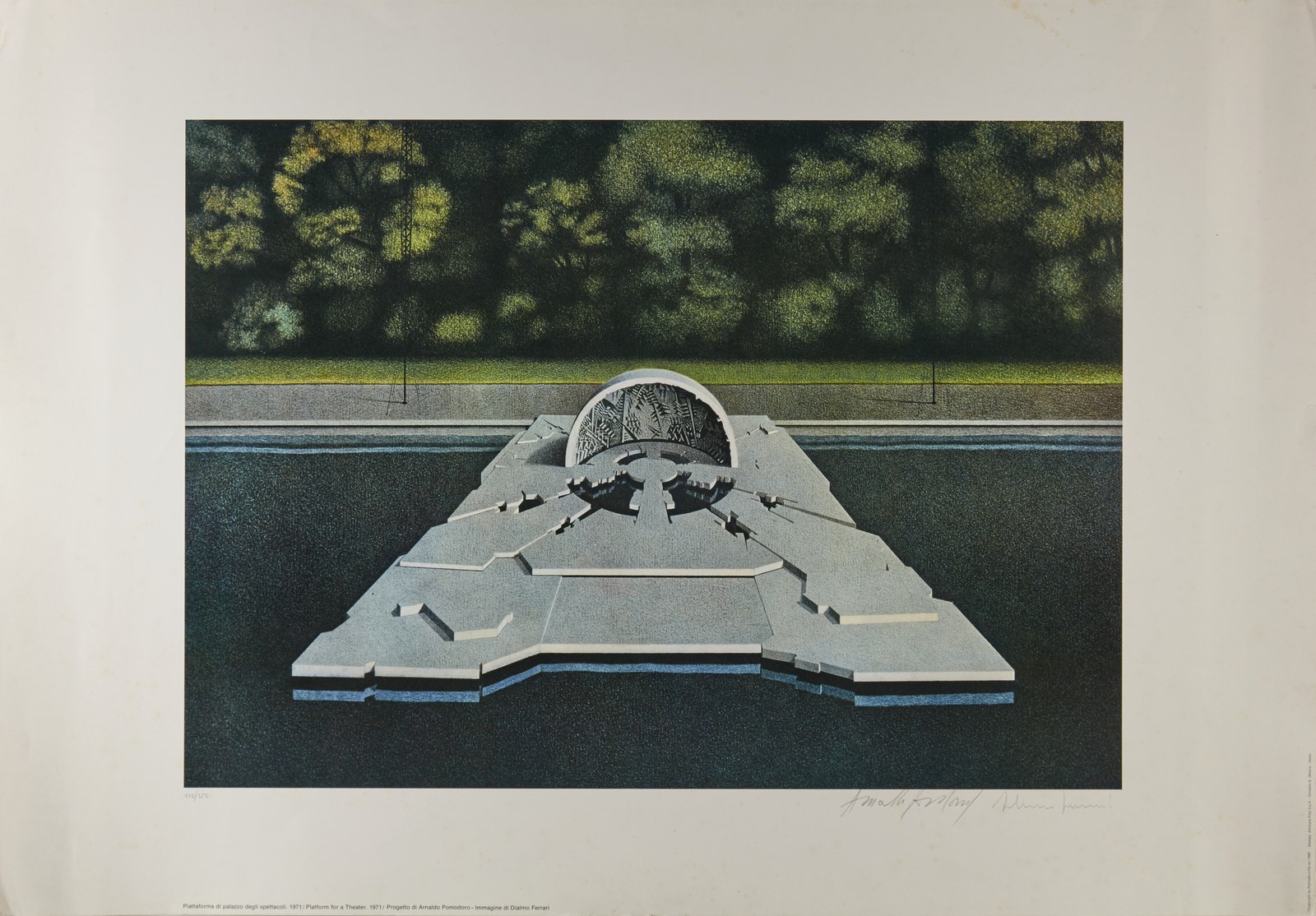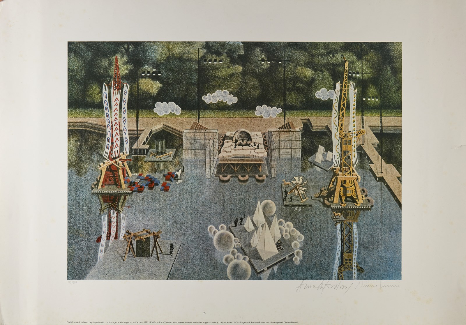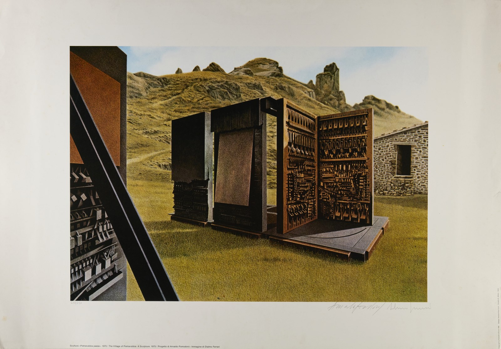 FERRARI DI ALMO & POMODORO ARNALDO Lotto composto da n. 6 fogli. 1980. Poster. Cm 69,00 x 99,00. 102/250. Cartella non completa. Ogni foglio presenta tiratura e firma in basso a matita. Palazzo degli spettacoli, 1971; La febbre del mare 1977; Pietrarubbia paese 1975; Piattaforma di palazzo degli spettacoli 1971; Piattaforma di palazzo degli spettacoli con torri - gru e altri supporti 1971; Porta d'Europa. 1978-1979. Nel 1980, in occasione di una mostra alla Galleria Franca Mancini di Pesaro, intitolata “Le invenzioni di Arnaldo”, erano esposti diversi progetti di Arnaldo Pomodoro, fu prodotta un serie di 10 manifesti che riproducevano le 10 tavole ad essi relative, realizzate a cura di Dialmo Ferrari. Di tali manifesti, stampati in tiratura illimitata, solo 250 copie furono numerate e firmate da Arnaldo Pomodoro e Dialmo Ferrari e riunite in una cartella che conteneva i 10 soggetti. Difetti.